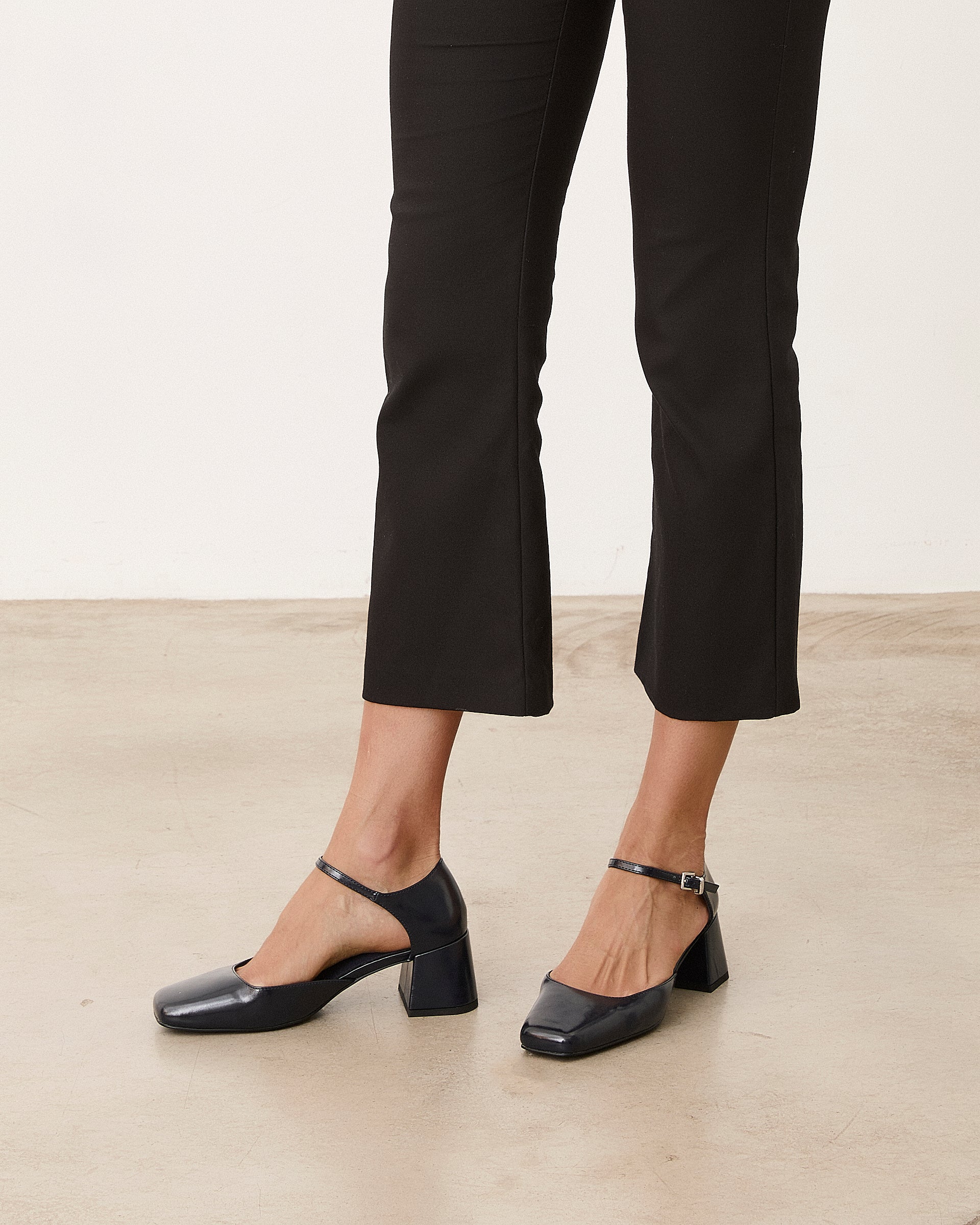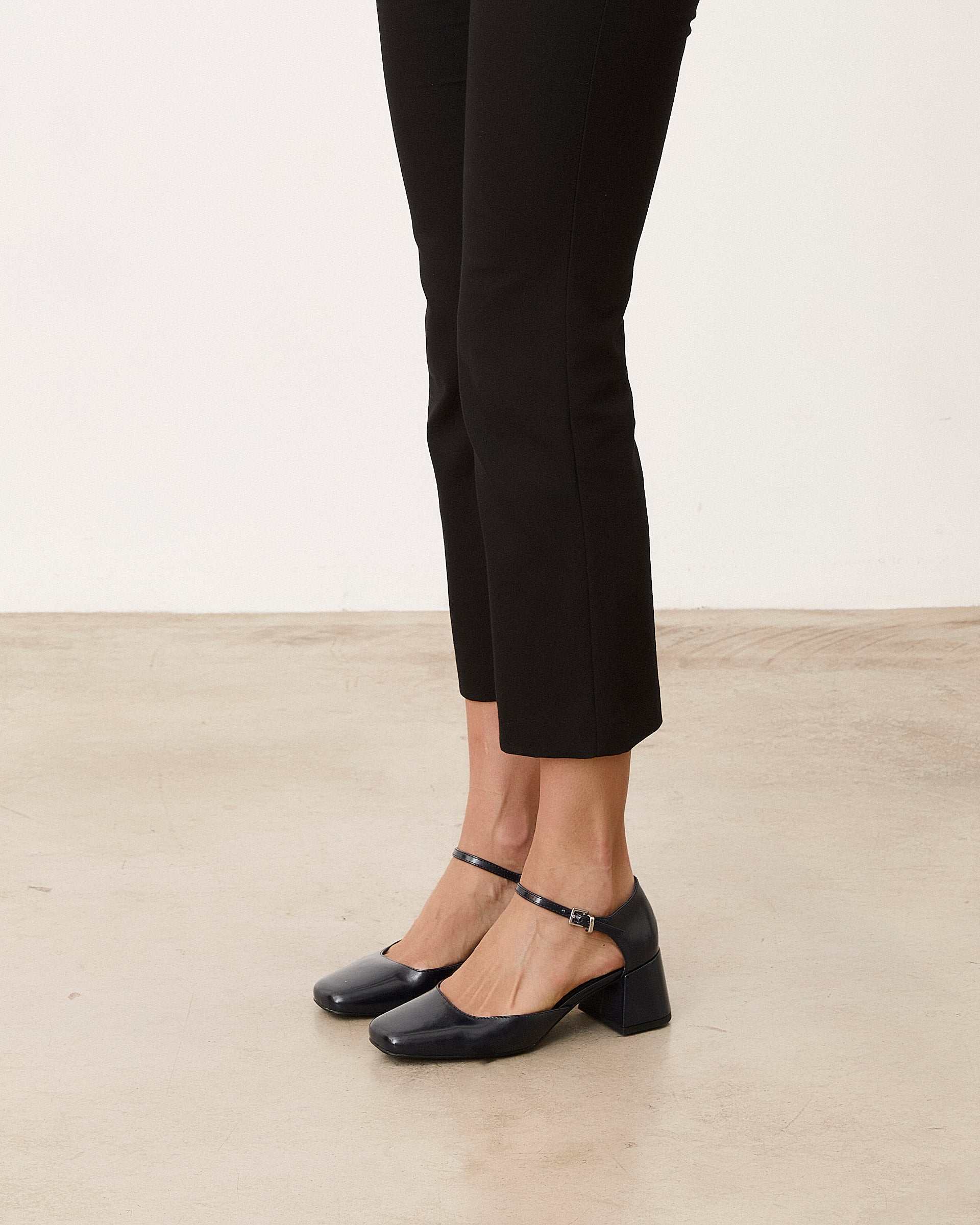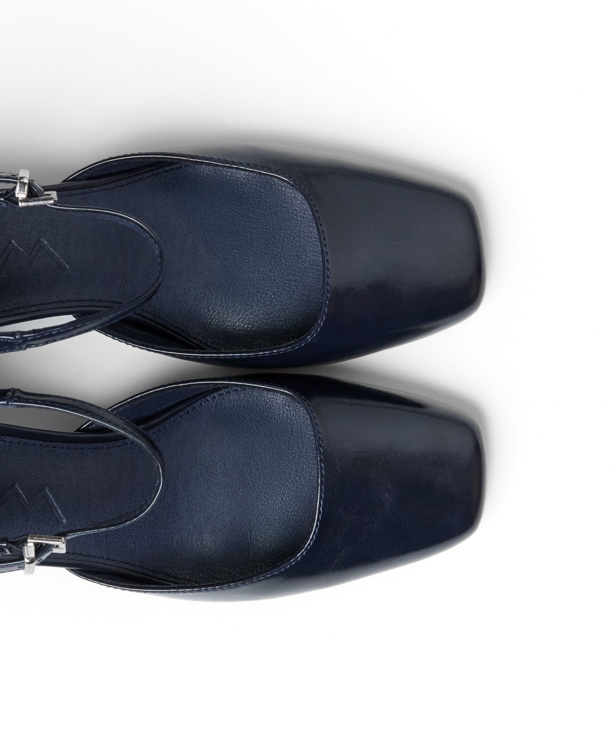 Zapato de tacón cerrado con puntera cuadrada en color azul marino. Talonera con pulsera al tobillo. Tacón cuadrado.