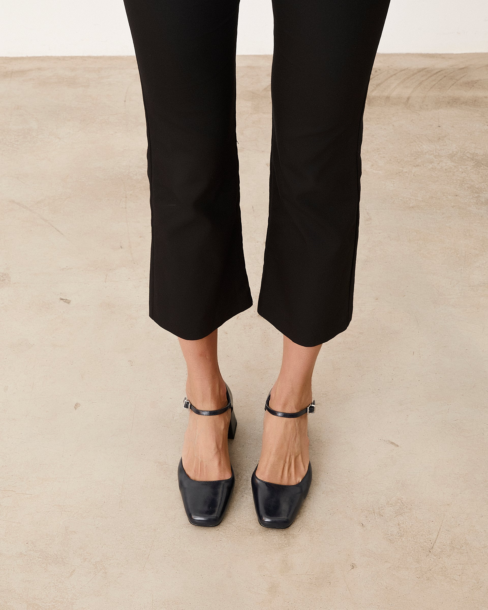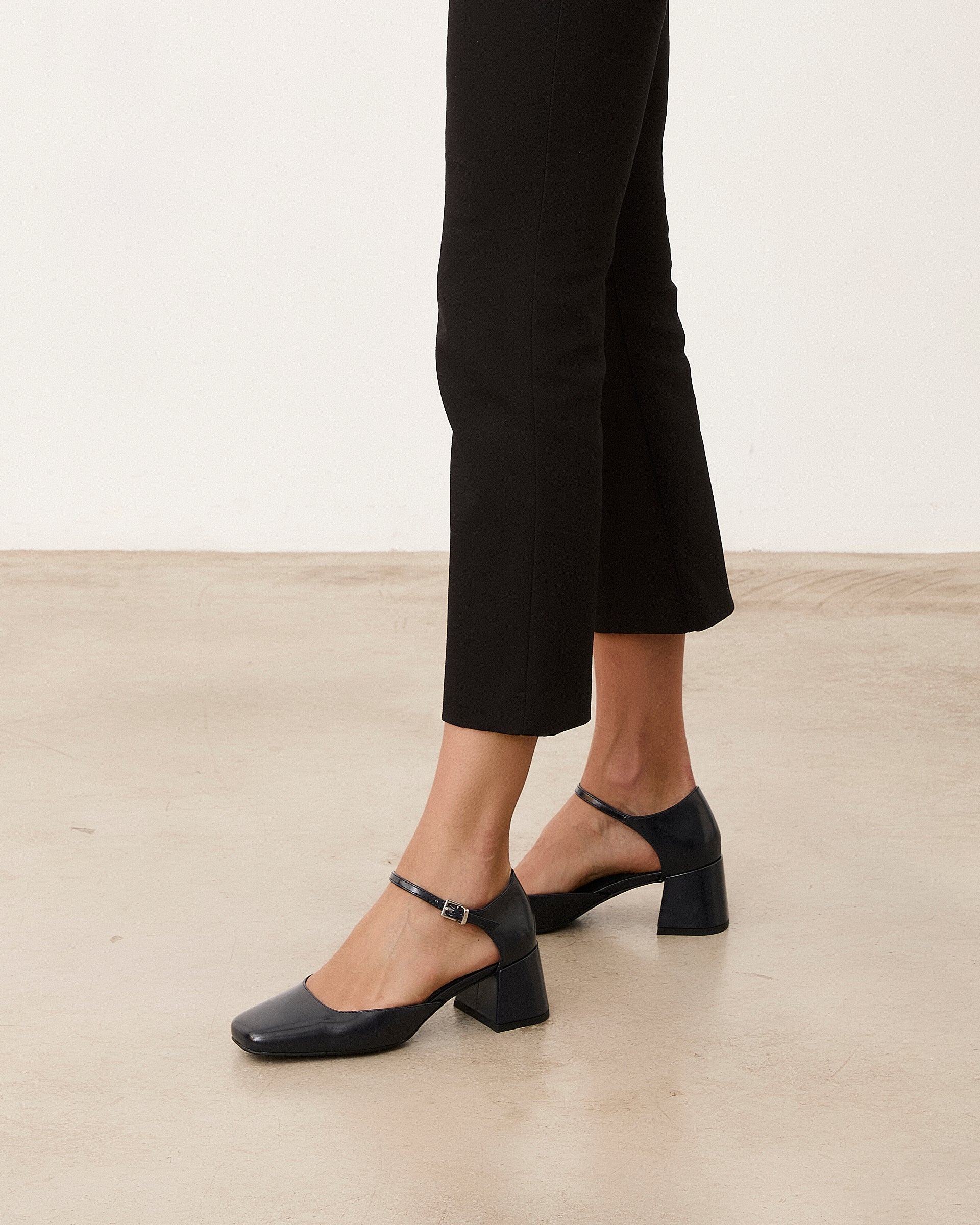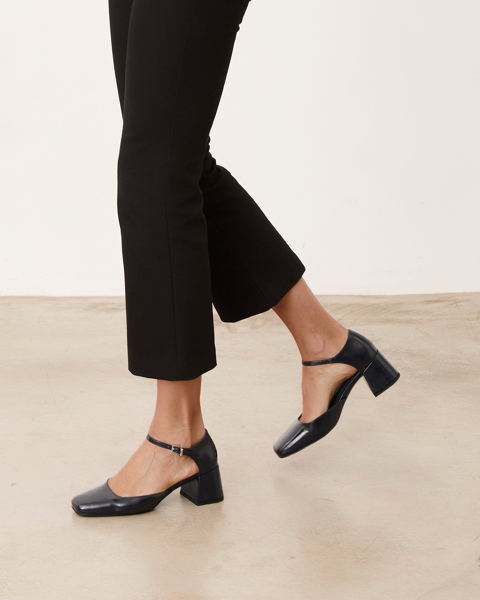 Zapato de tacón cerrado con puntera cuadrada en color azul marino. Talonera con pulsera al tobillo. Tacón cuadrado.