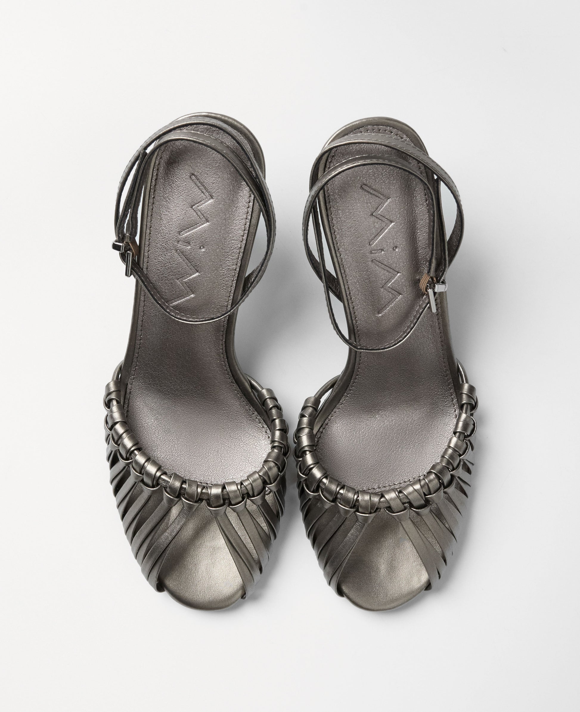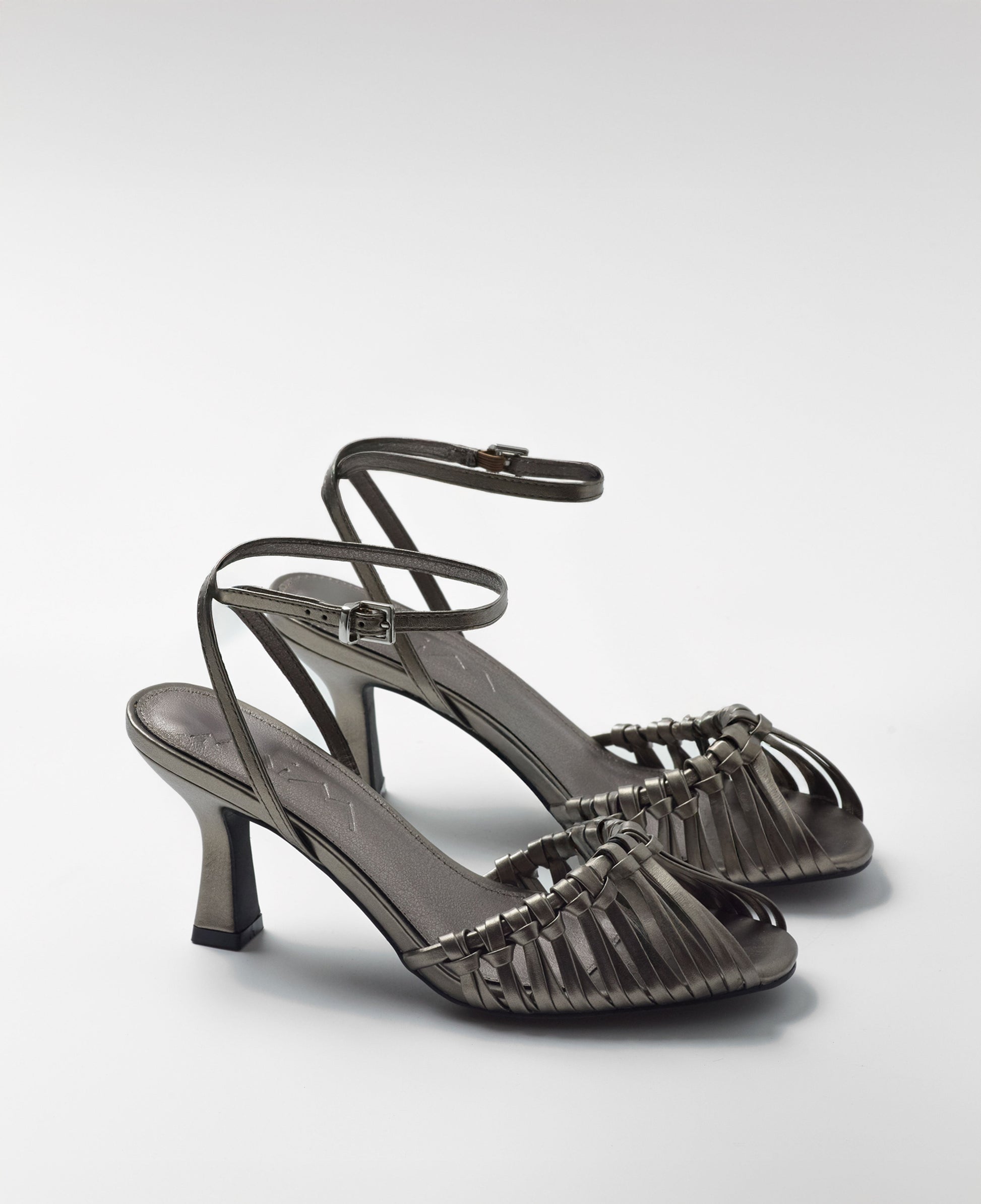 Sandalia de tacón con puntera redondeada en color metalizado. Parte delantera con detalle de nudos. Pulsera al tobillo para sujección. Tacón tipo aguja de base ancha.
