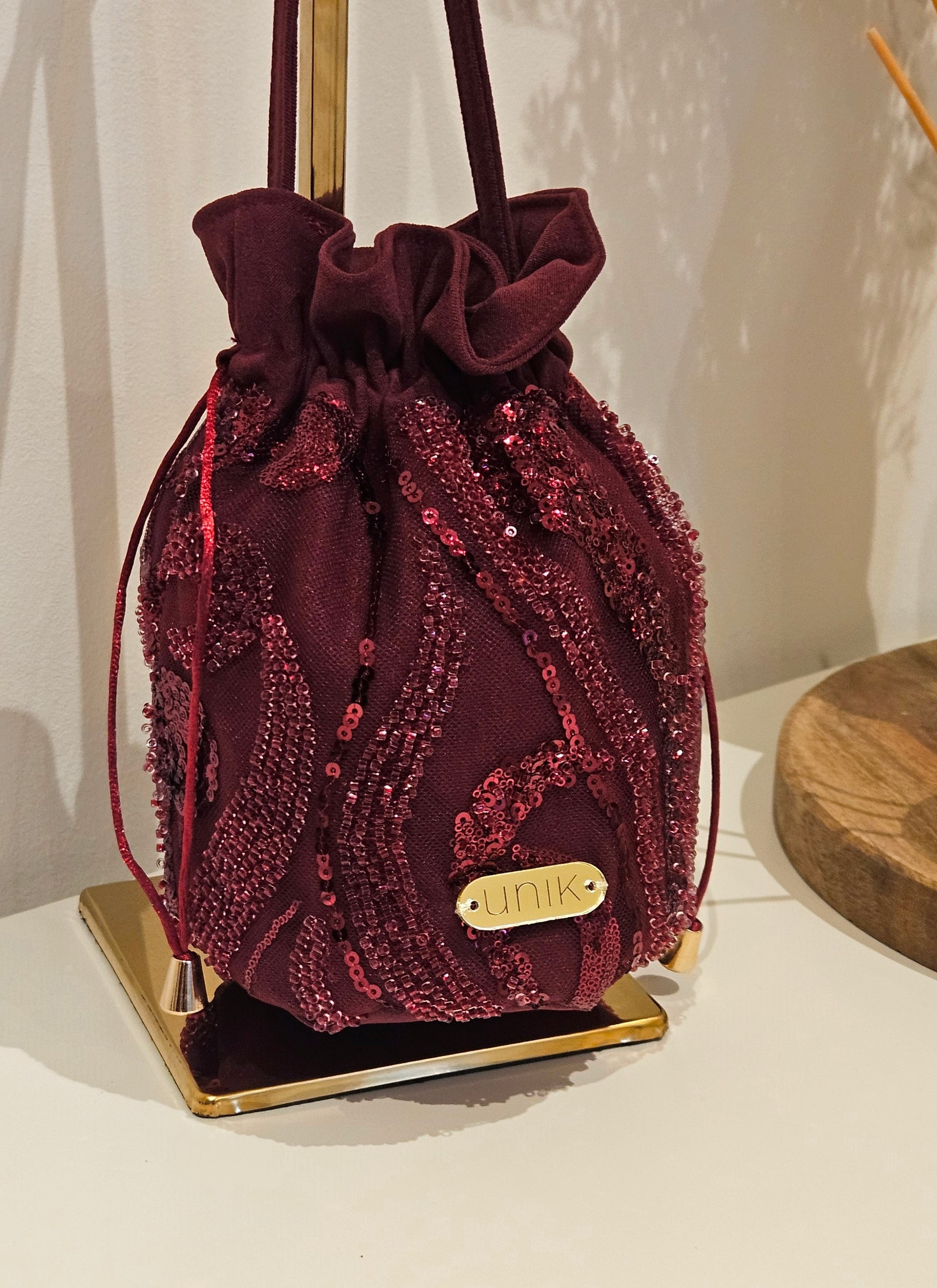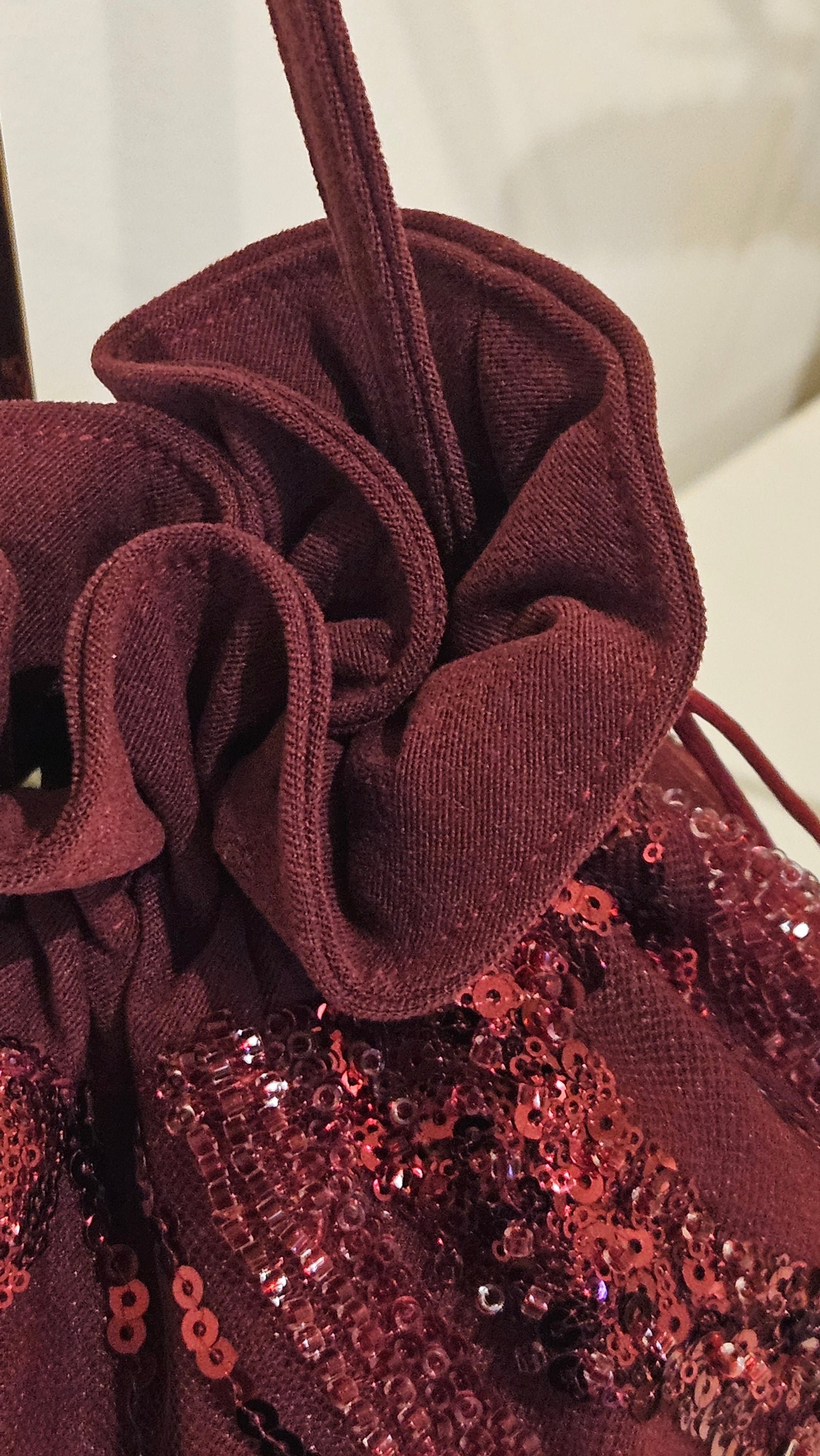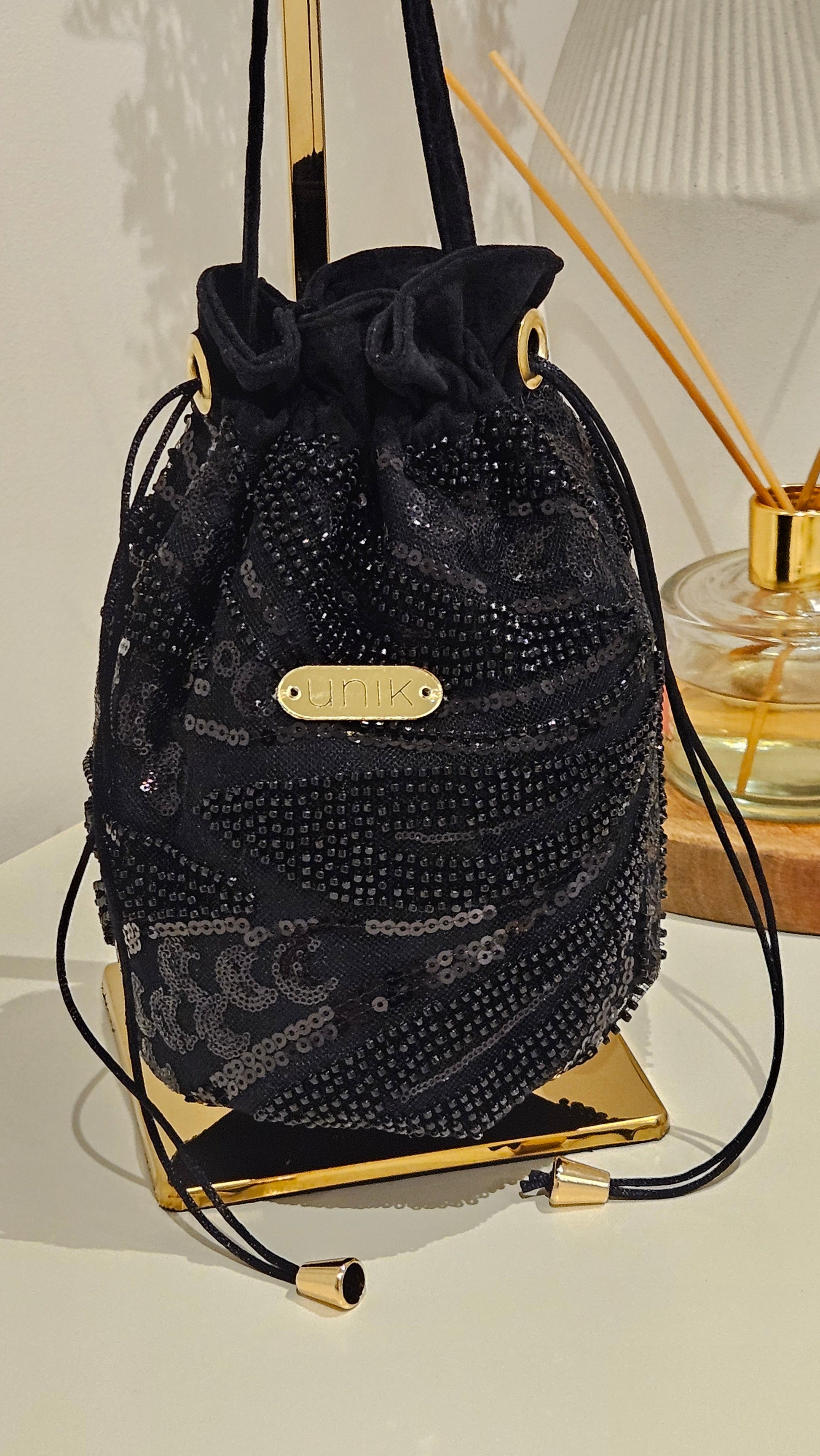 Elegant i sofisticat, aquest bolso bombonera és la peça perfecta per completar qualsevol look de nit o d’ocasió especial. Confeccionat amb teixit de vellut i decorat amb lluentons que creen un efecte brillant i únic.