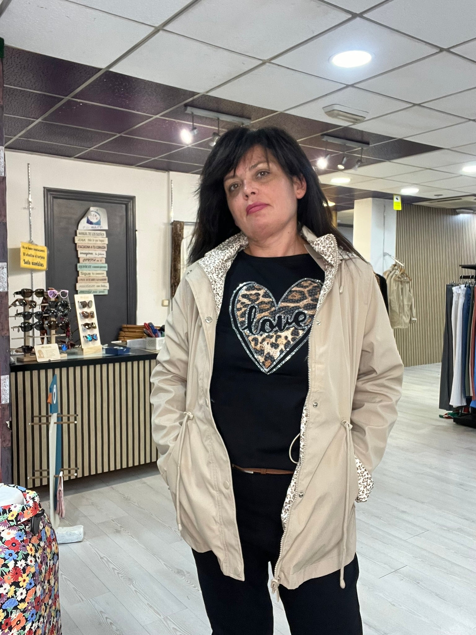 Dale un toque especial a tu look con esta camiseta de mujer negra con print de corazón animal print y la palabra “Love” decorada con brillantes y lentejuelas. Su tejido suave y elástico aporta una sensación muy agradable al tacto, ideal para llevar durante todo el día.