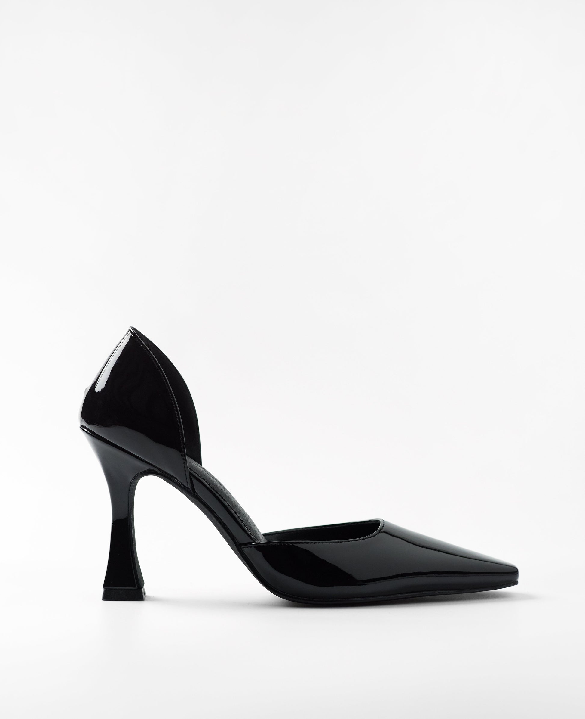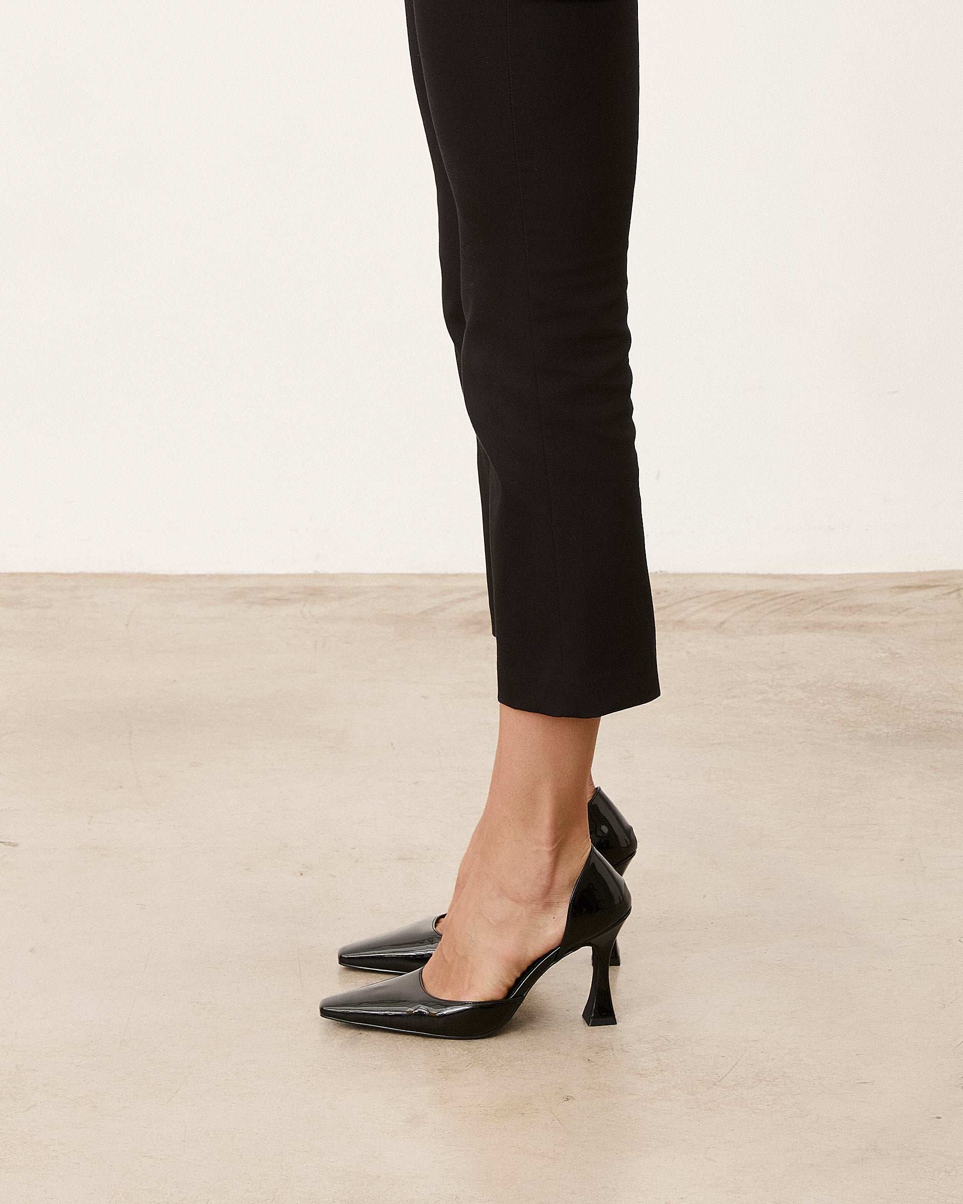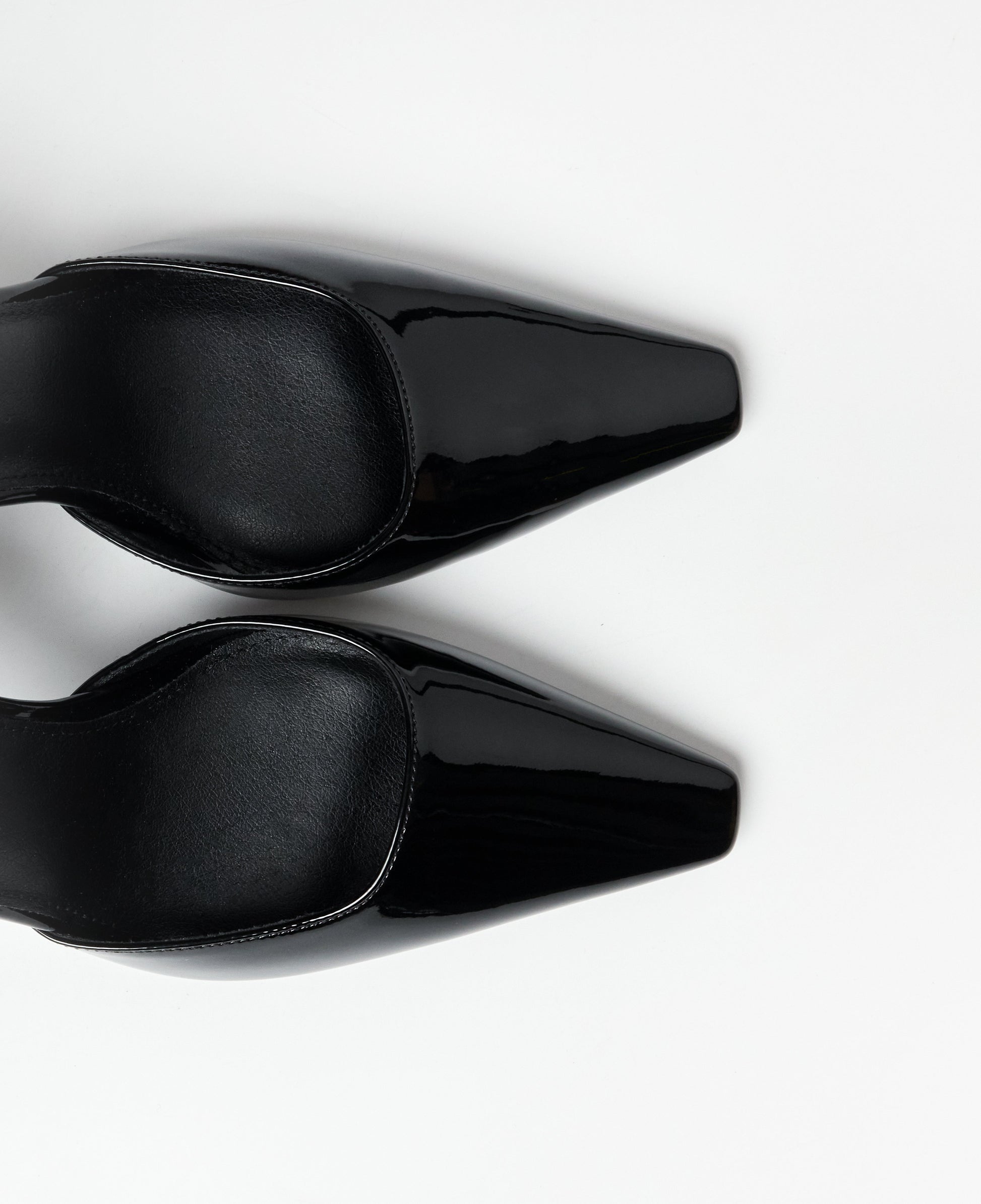 Zapato de tacón en punta cerrado con tacón fino y cuadrado en color negro. Parte trasera cerrada.