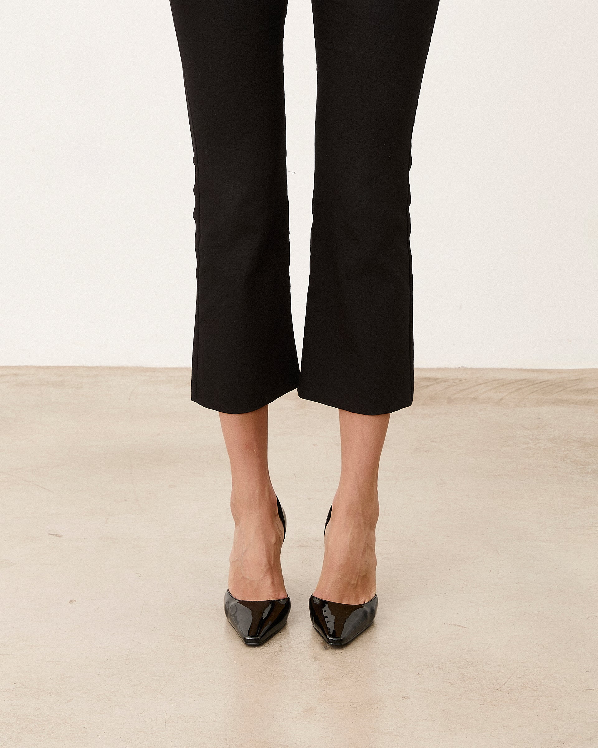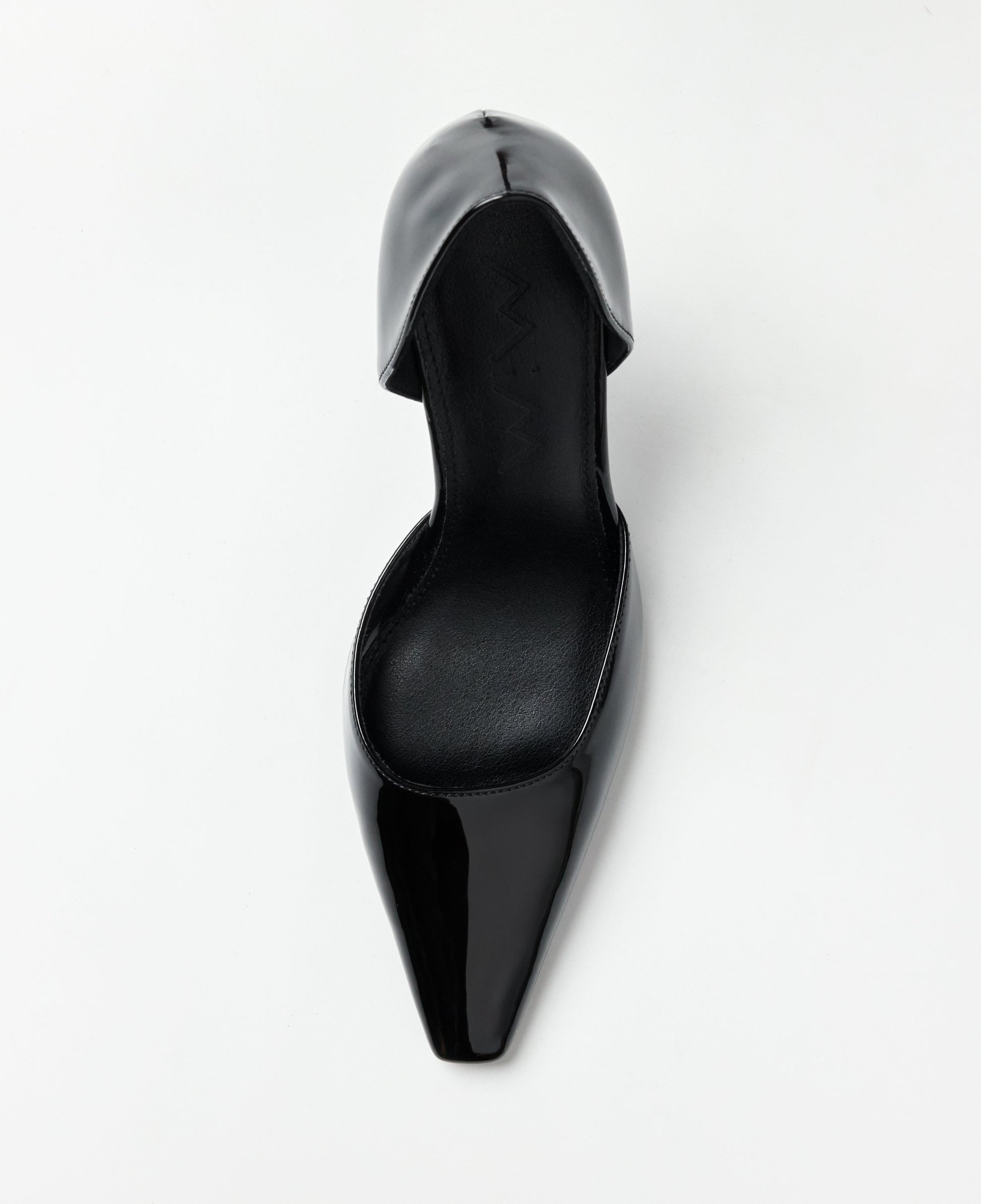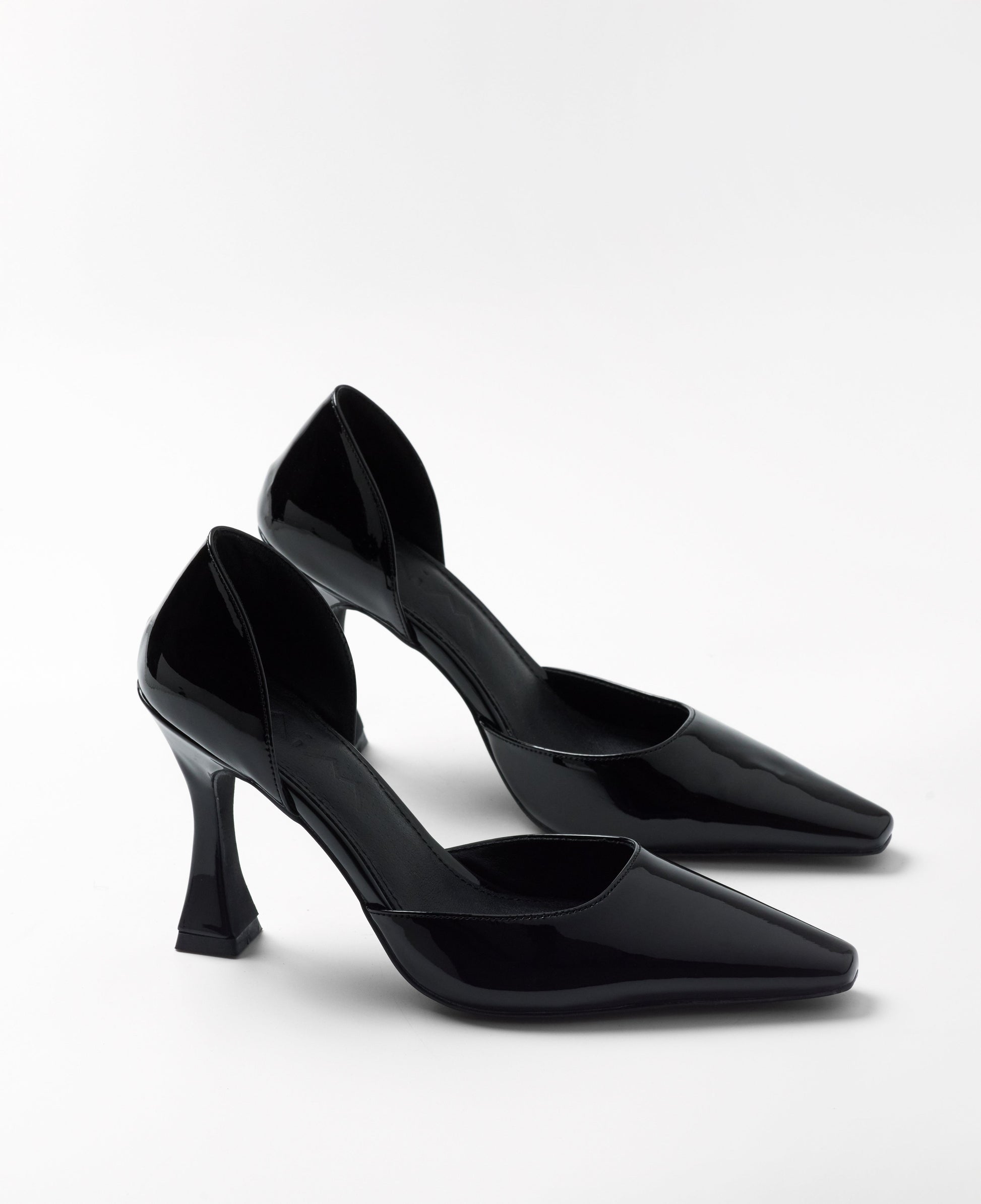Zapato de tacón en punta cerrado con tacón fino y cuadrado en color negro. Parte trasera cerrada.