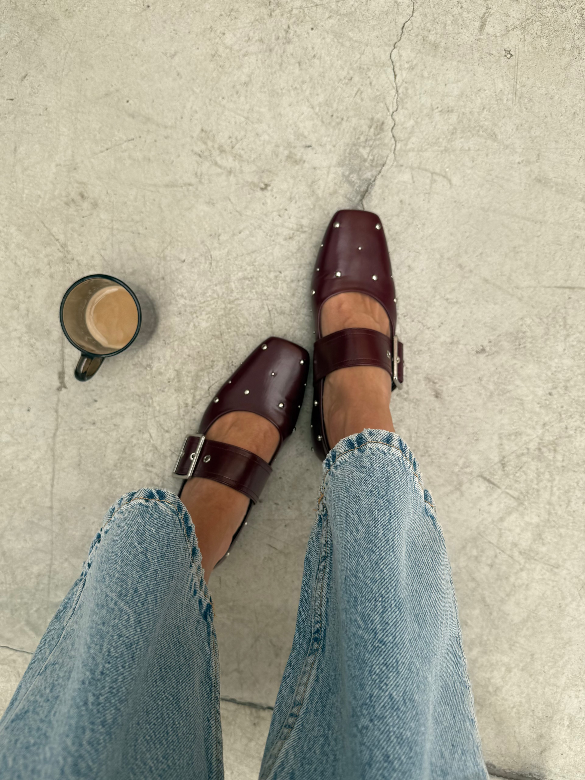 Zapato plano cerrado con puntera cuadrada en color burdeos con tachuelas. Detalle de cierre con hebilla.