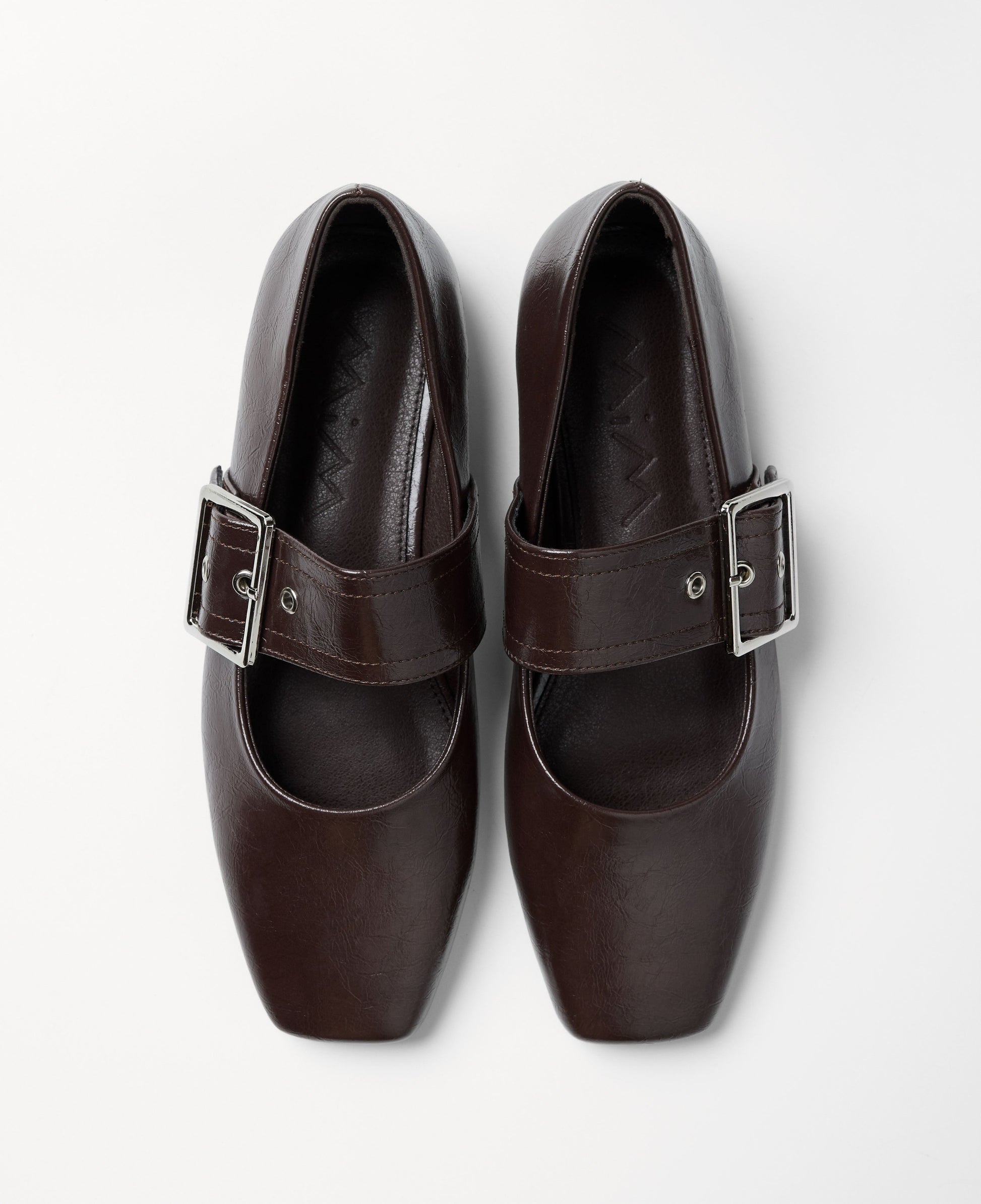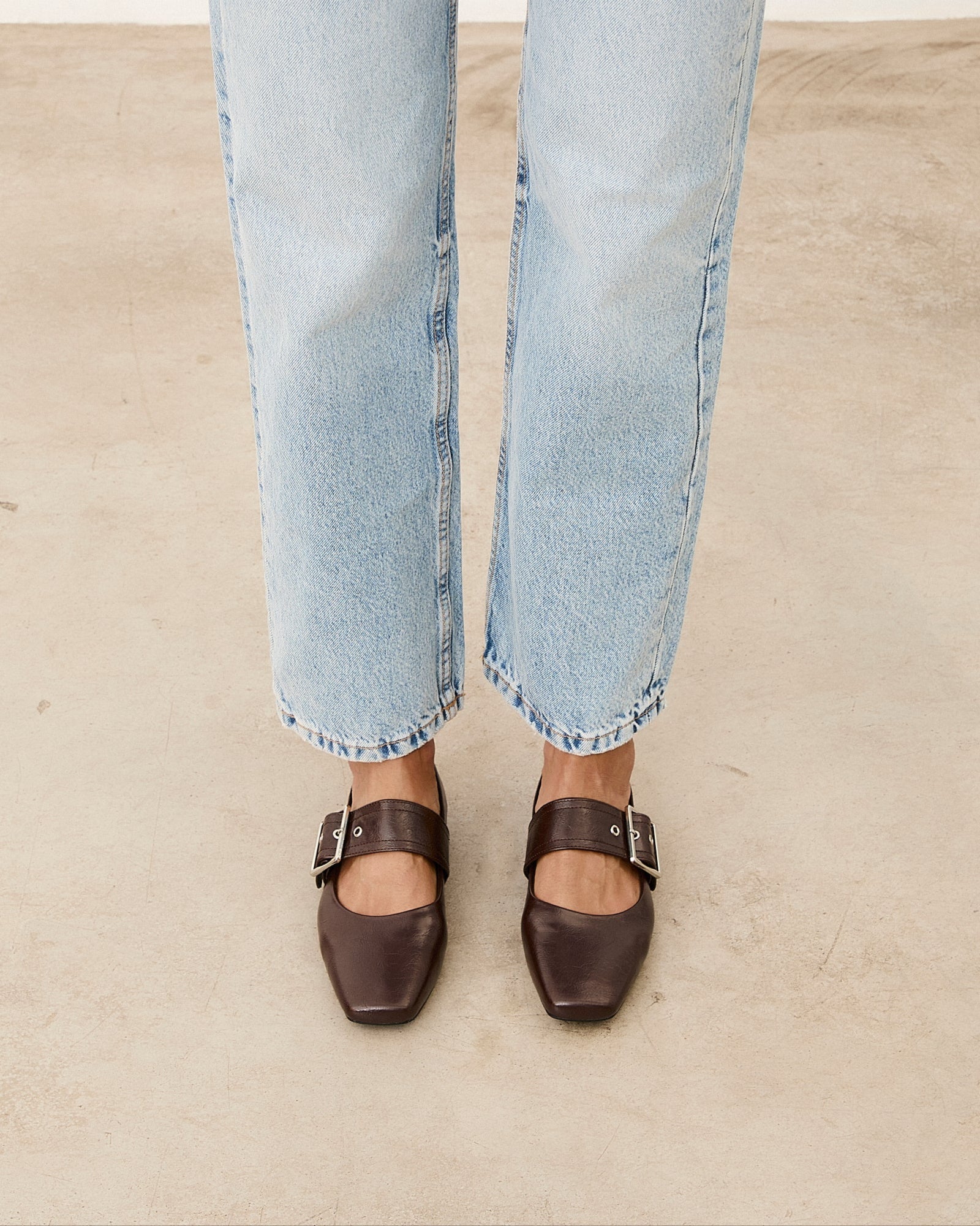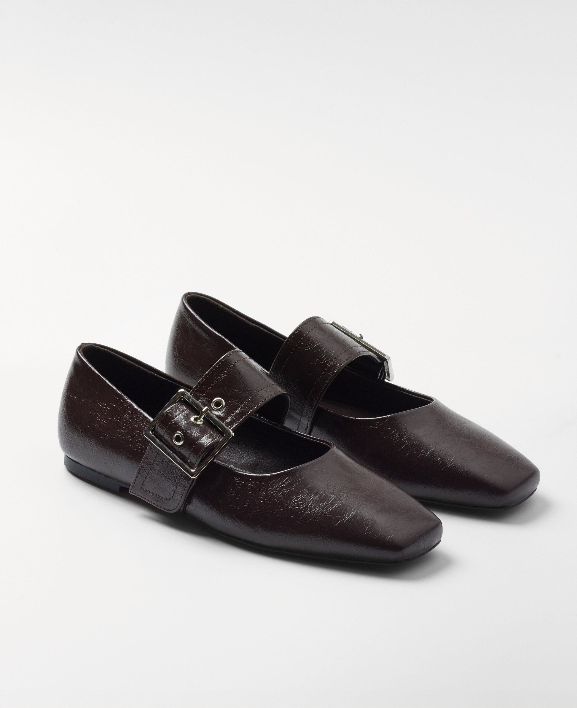 Zapato plano cerrado con puntera cuadrada en color chocolate. Detalle de cierre con hebilla.