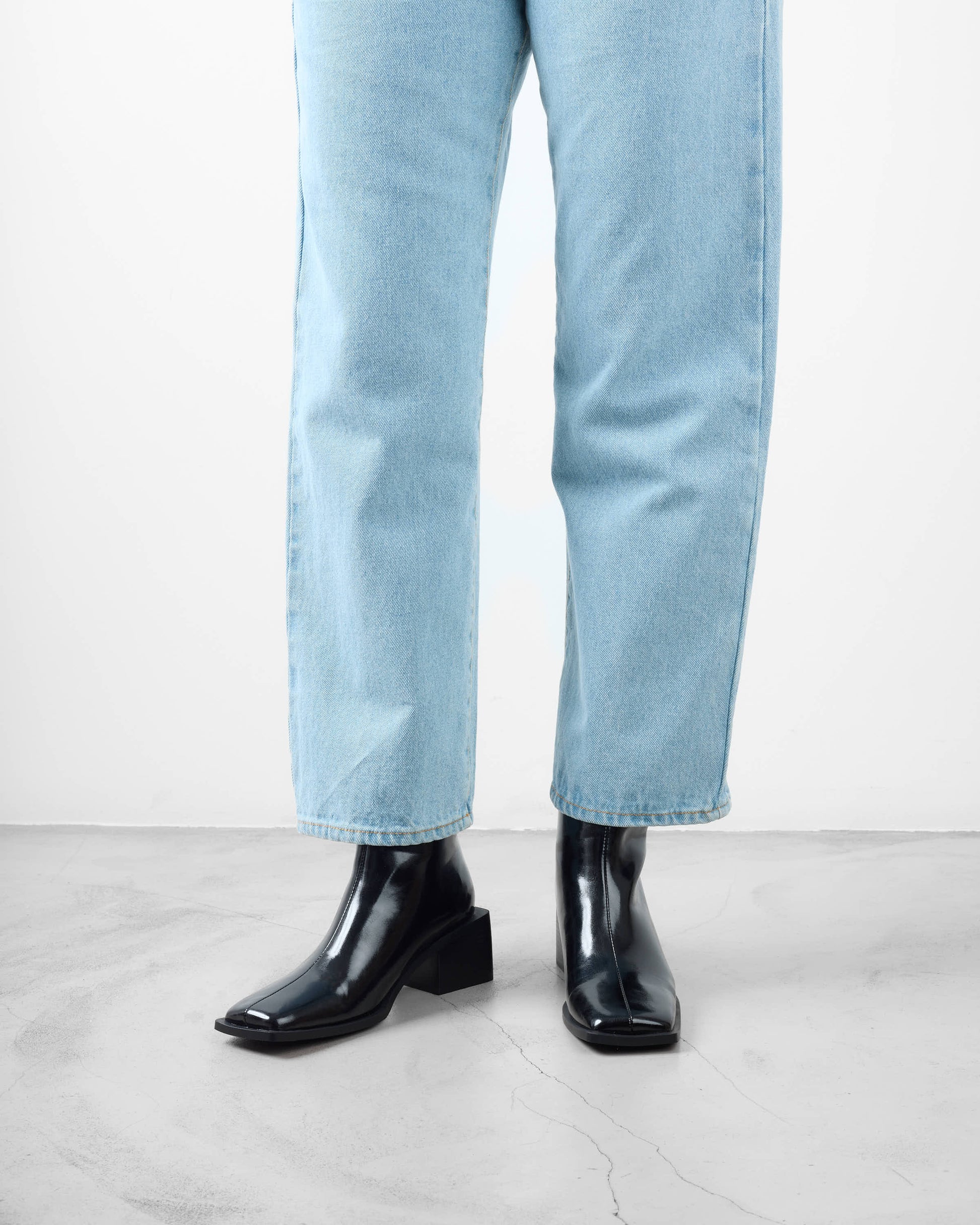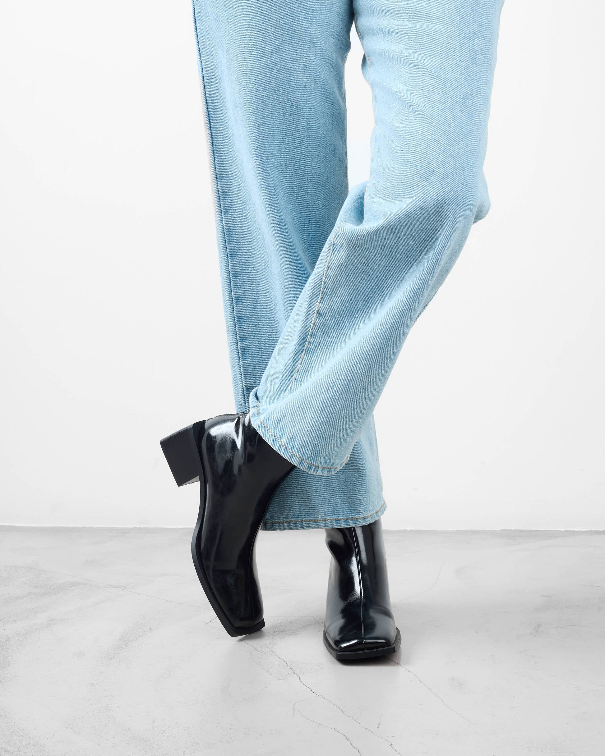 Botín de caña baja en charol sintético color negro con punta cuadrada. Cremallera trasera. Tacón cuadrado.