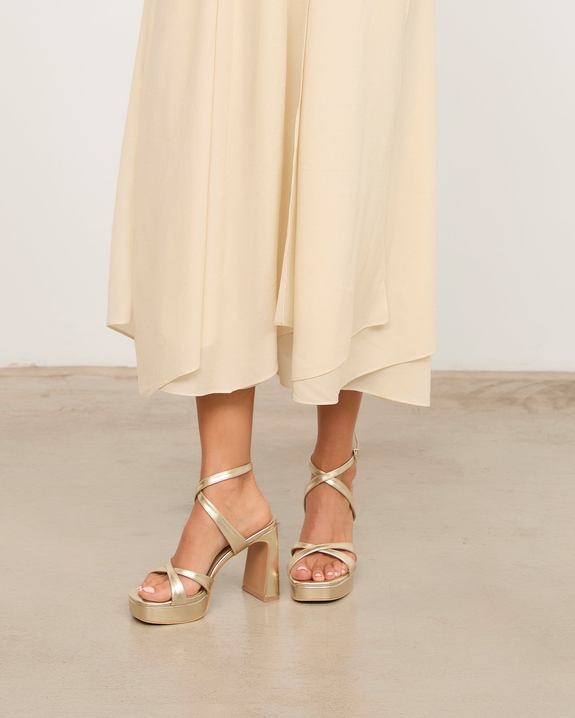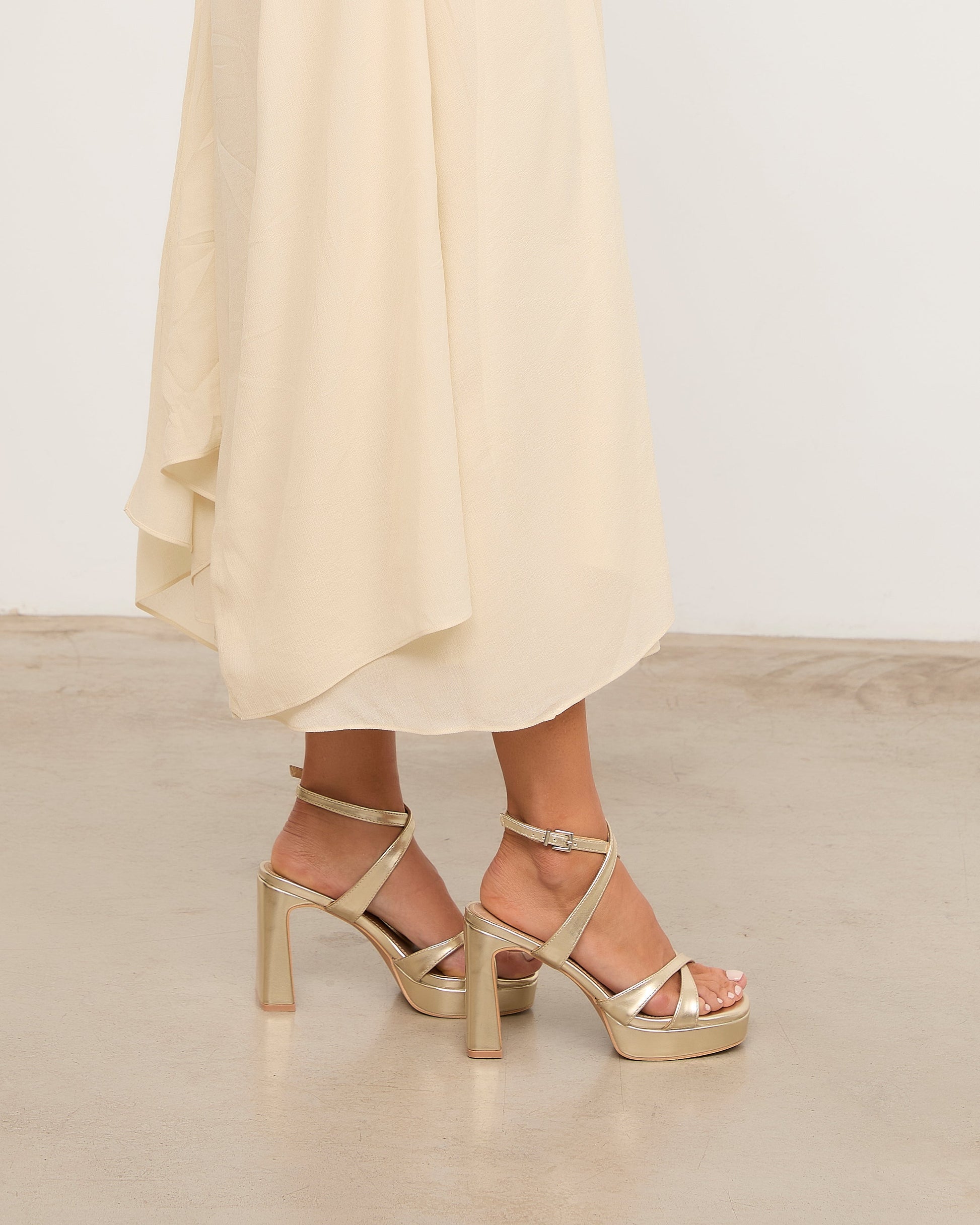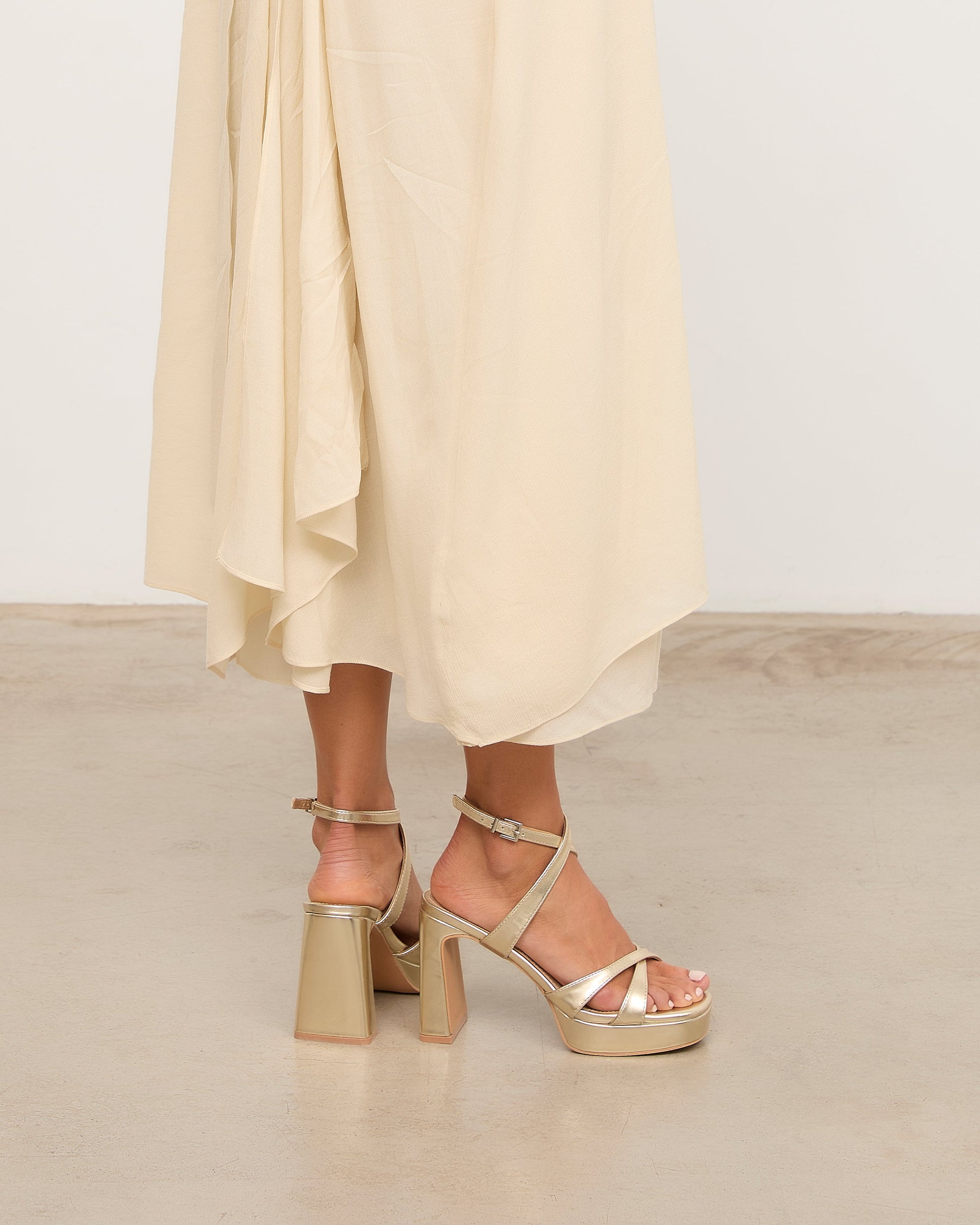 Sandalia de tacón con plataforma en color dorado. Dos tiras cruzadas en la parte frontal y cierre con pulsera al tobillos con cruce delantero. Tacón rectangular.