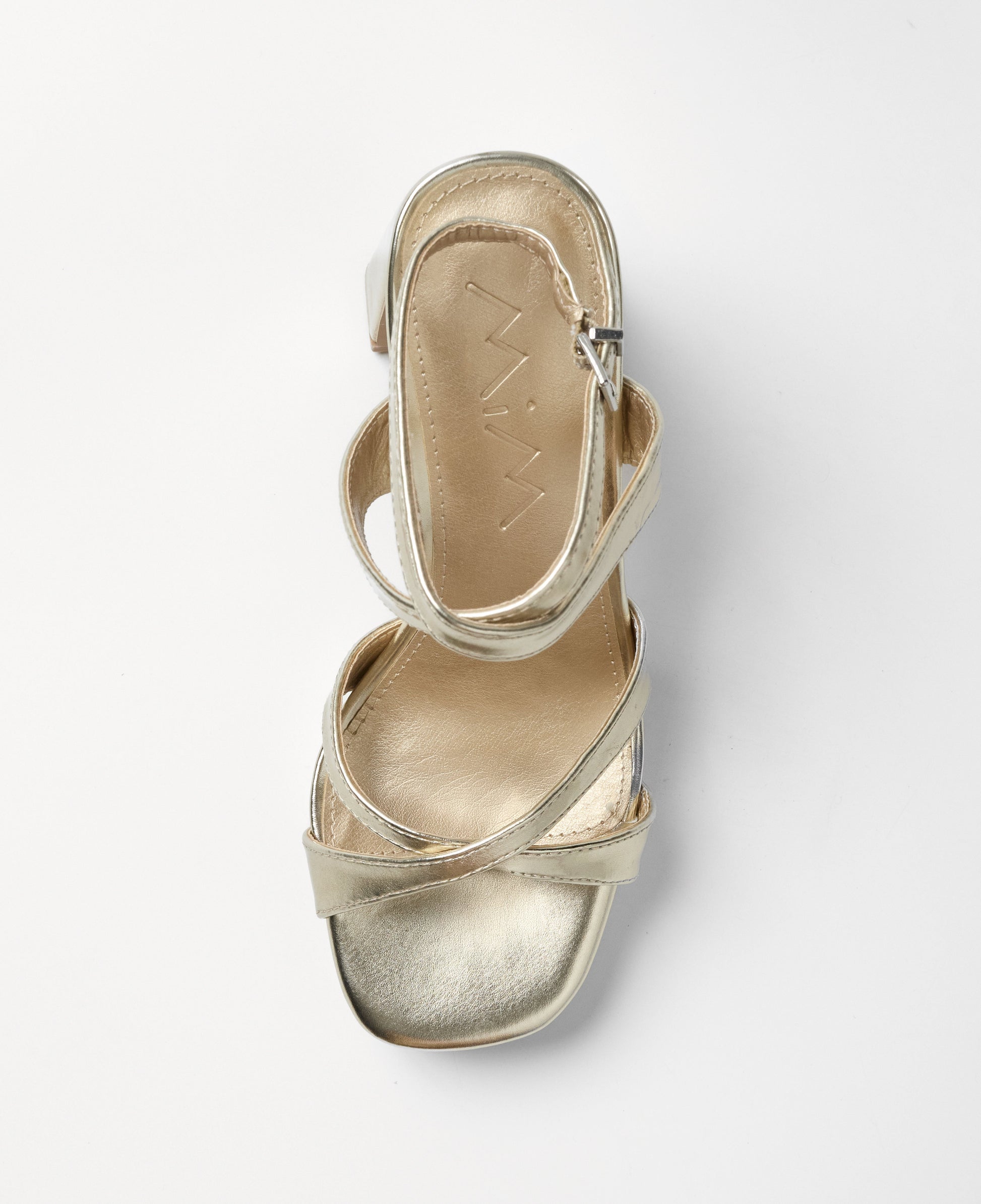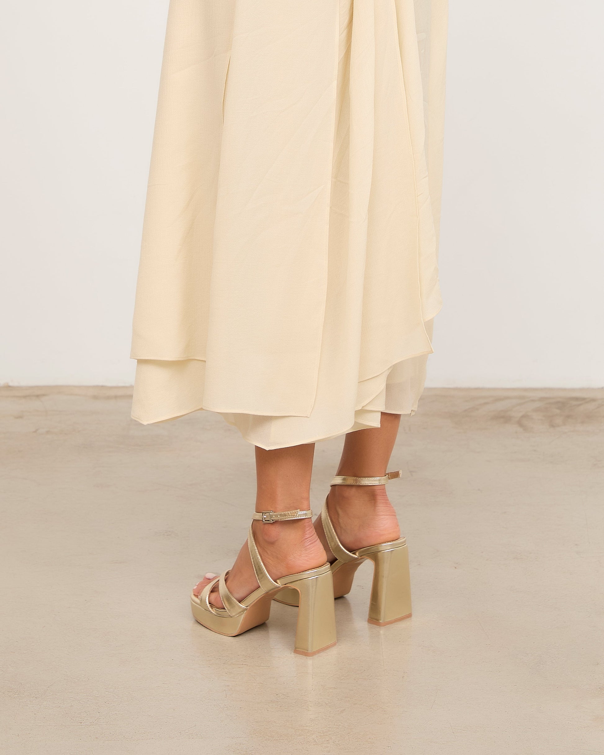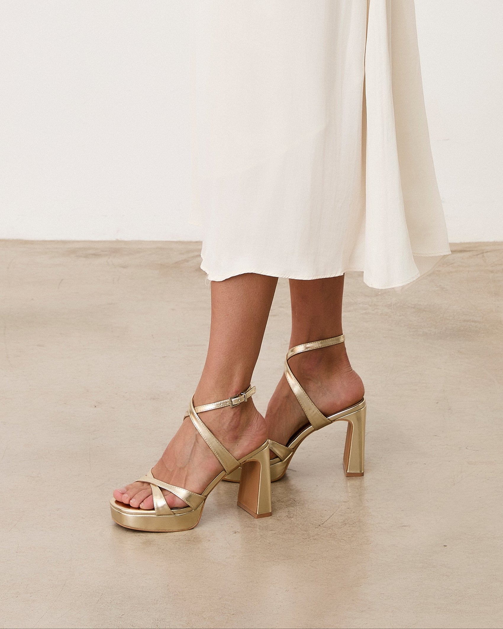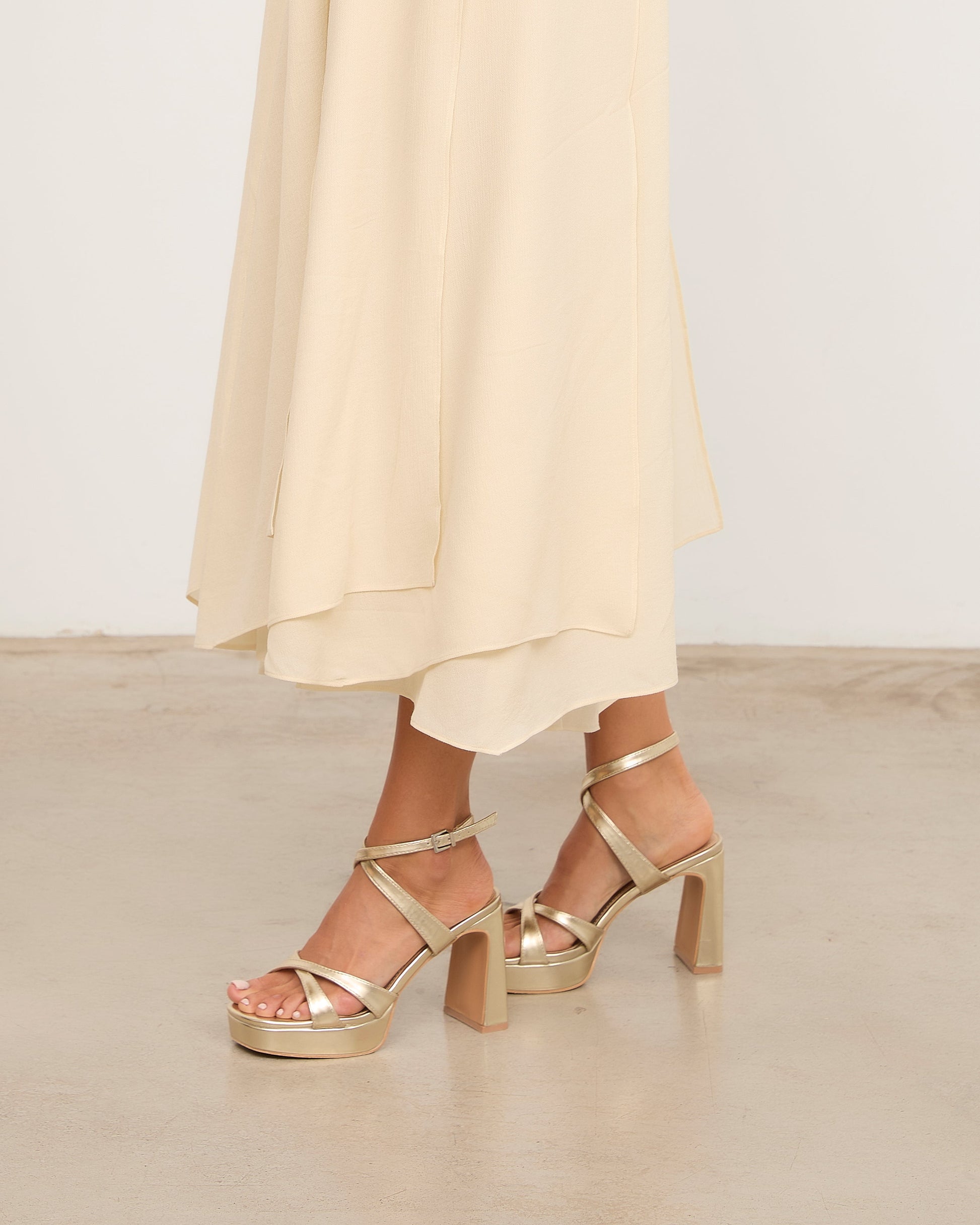 Sandalia de tacón con plataforma en color dorado. Dos tiras cruzadas en la parte frontal y cierre con pulsera al tobillos con cruce delantero. Tacón rectangular.
