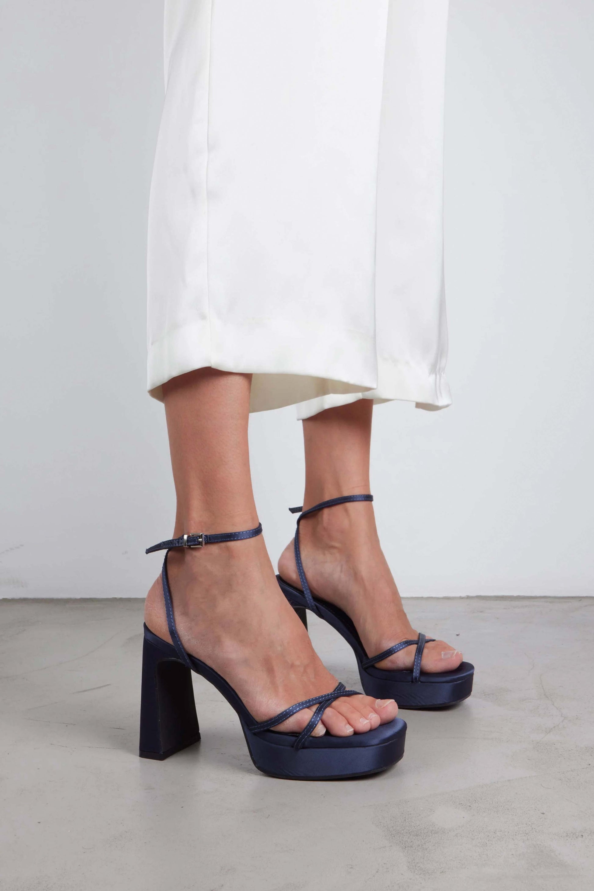 Sandalia de tacón en color azul marino satinado y plataforma. Parte delantera abierta con tiras y tacón rectangular. Cierre de pulsera al tobillo con hebilla metálica.