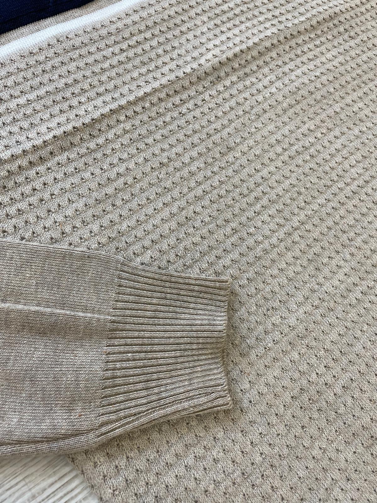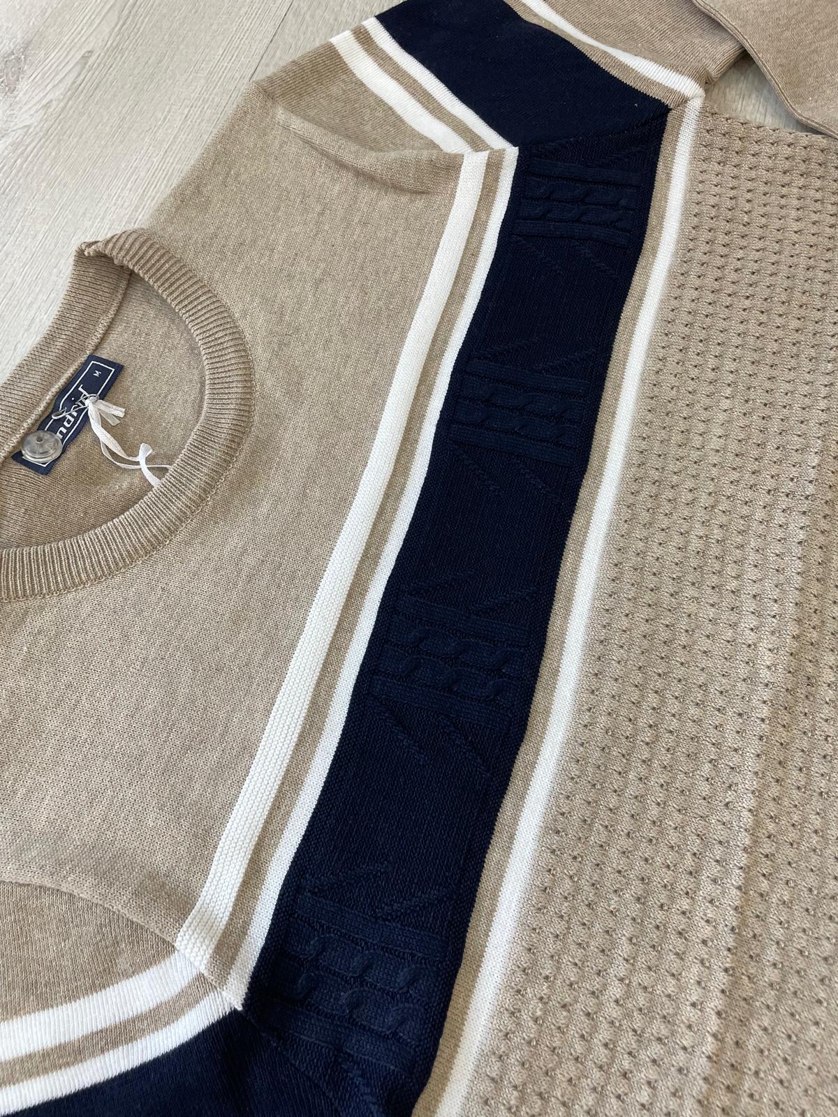 Este jersey beig Caster combina texturas variadas que le dan un toque único y divertido. Sus terminaciones en rib en las mangas y el bajo aportan detalle y confort, mientras que el cuello redondo mantiene un estilo clásico y desenfadado.