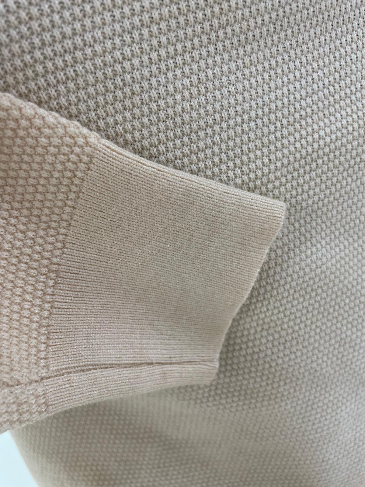 Su tejido de punto fino y cuello redondo con escote abotonado aportan comodidad y estilo, mientras que las terminaciones en rib en mangas y bajo aseguran un ajuste perfecto.