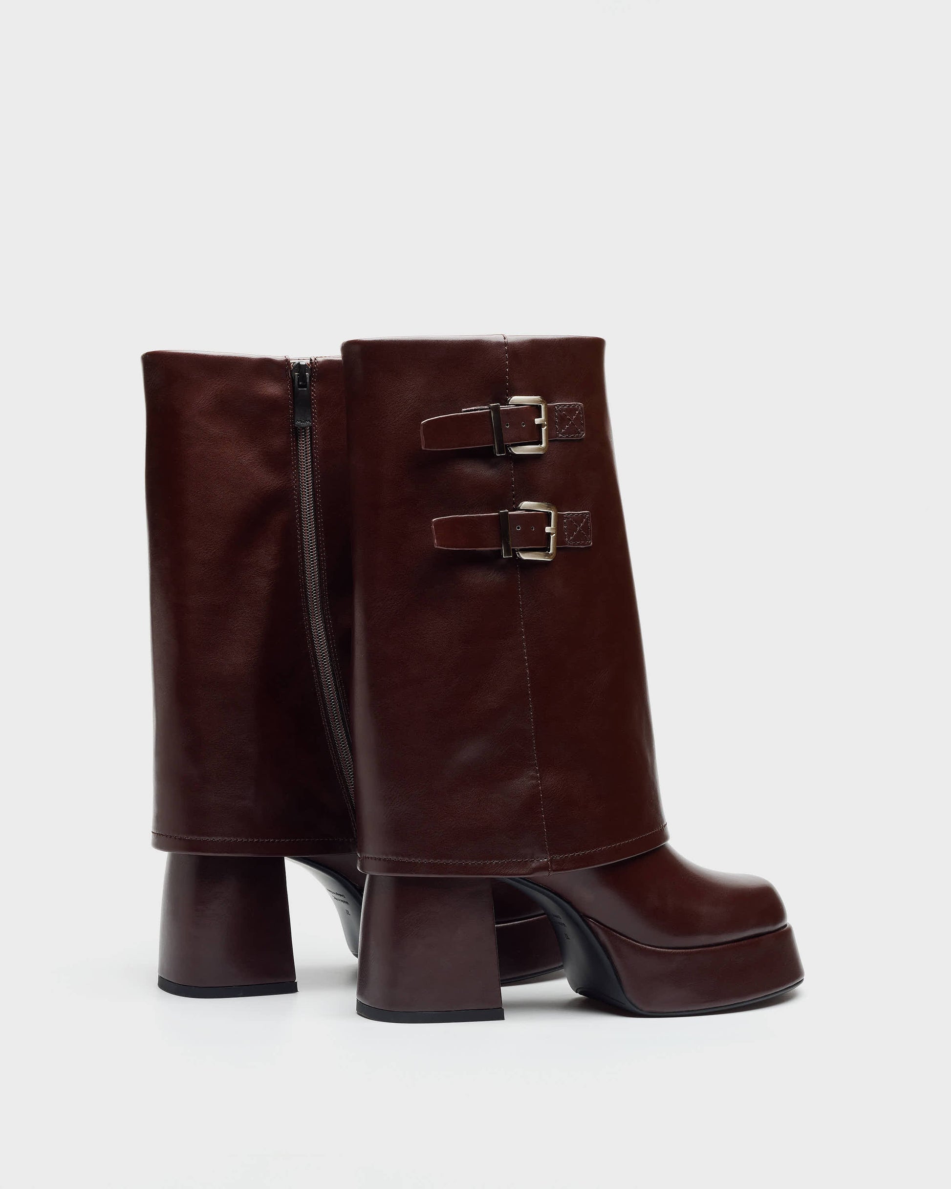 Bota de tacón con plataforma en color chocolate. Efecto doblado tapando parte del tacón