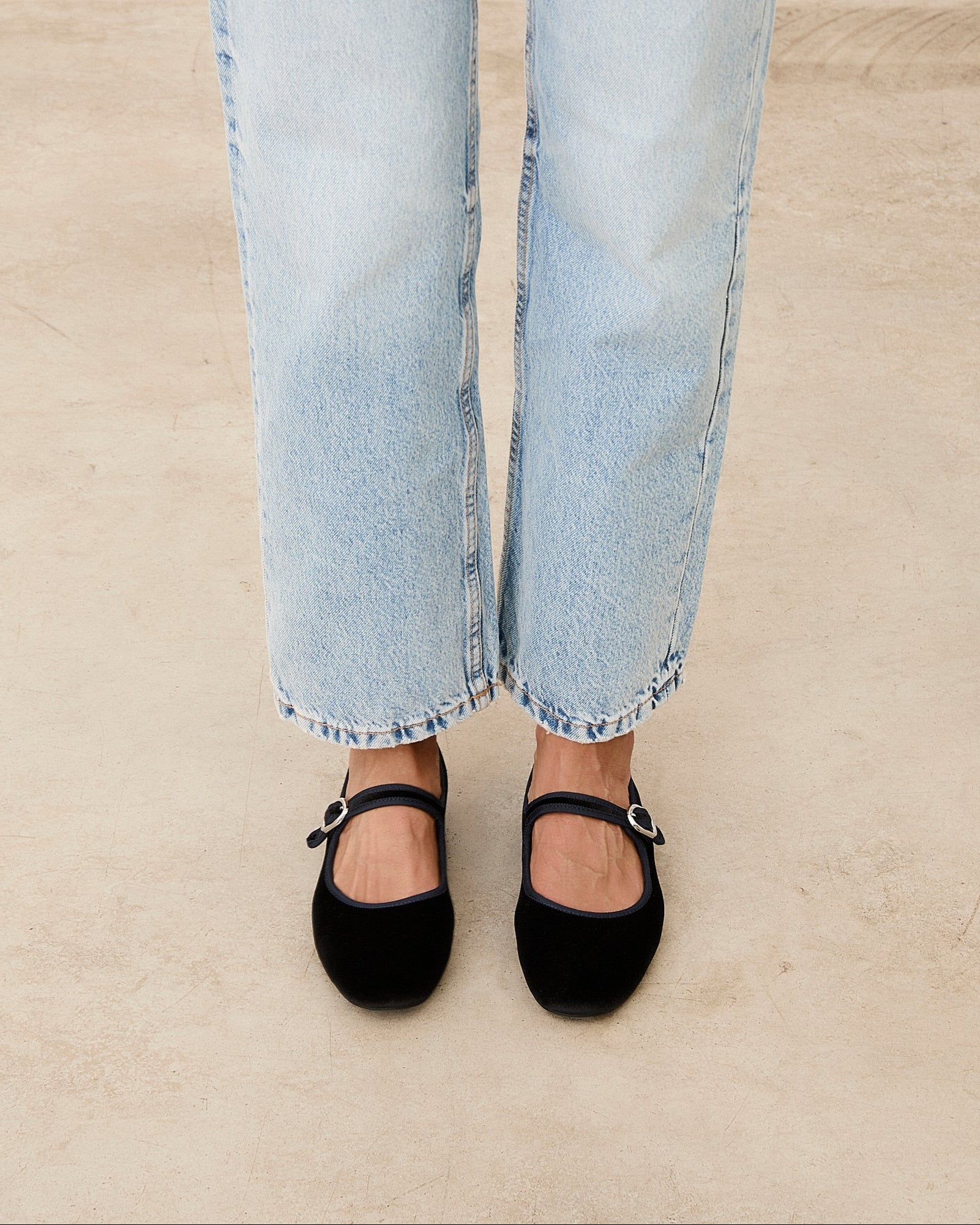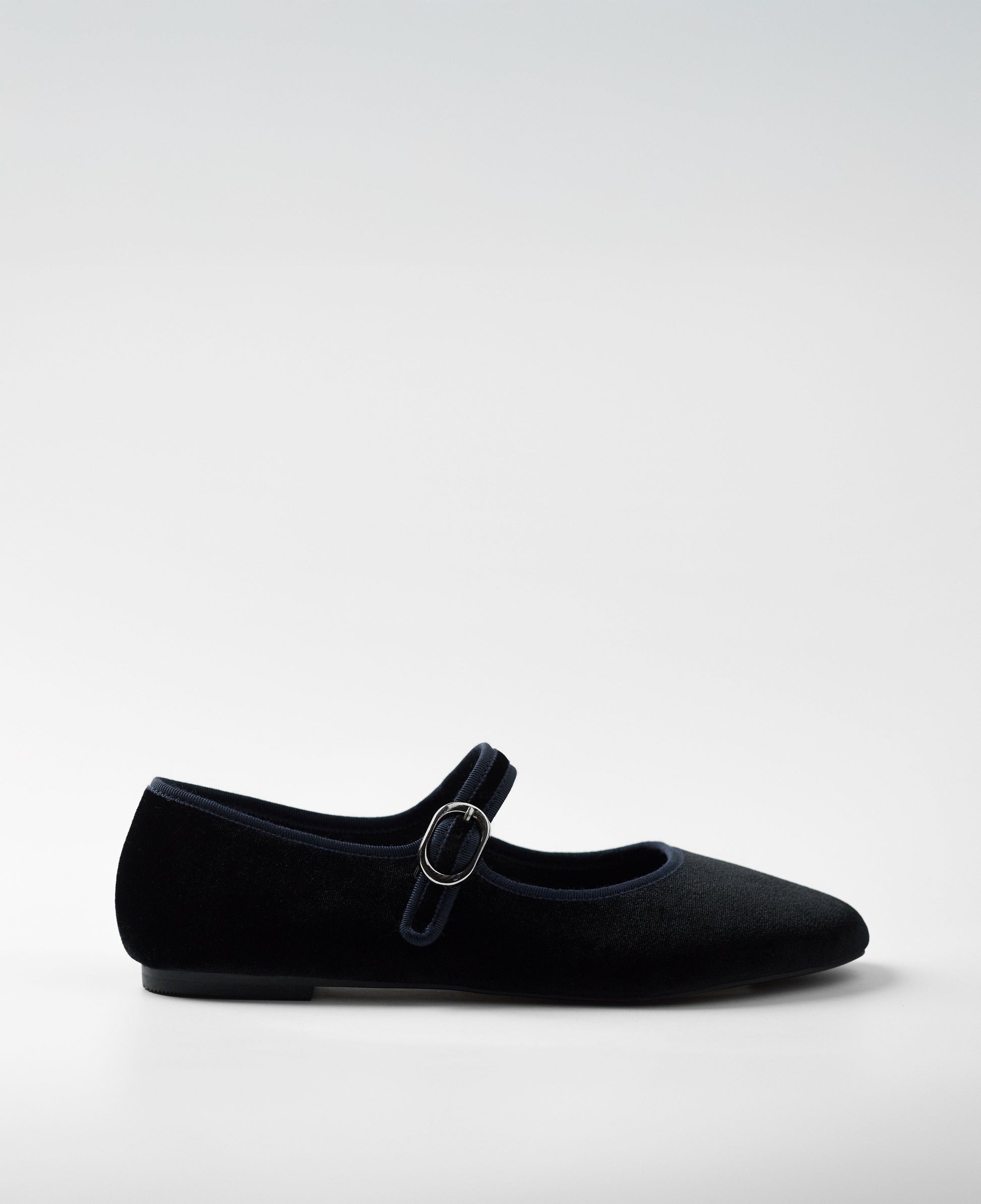 Zapato cerrado estilo mercedita en color negro con punta redondeada. Detalle de ribete a contraste en color azul.