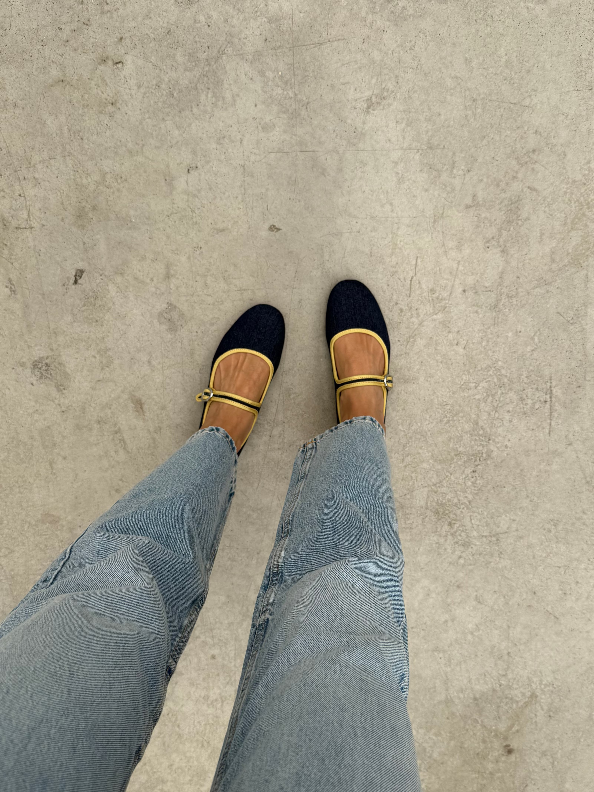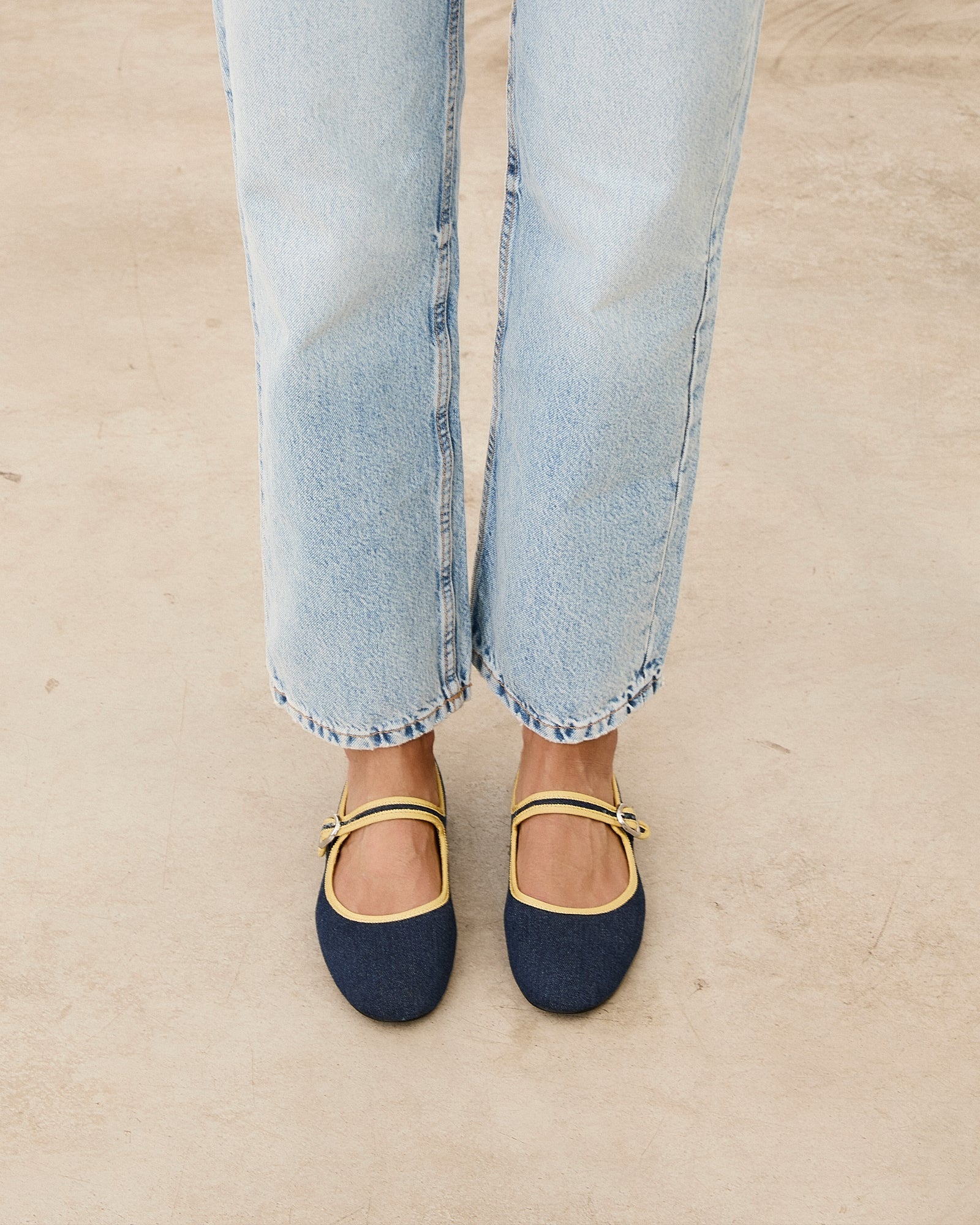 Zapato cerrado estilo mercedita en color vaquero con punta redondeada. Detalle de ribete a contraste en color amarillo.