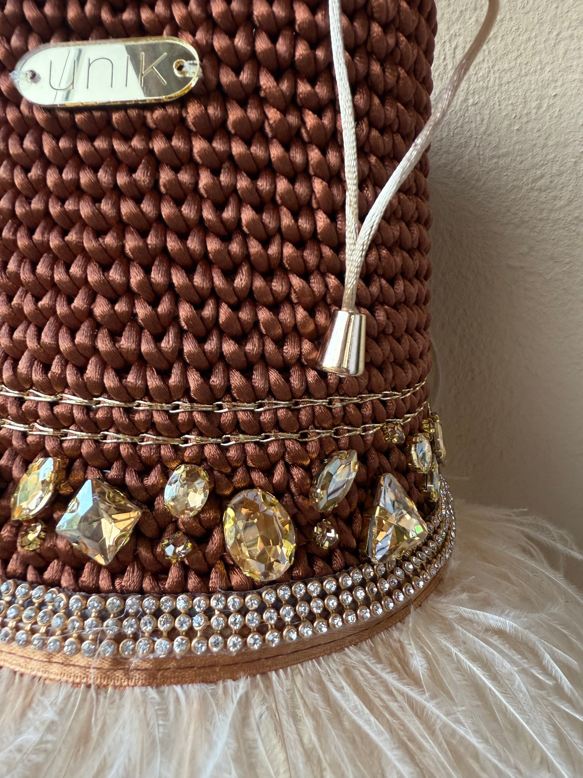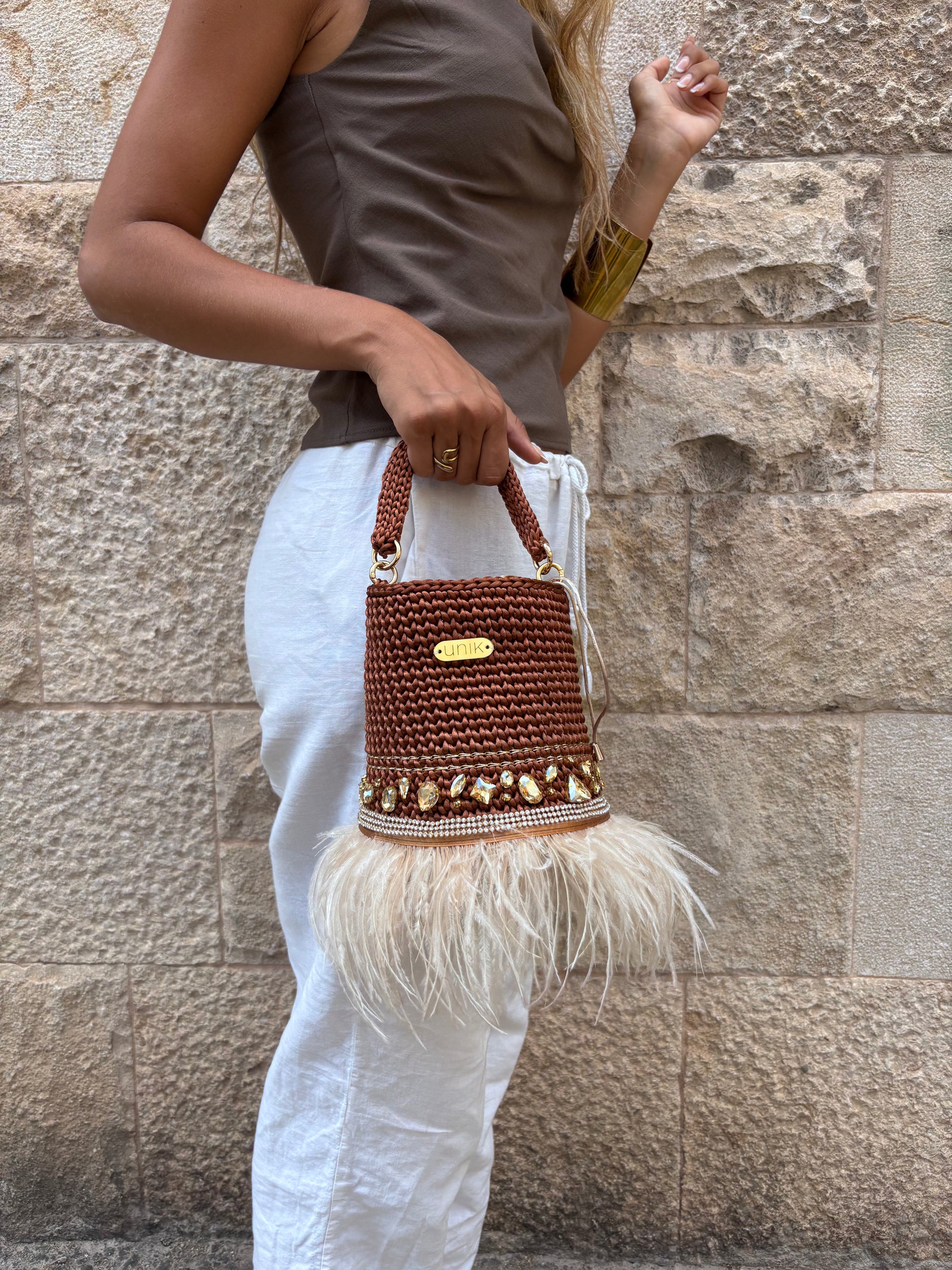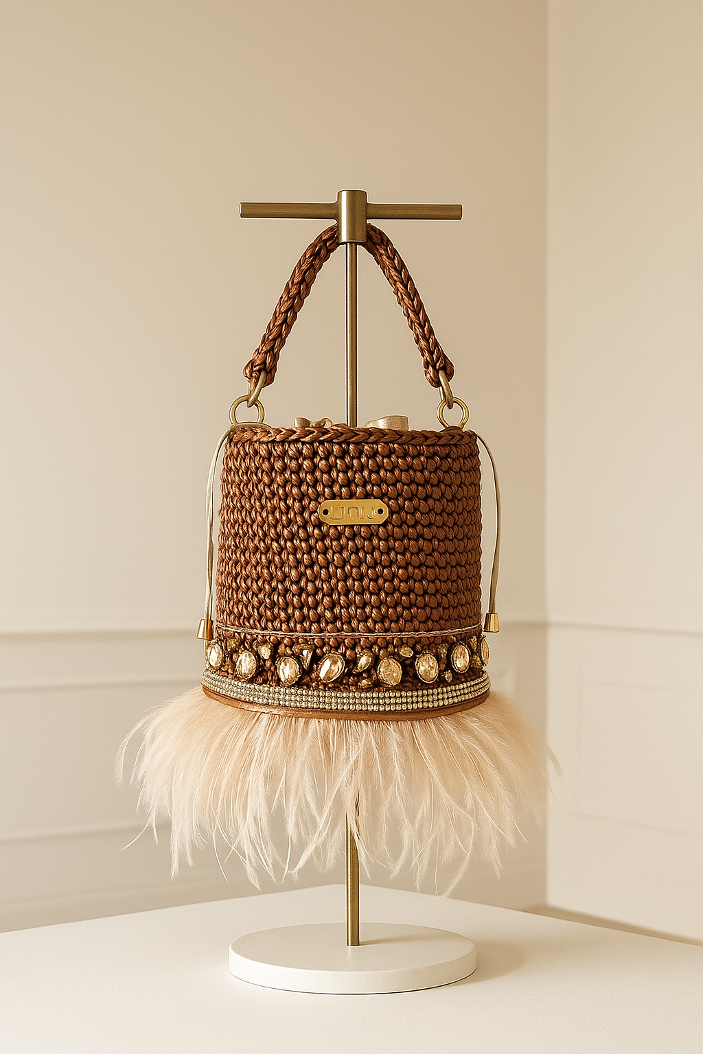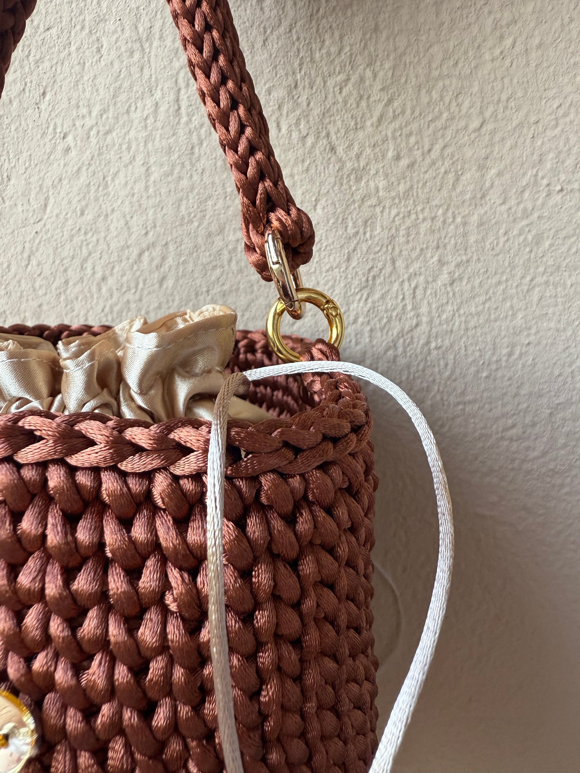 Bolso de ganxet amb forma de con, teixit a mà amb fil marró i un disseny pensat per destacar per la seva elegància i originalitat. La seva estructura còmoda i lleugera el converteix en l’accessori ideal.