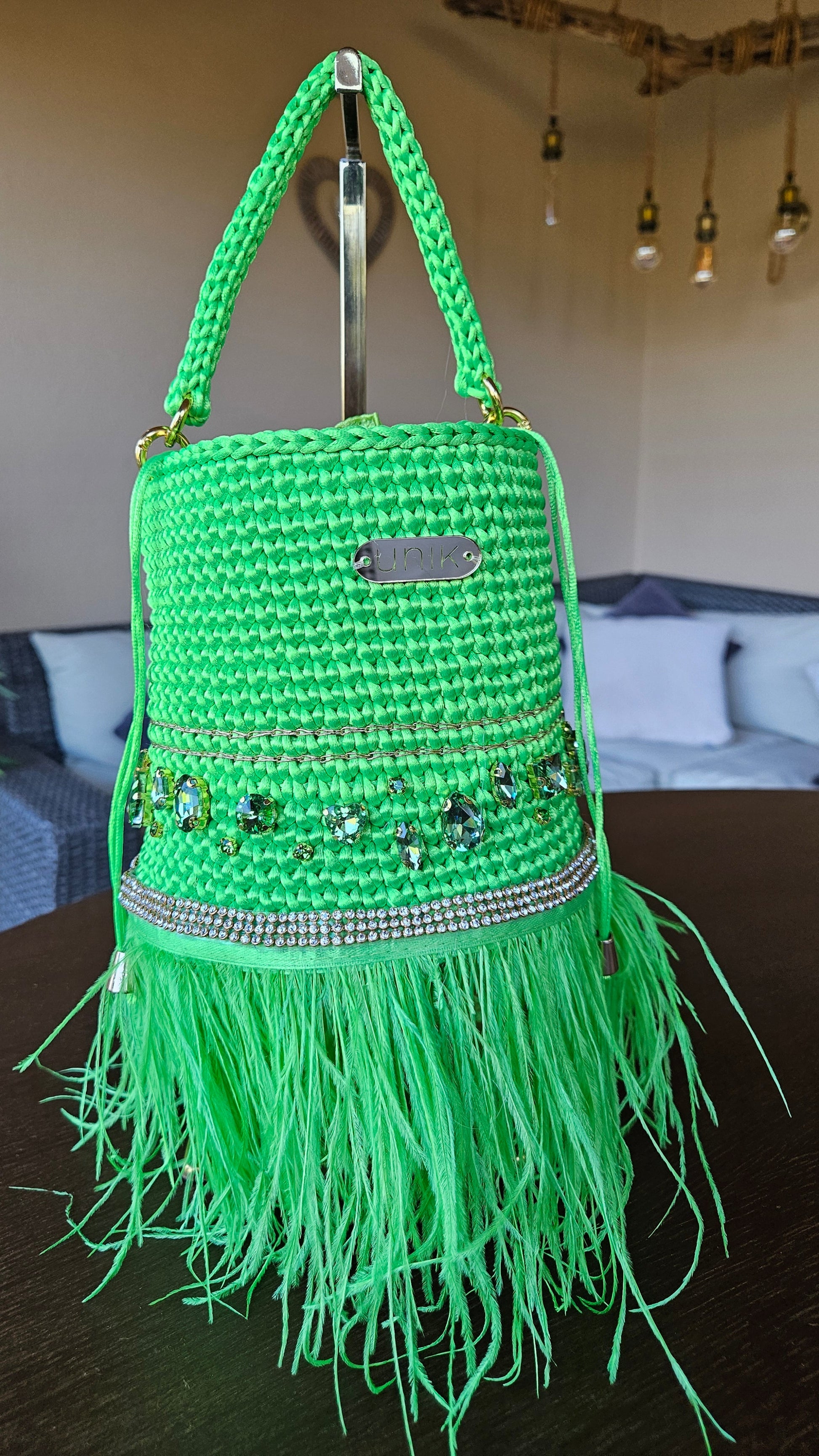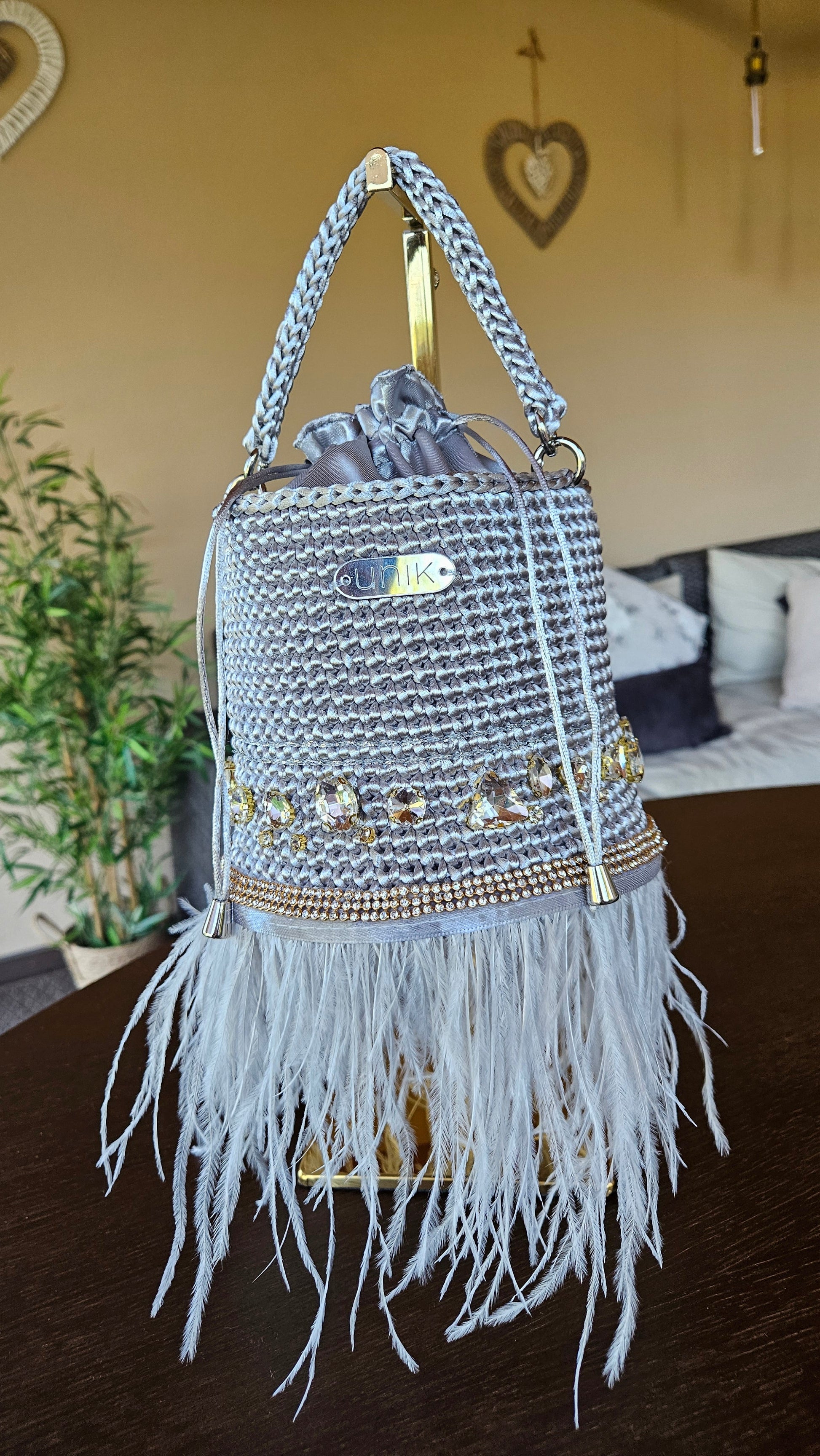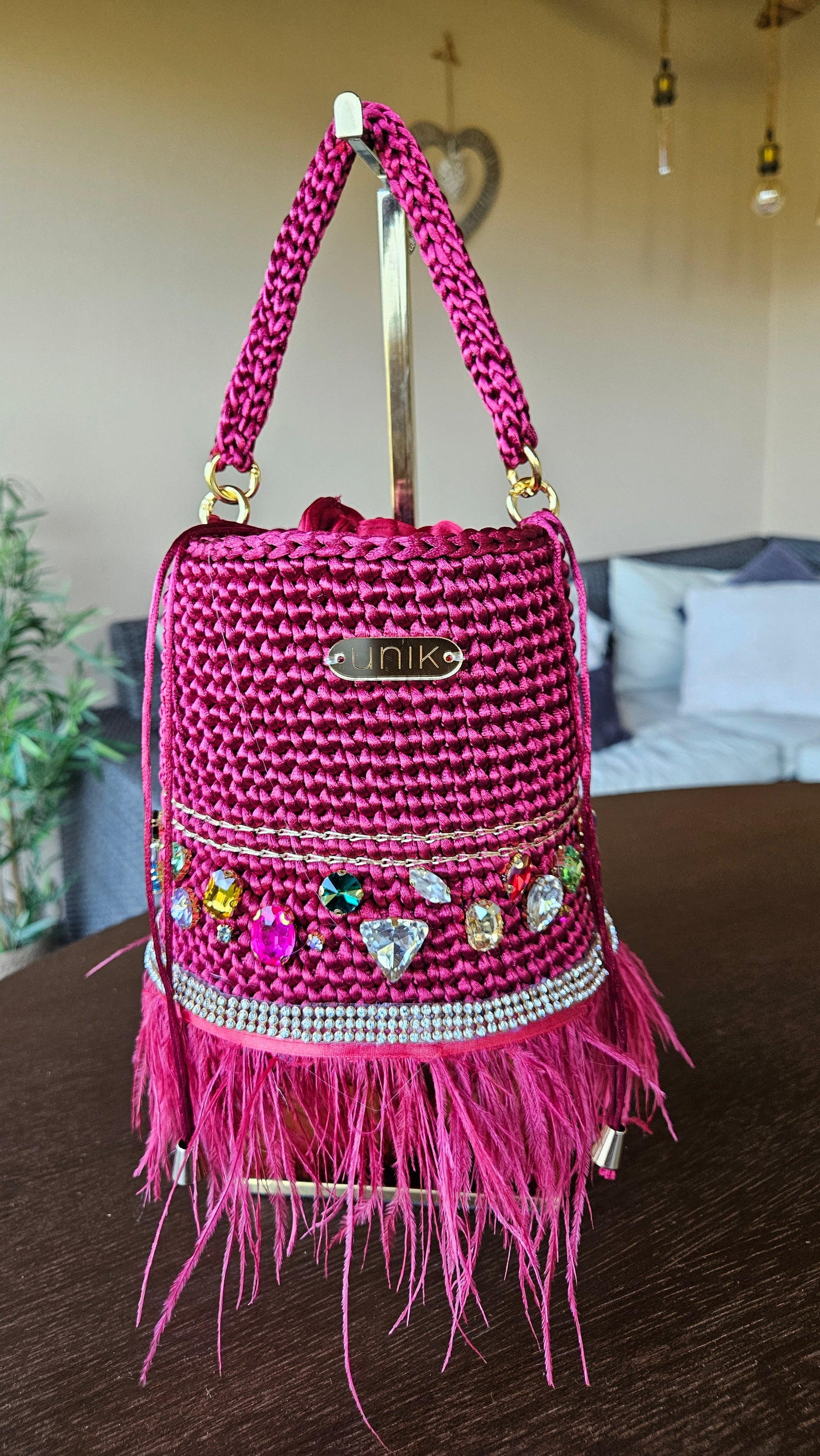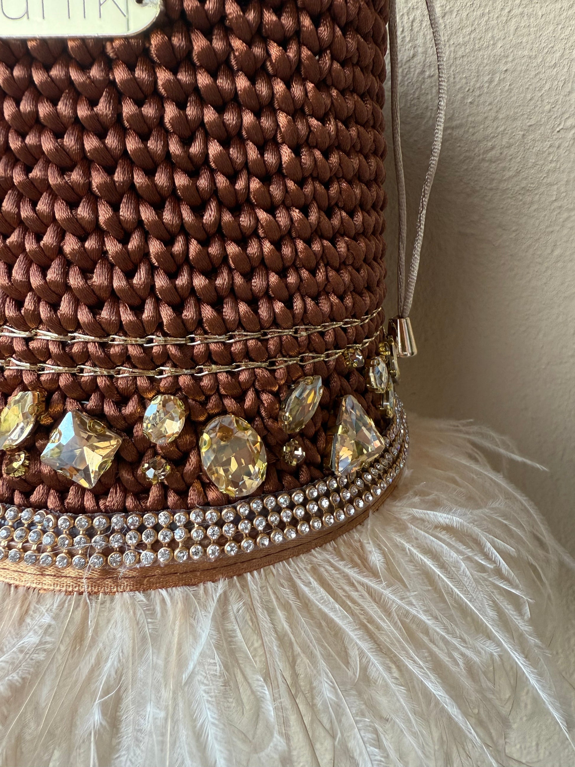 Bolso de ganxet amb forma de con, teixit a mà amb fil marró i un disseny pensat per destacar per la seva elegància i originalitat. La seva estructura còmoda i lleugera el converteix en l’accessori ideal.