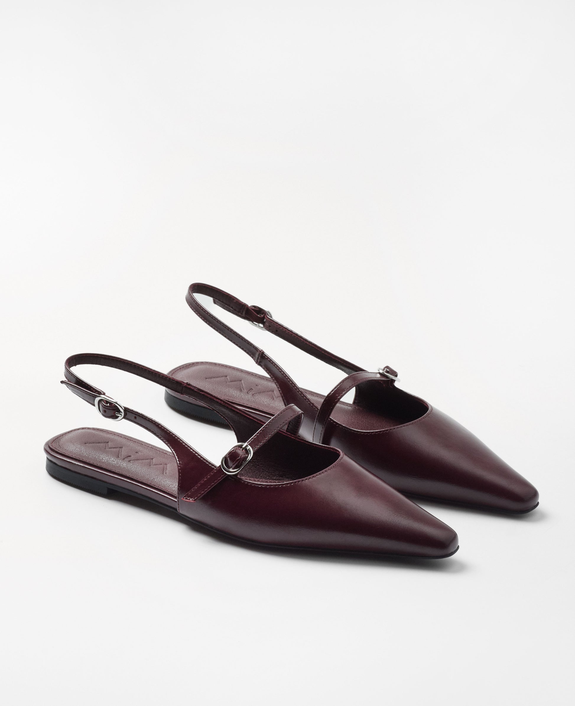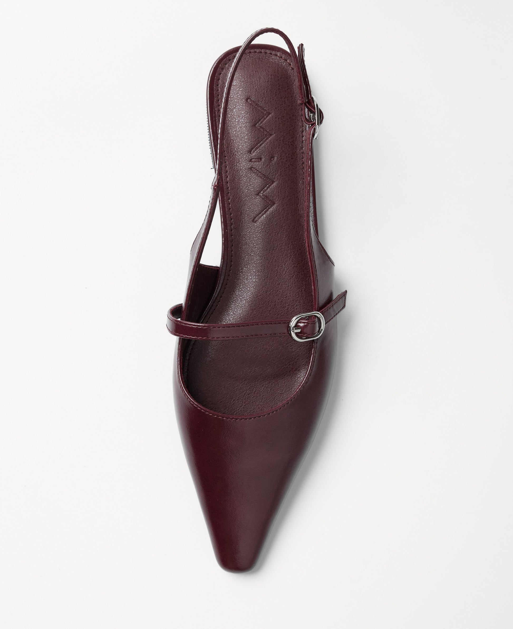 Zapato plano con acabado en punta en color burdeos. Tira en empeine y en parte trasera.