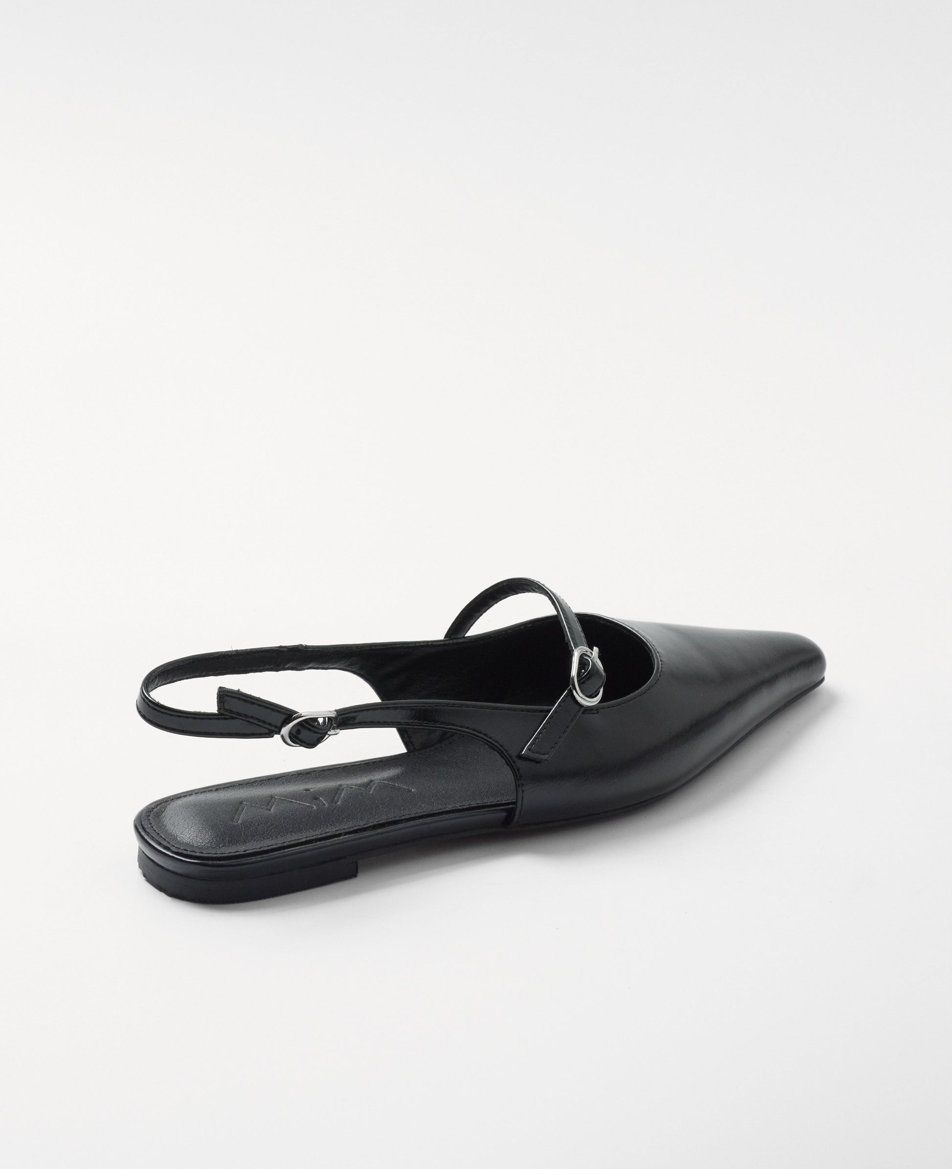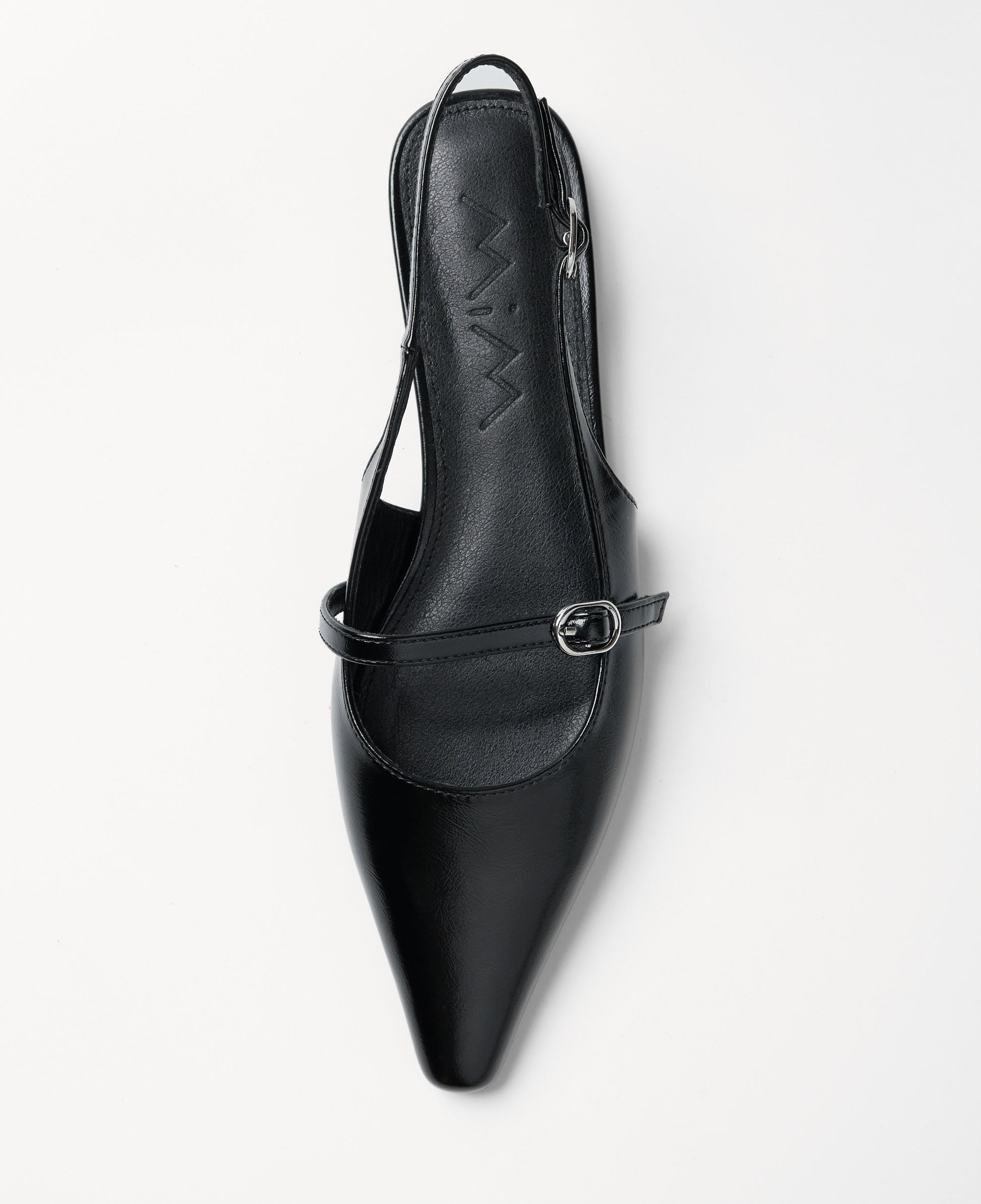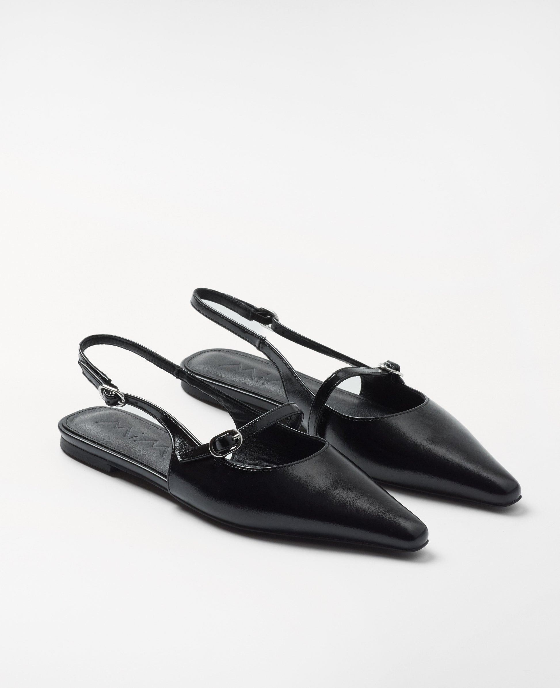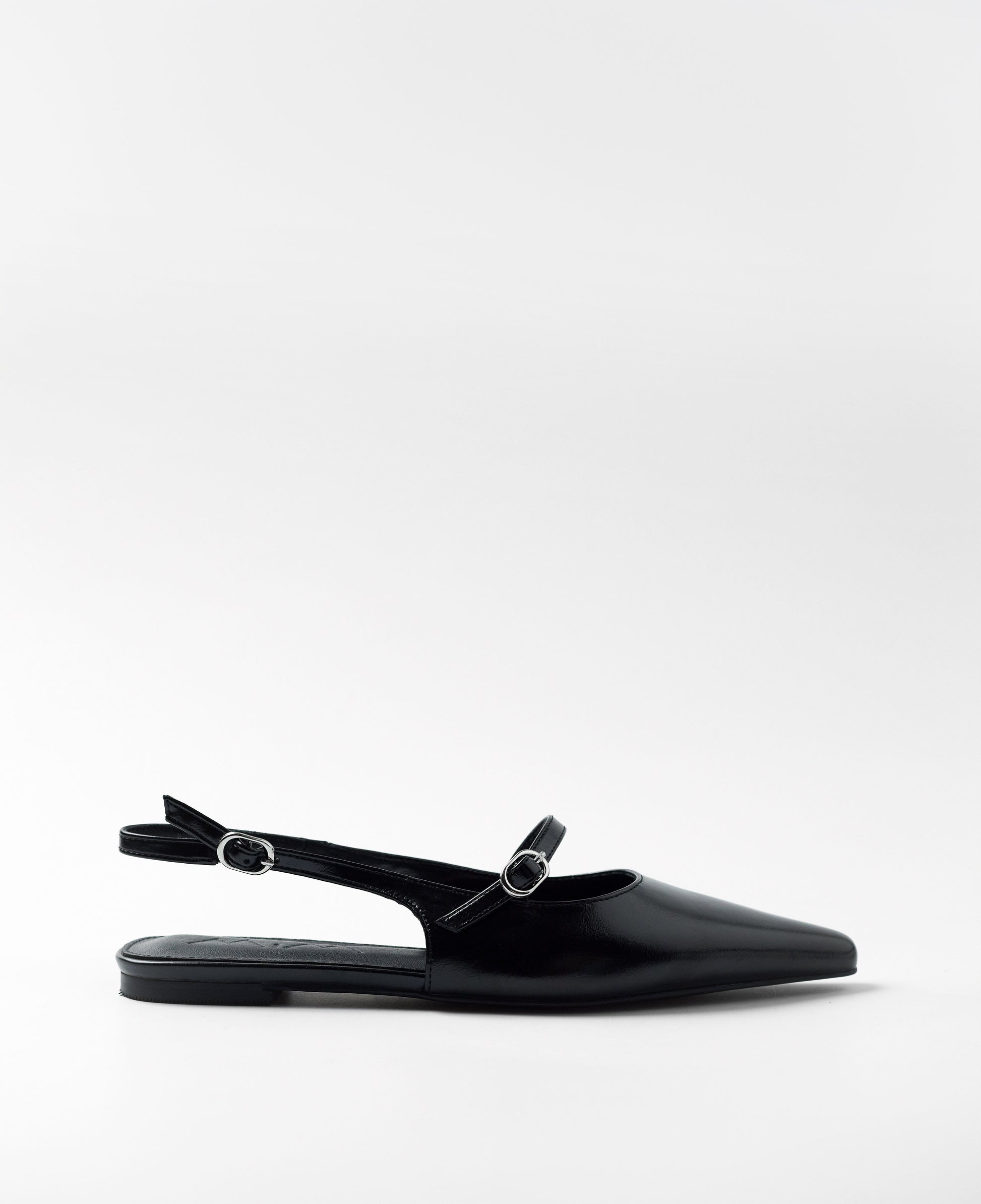 Zapato plano con acabado en punta en color negro. Tira en empeine y en parte trasera.