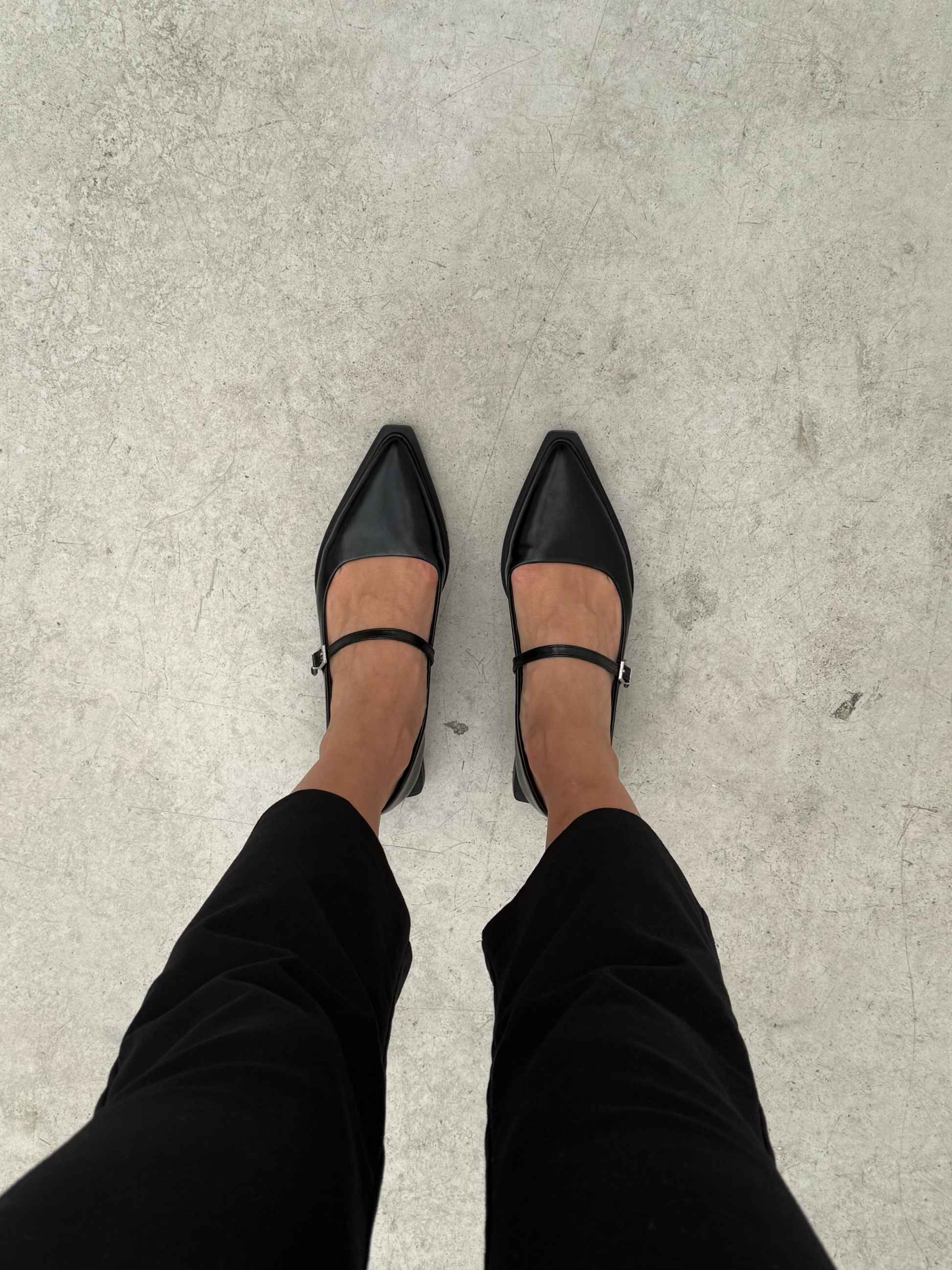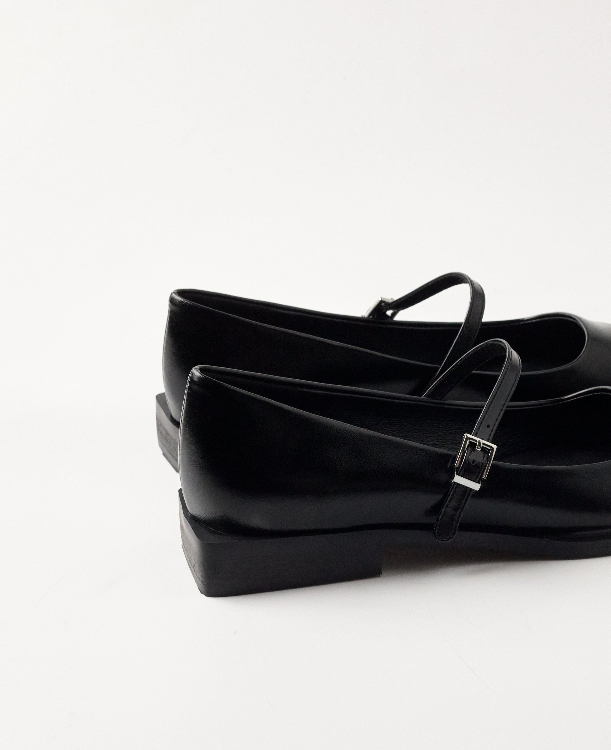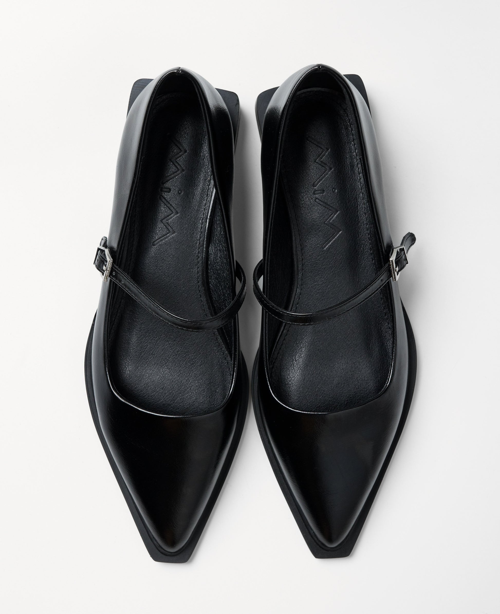 Zapato plano cerrado con acabado en punta en color negro. Cierre con tira en el empeine con hebilla.
