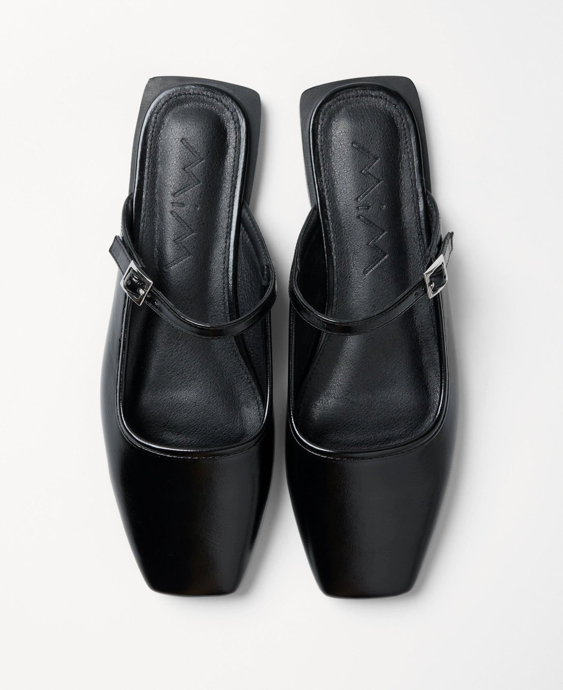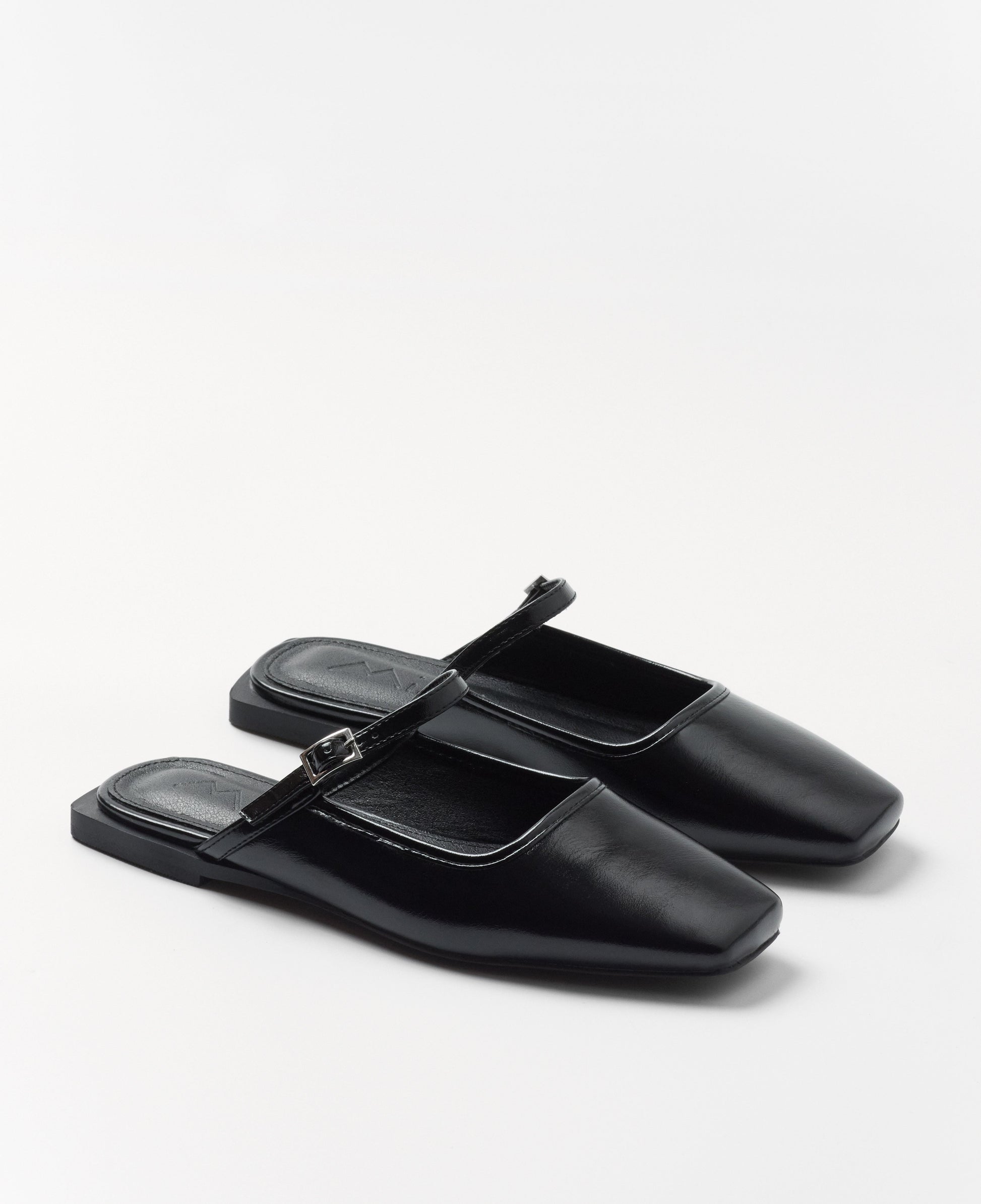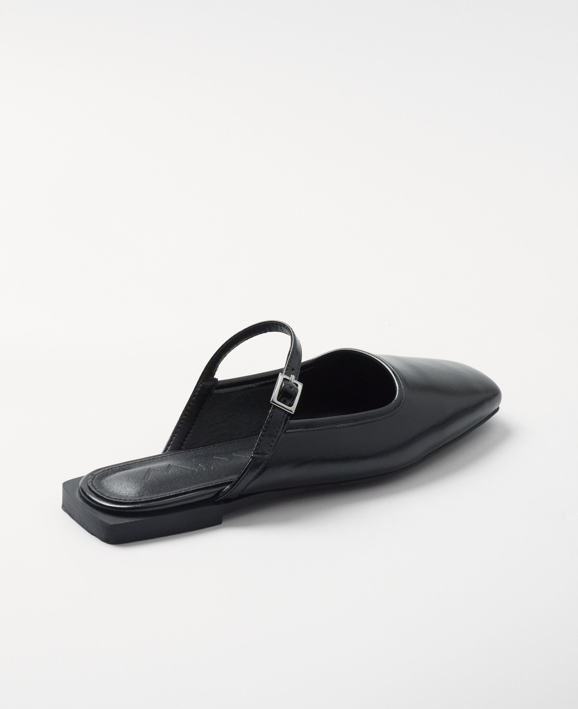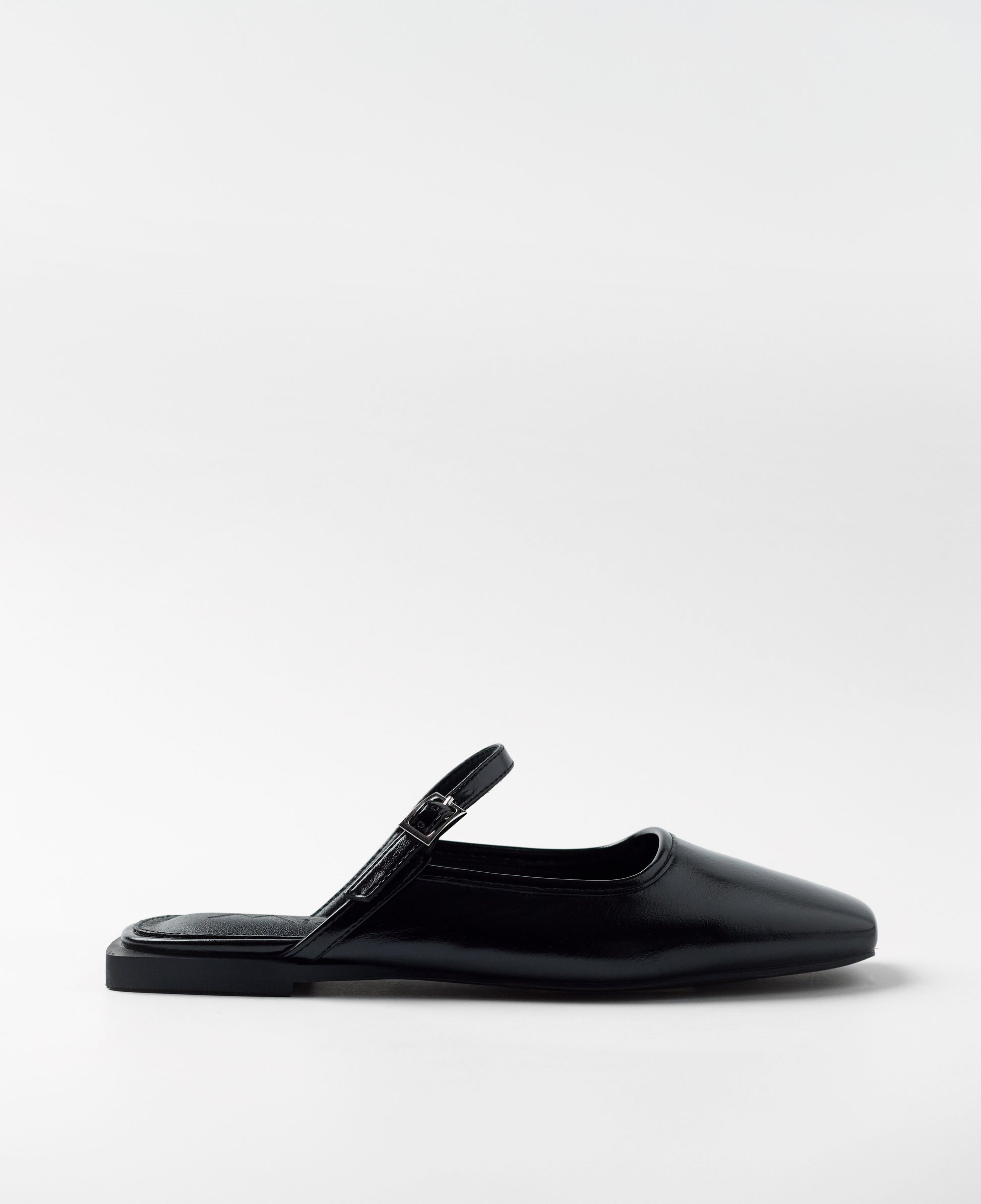 Zapato plano tipo mule con puntera cuadrada en color negro. Detalle de tira empiene.
