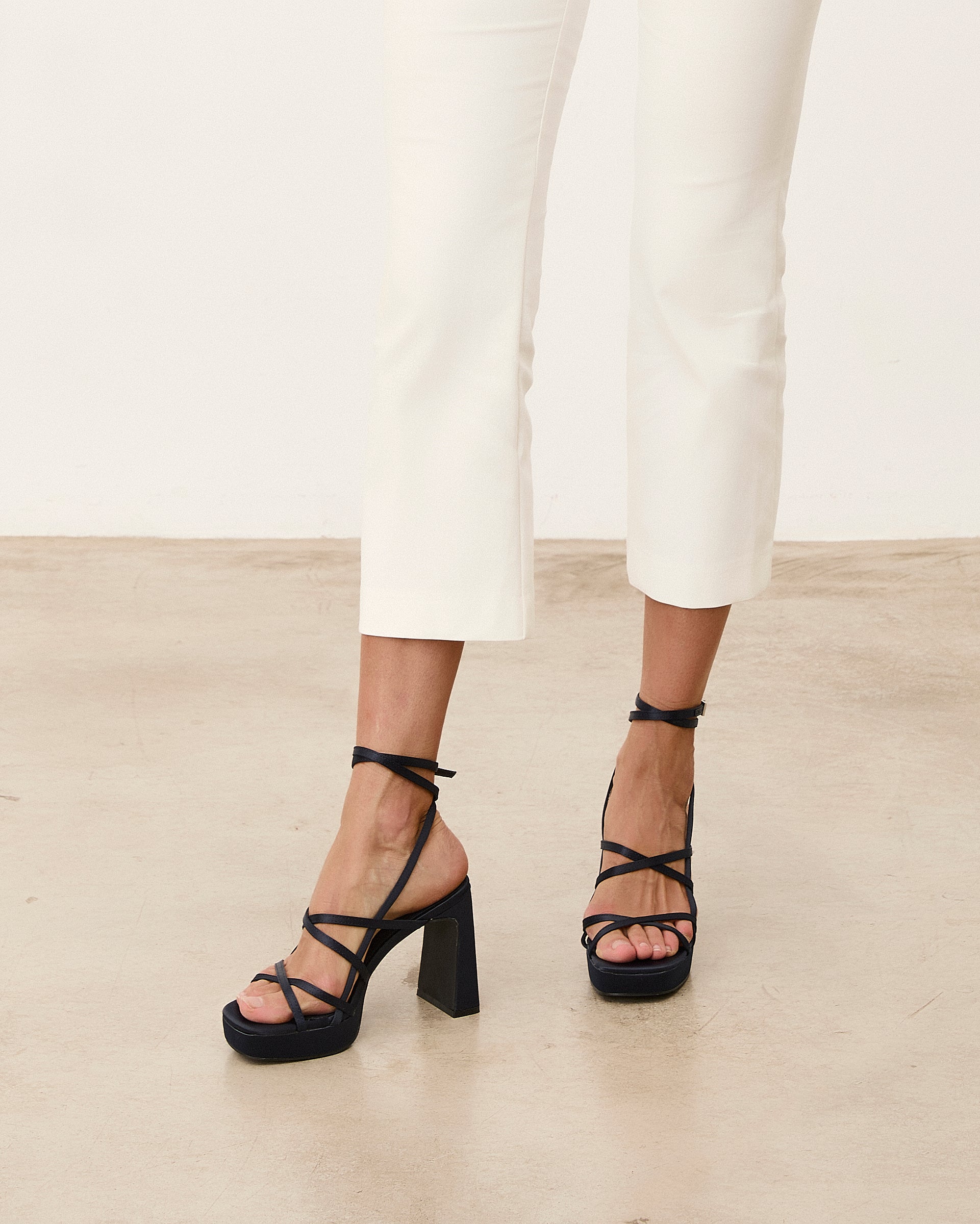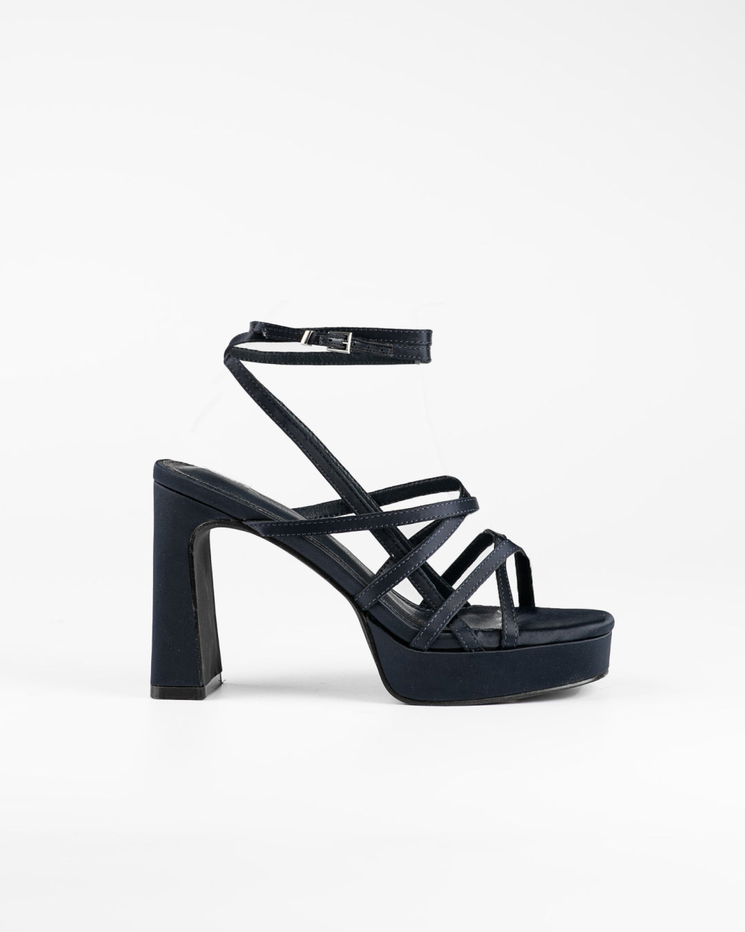 Sandalia de tacón y plataforma en satín color azul marino. Parte delantera abierta con varias tiras asimétricas y tacón rectangular. Cierre en tiras al tobillo con hebilla metálica.