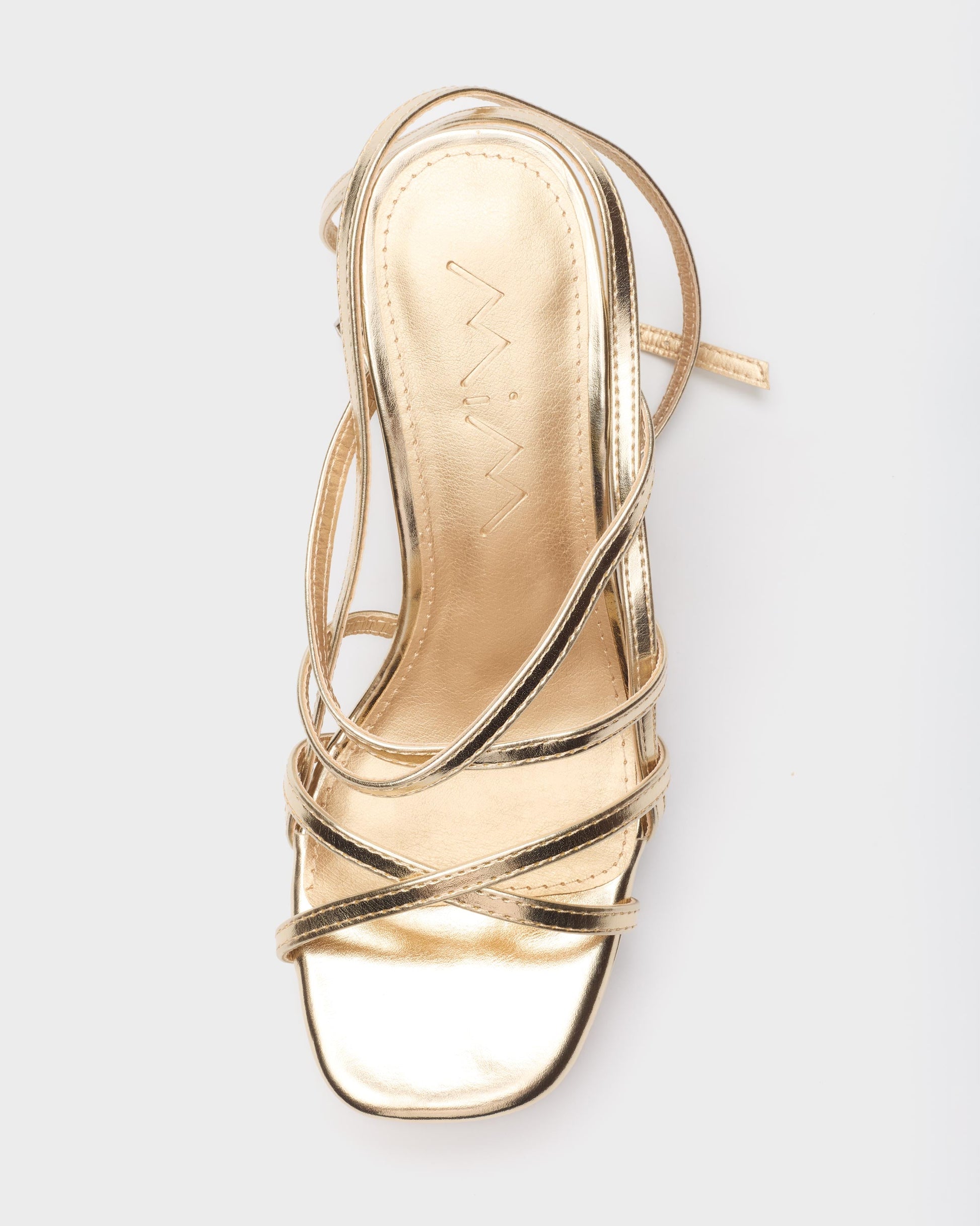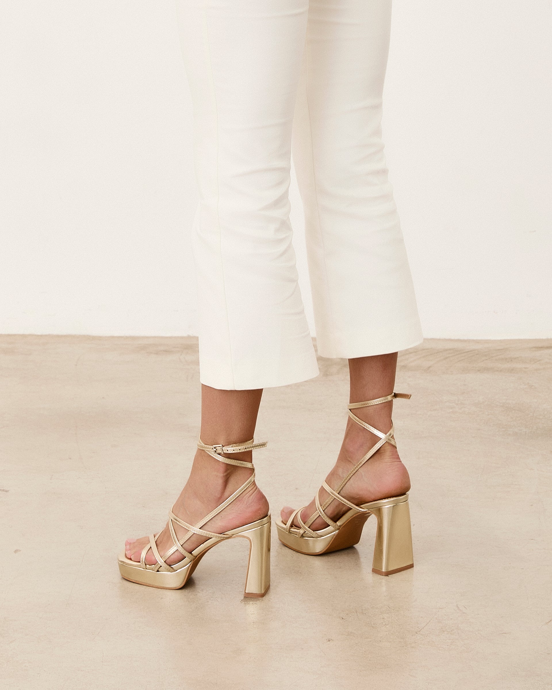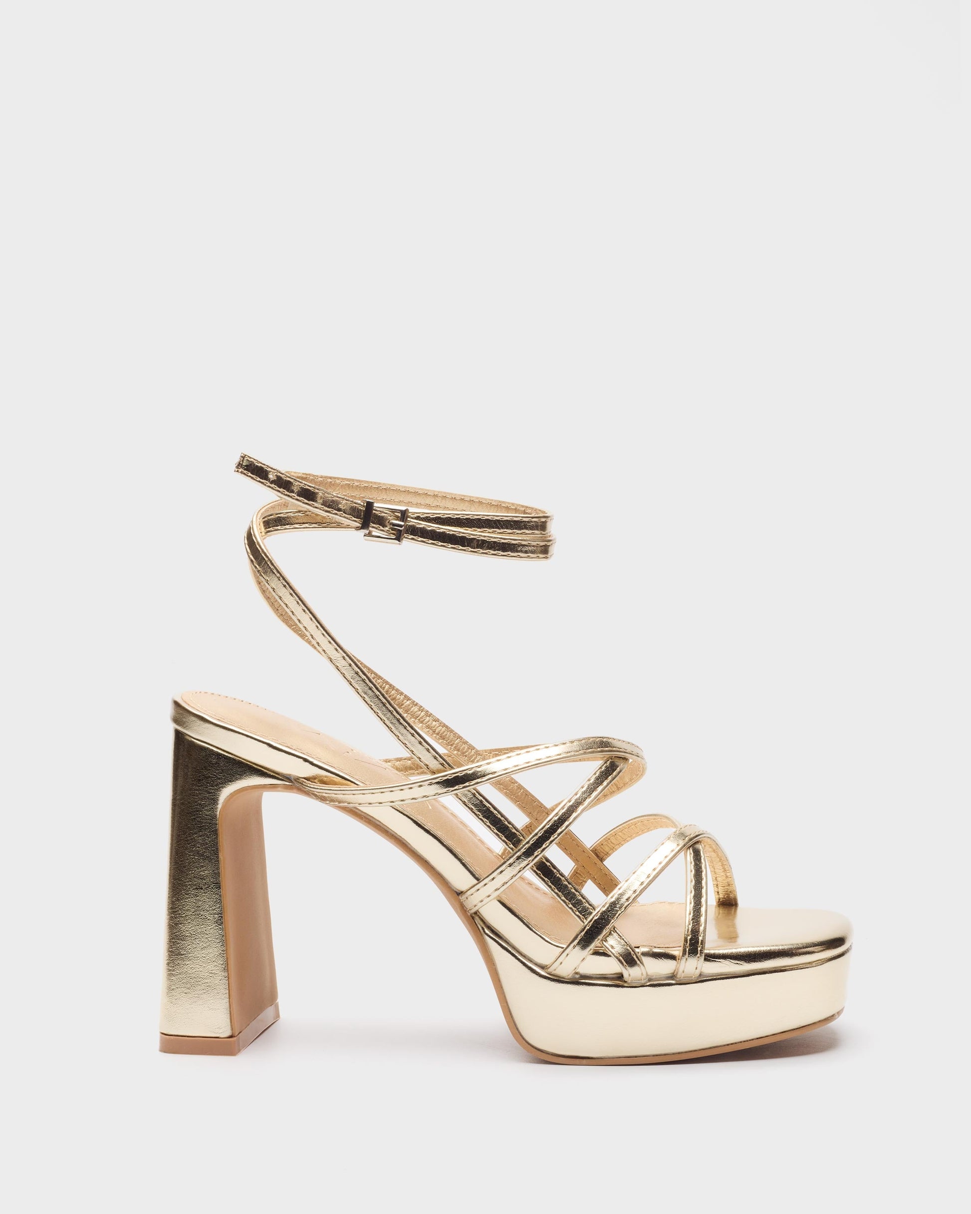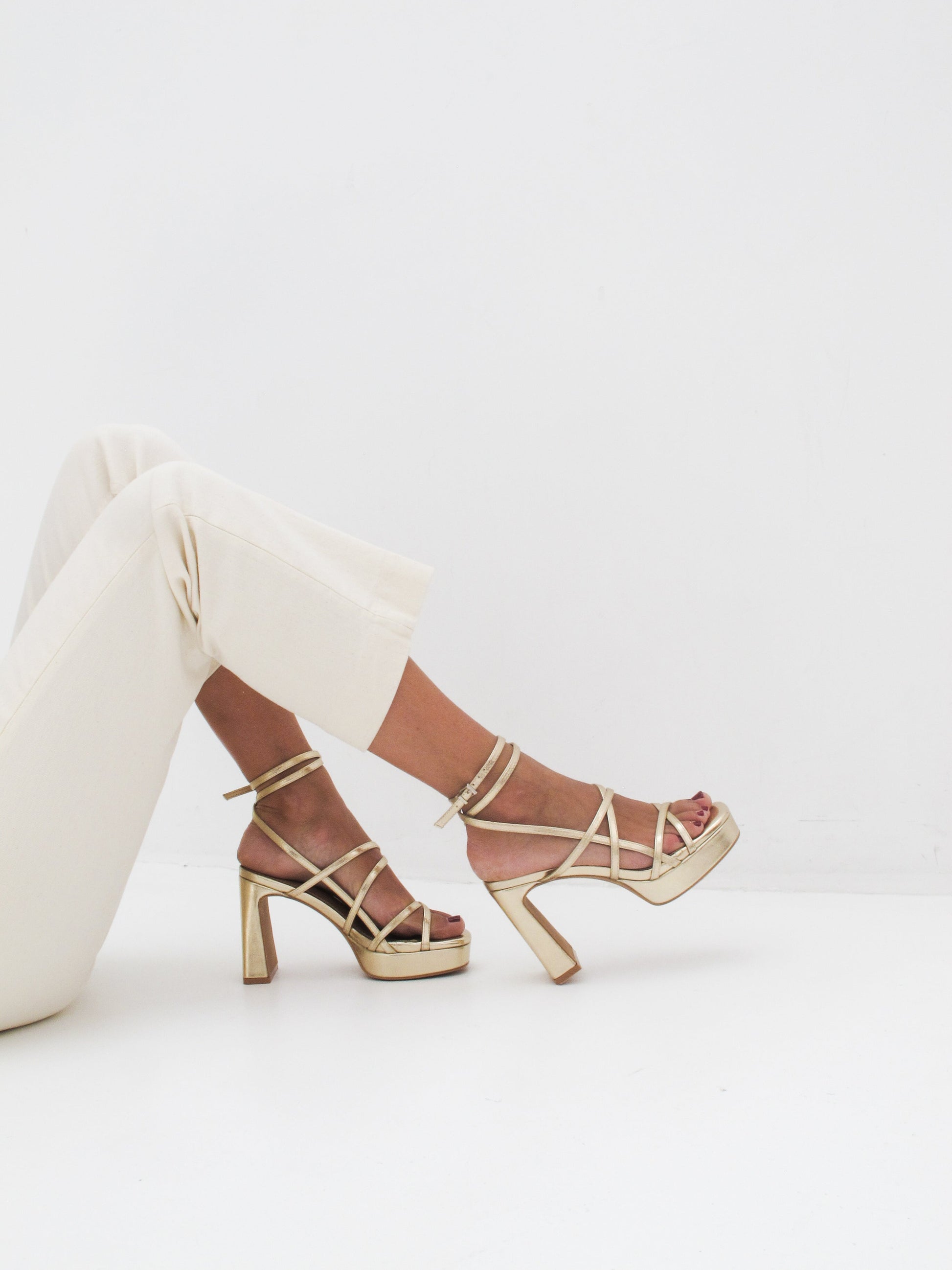 Sandalia de tacón y plataforma color dorado brillante. Parte delantera abierta con varias tiras asimétricas y tacón rectangular. Cierre en tiras al tobillo con hebilla metálica.