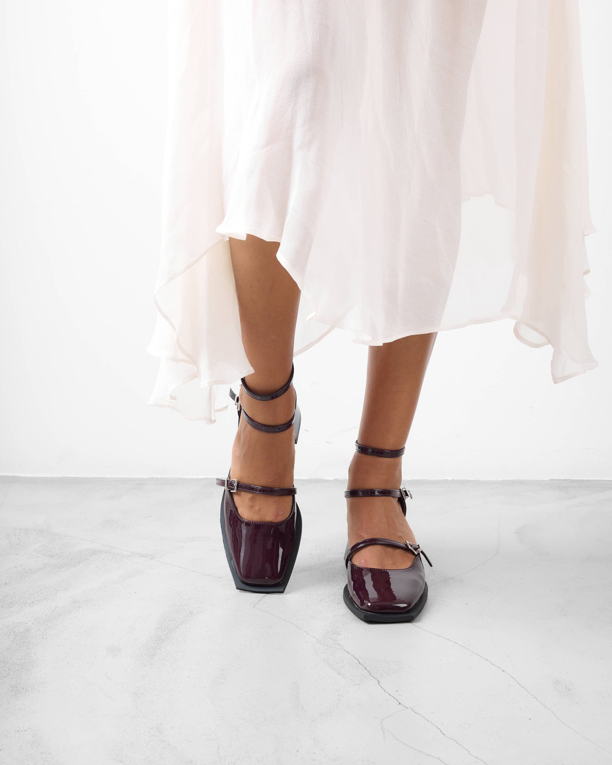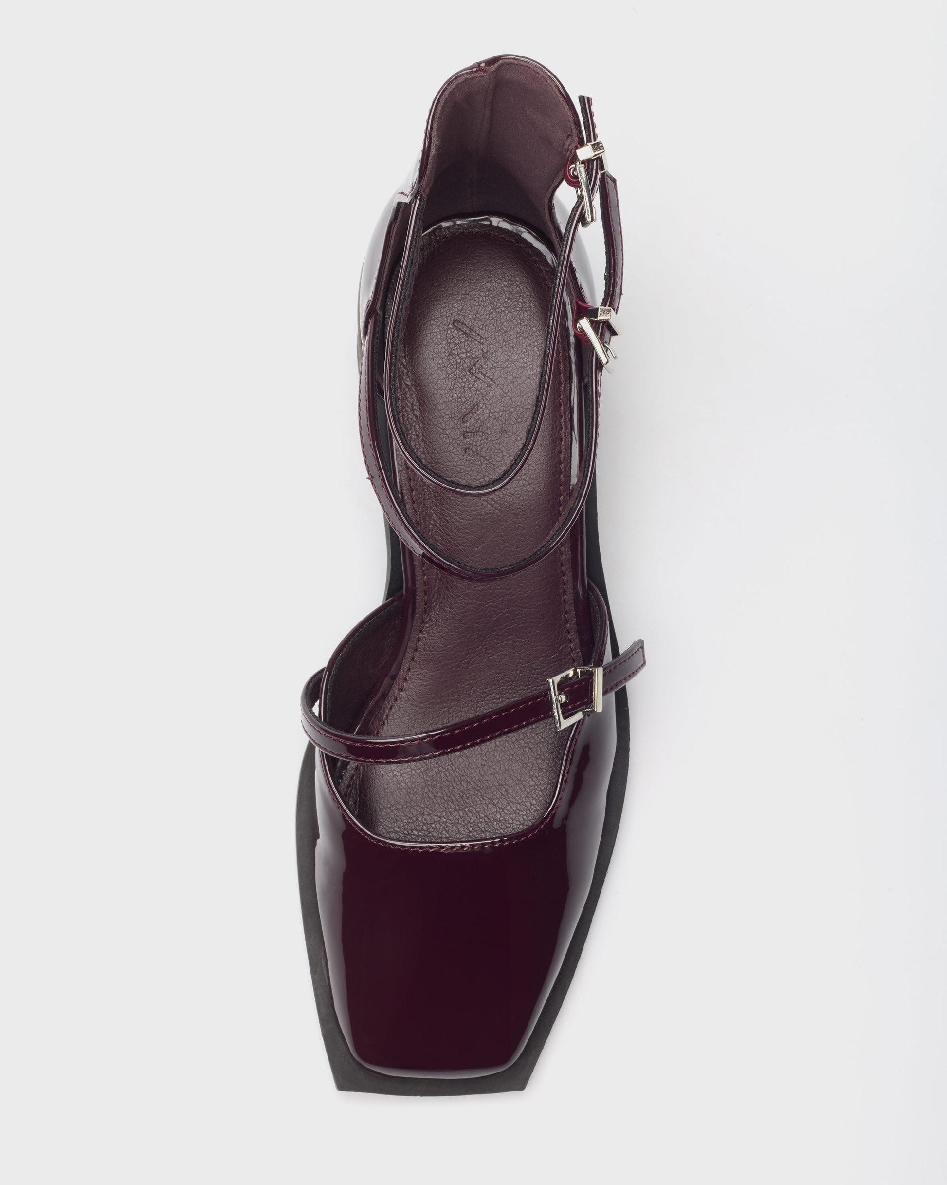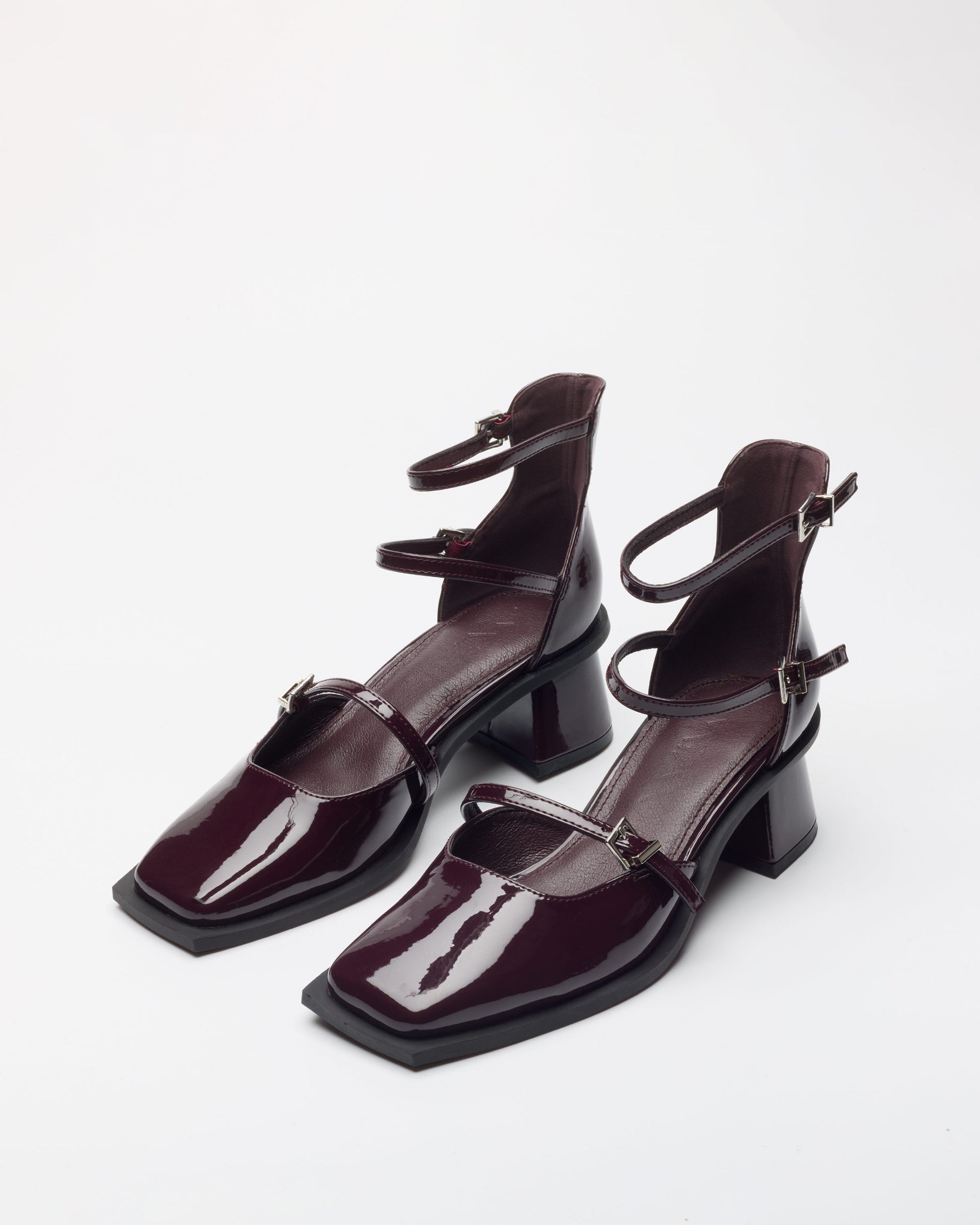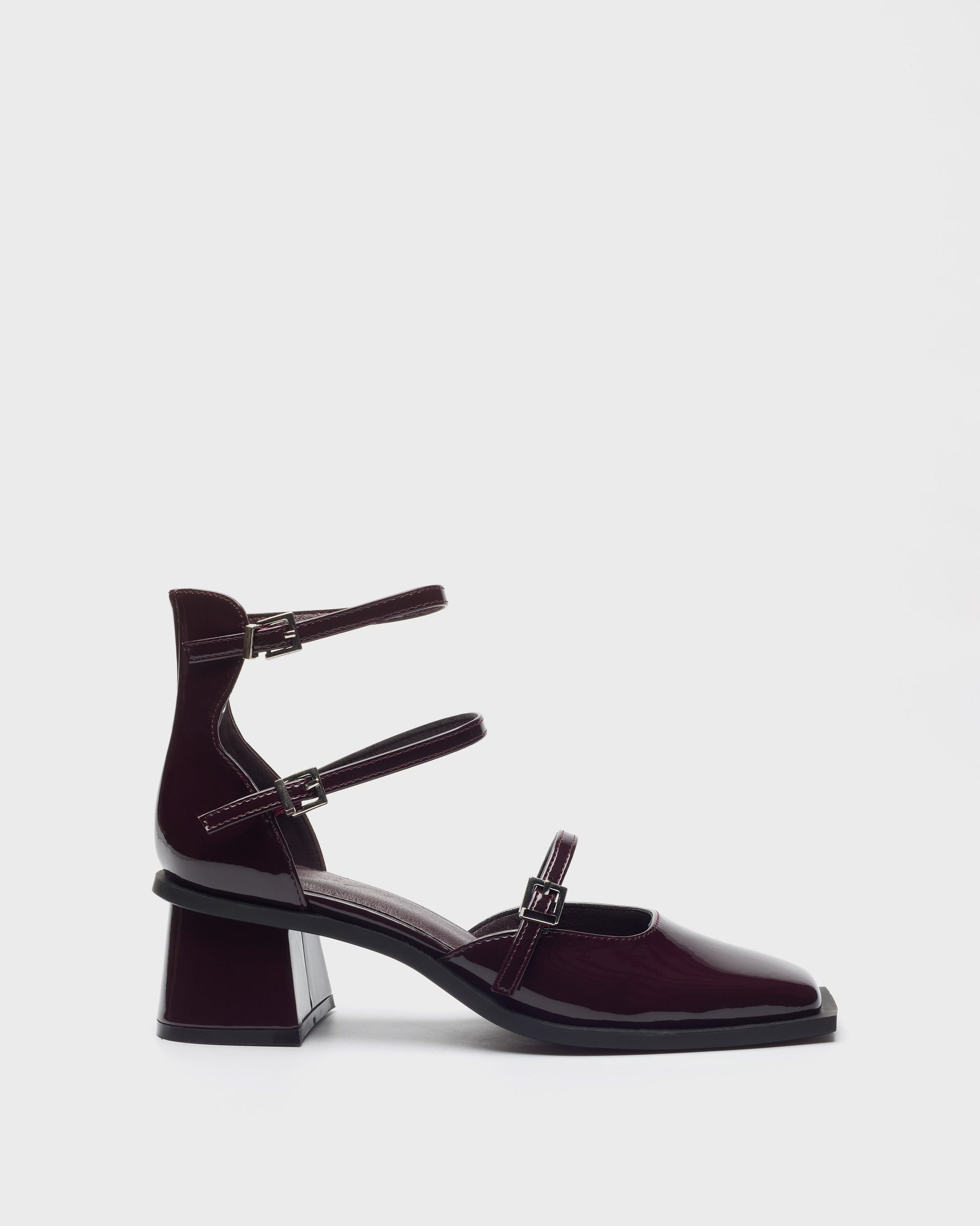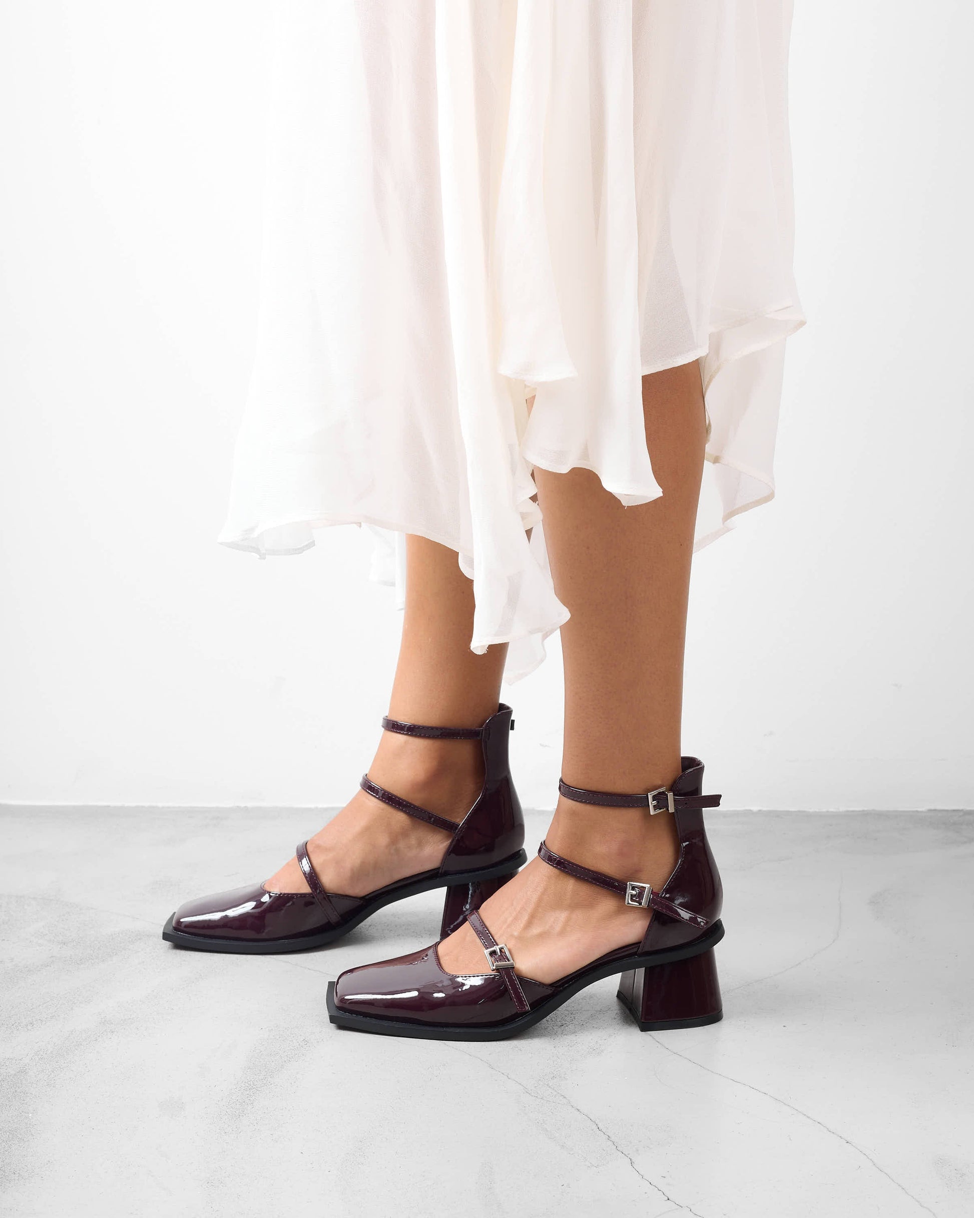 Zapato de tacón cerrado en PU acharolado burdeos. Parte delantera abierta con varias tiras con hebillas a lo largo de empeine y tobillo. Tacón cuadrado. Cierre en tiras al tobillo con hebilla