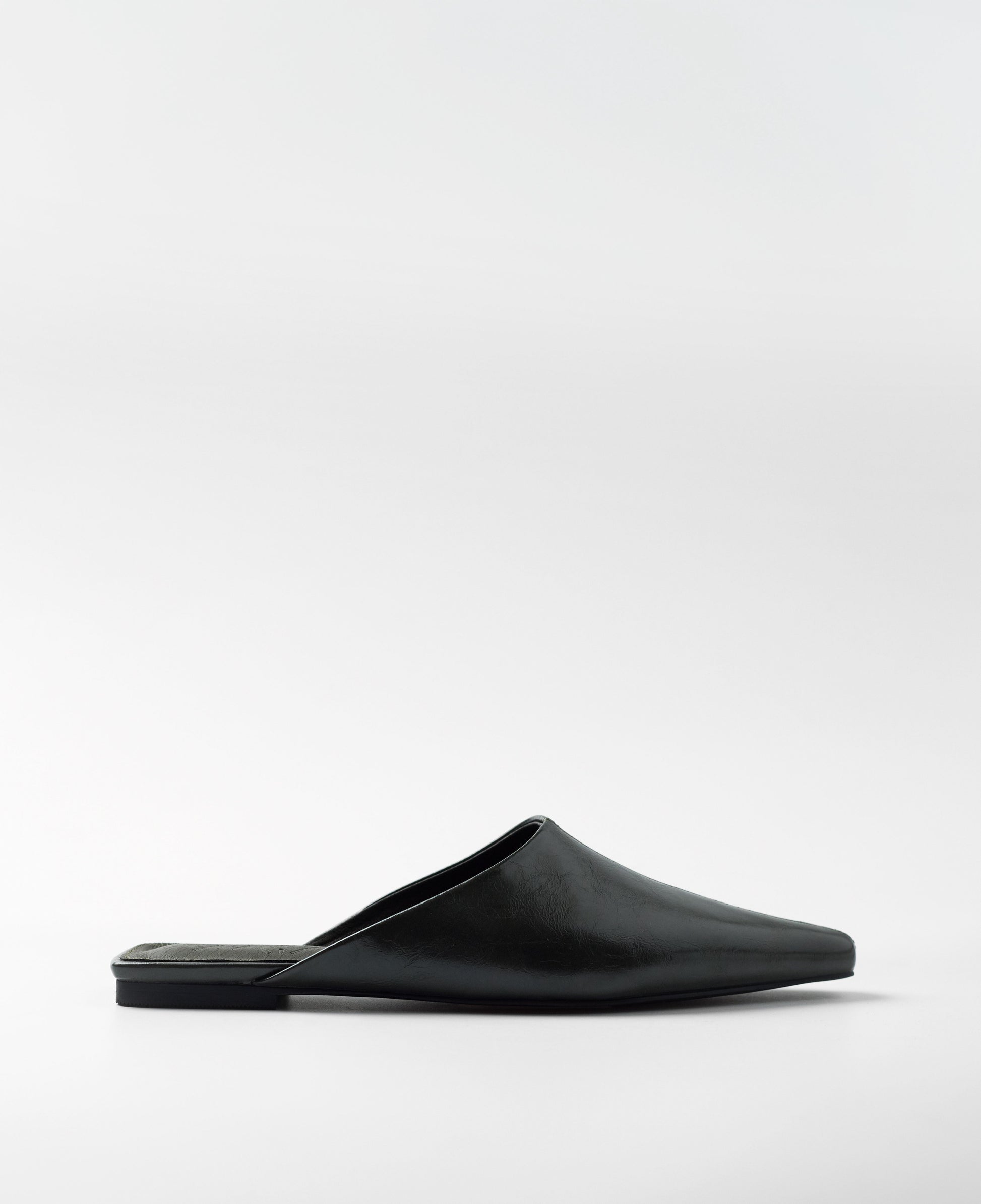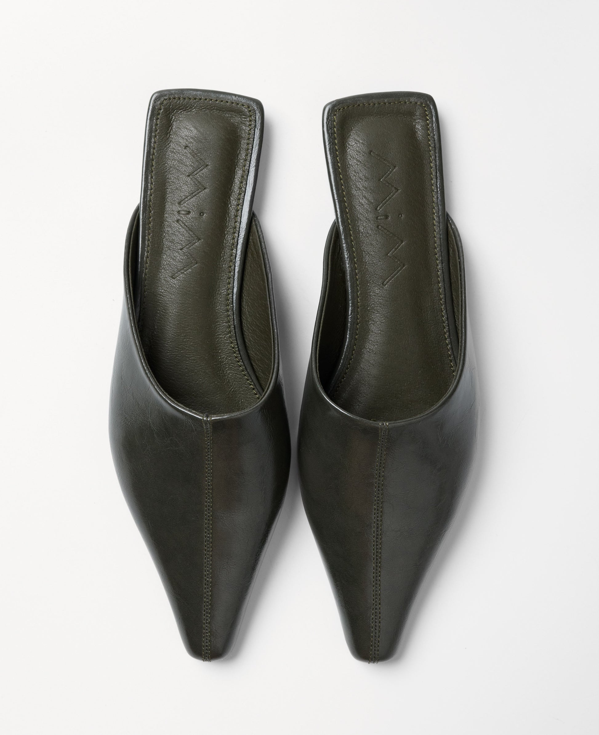 Zapato cerrado tipo mule con acabado en punta en color kaki. Detalle de doble costura central.
