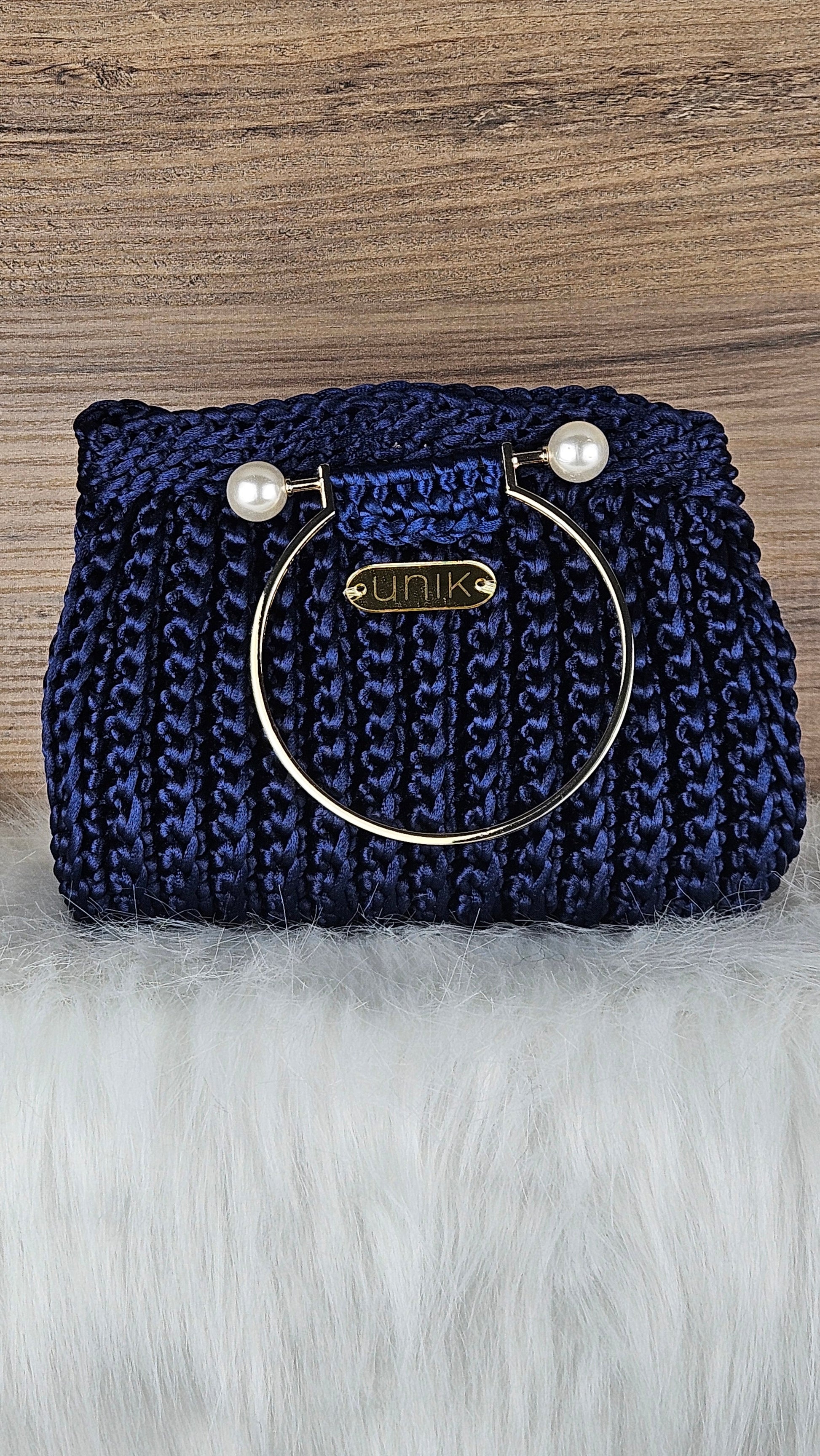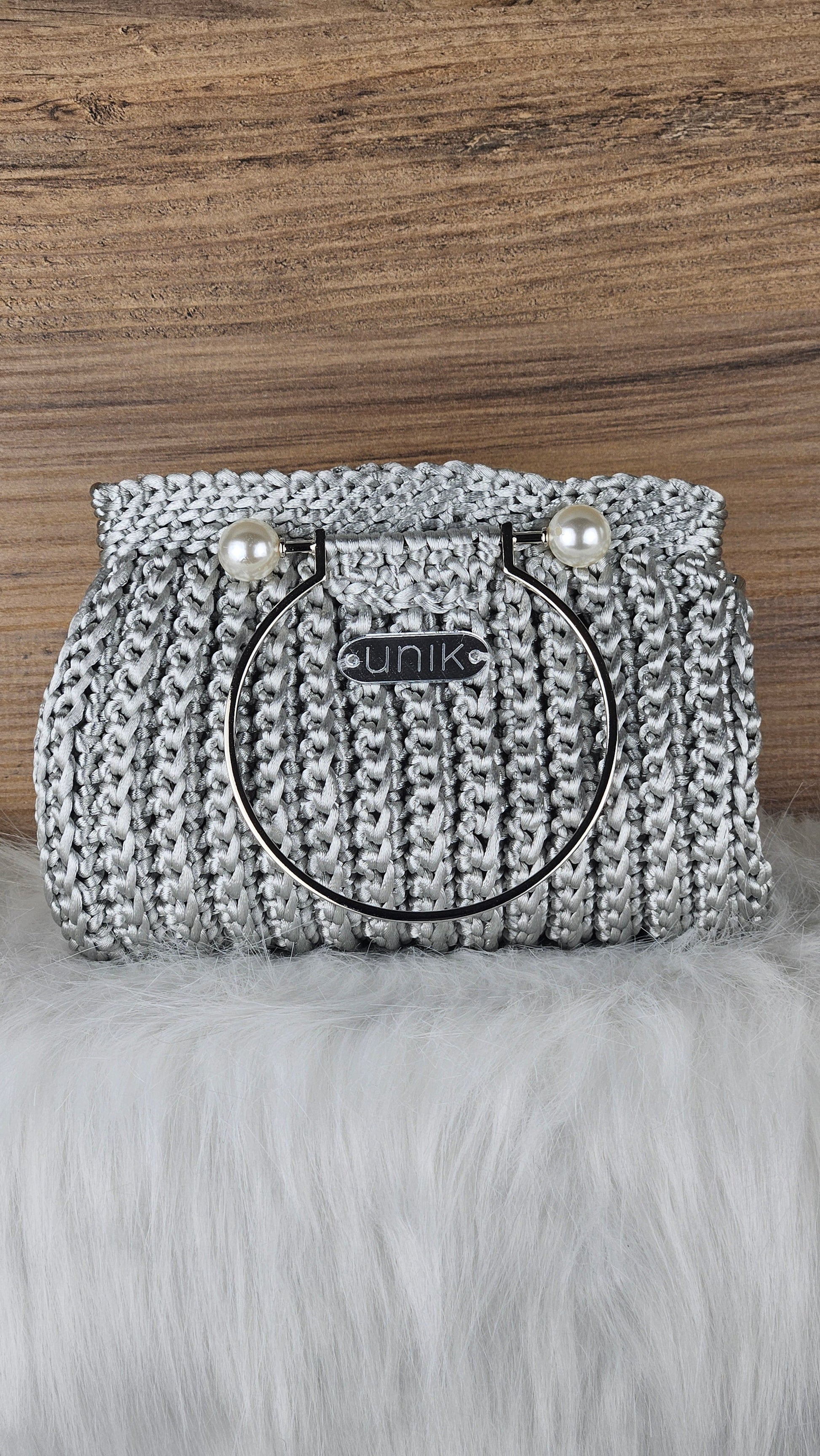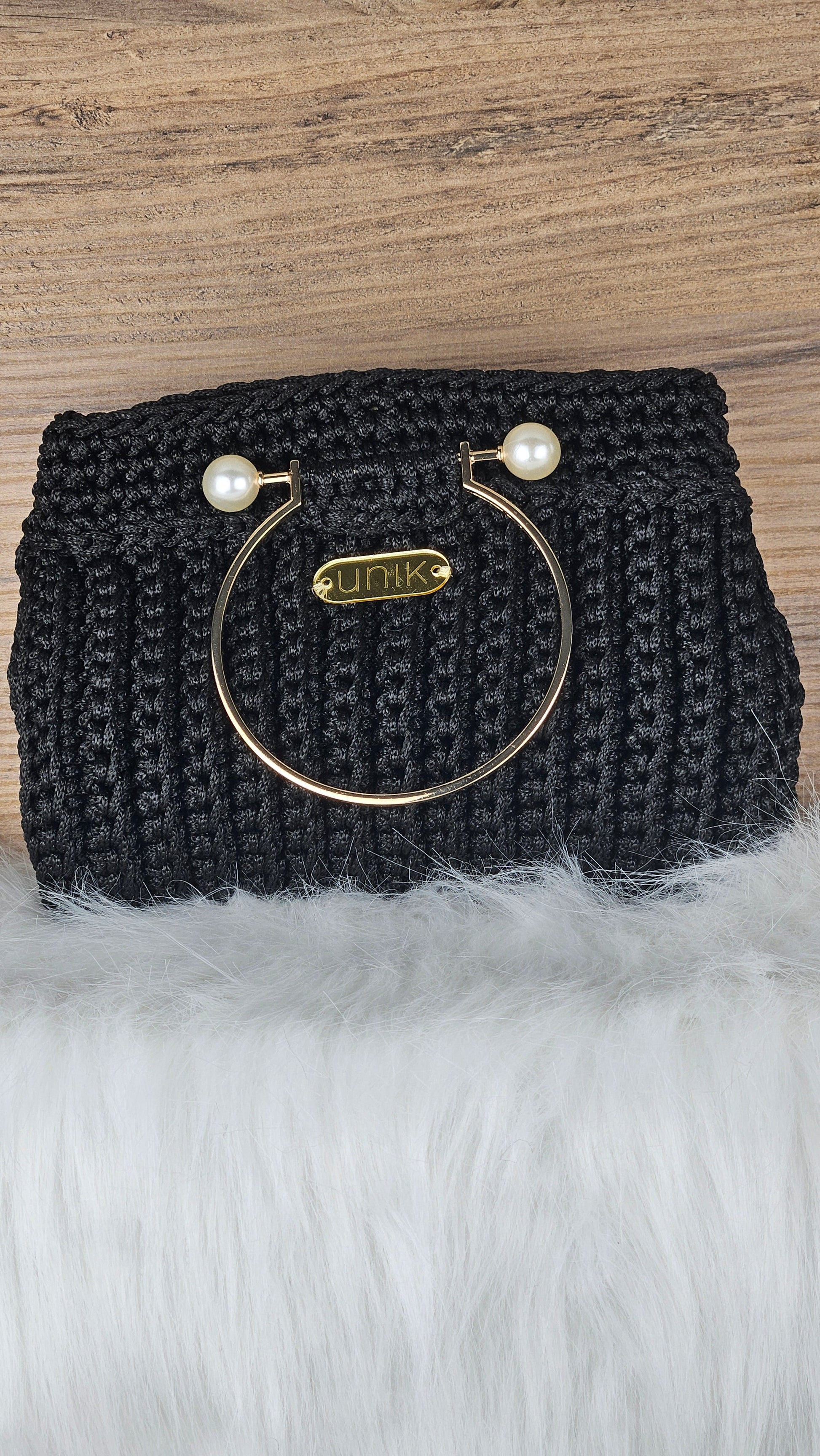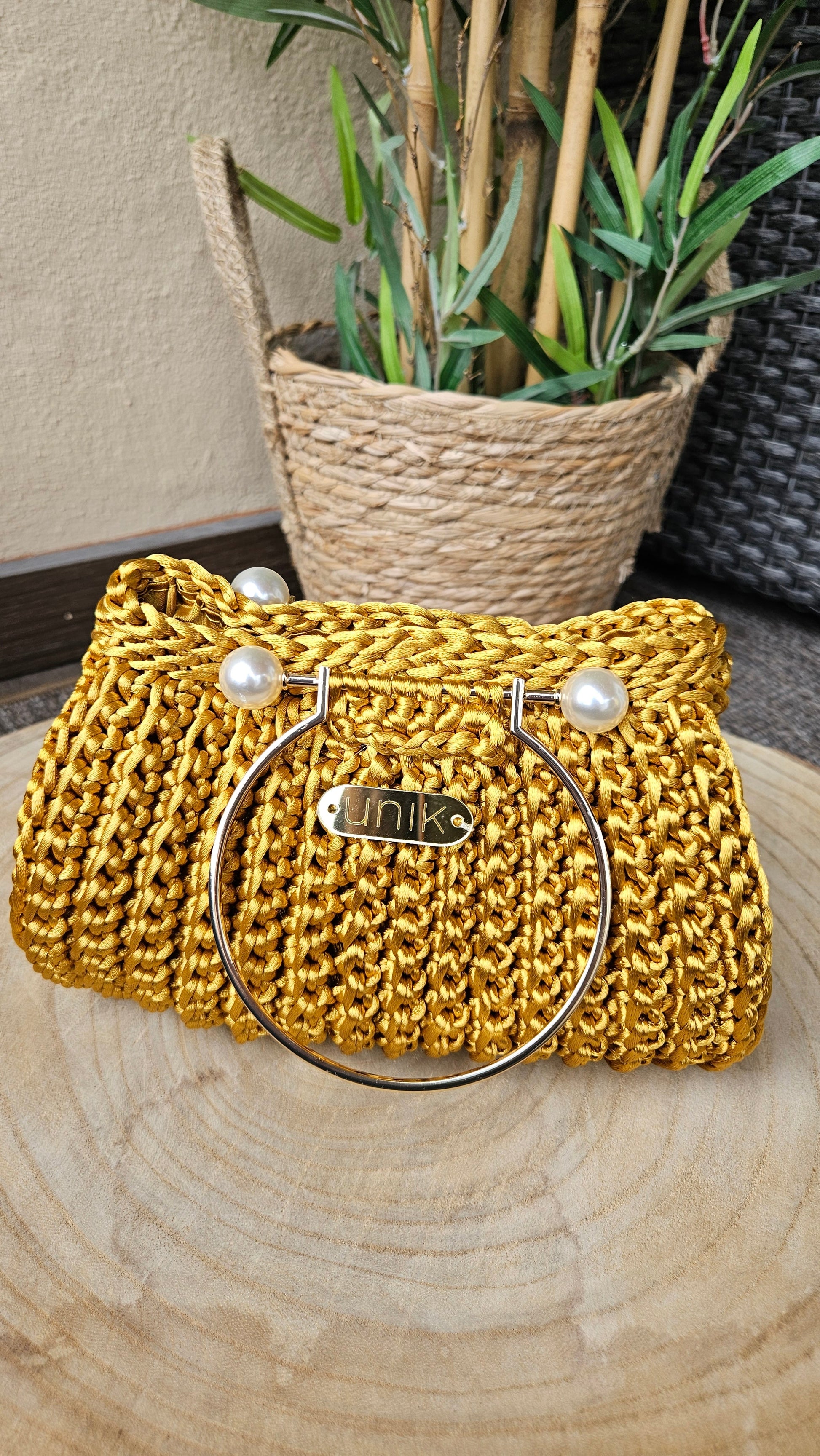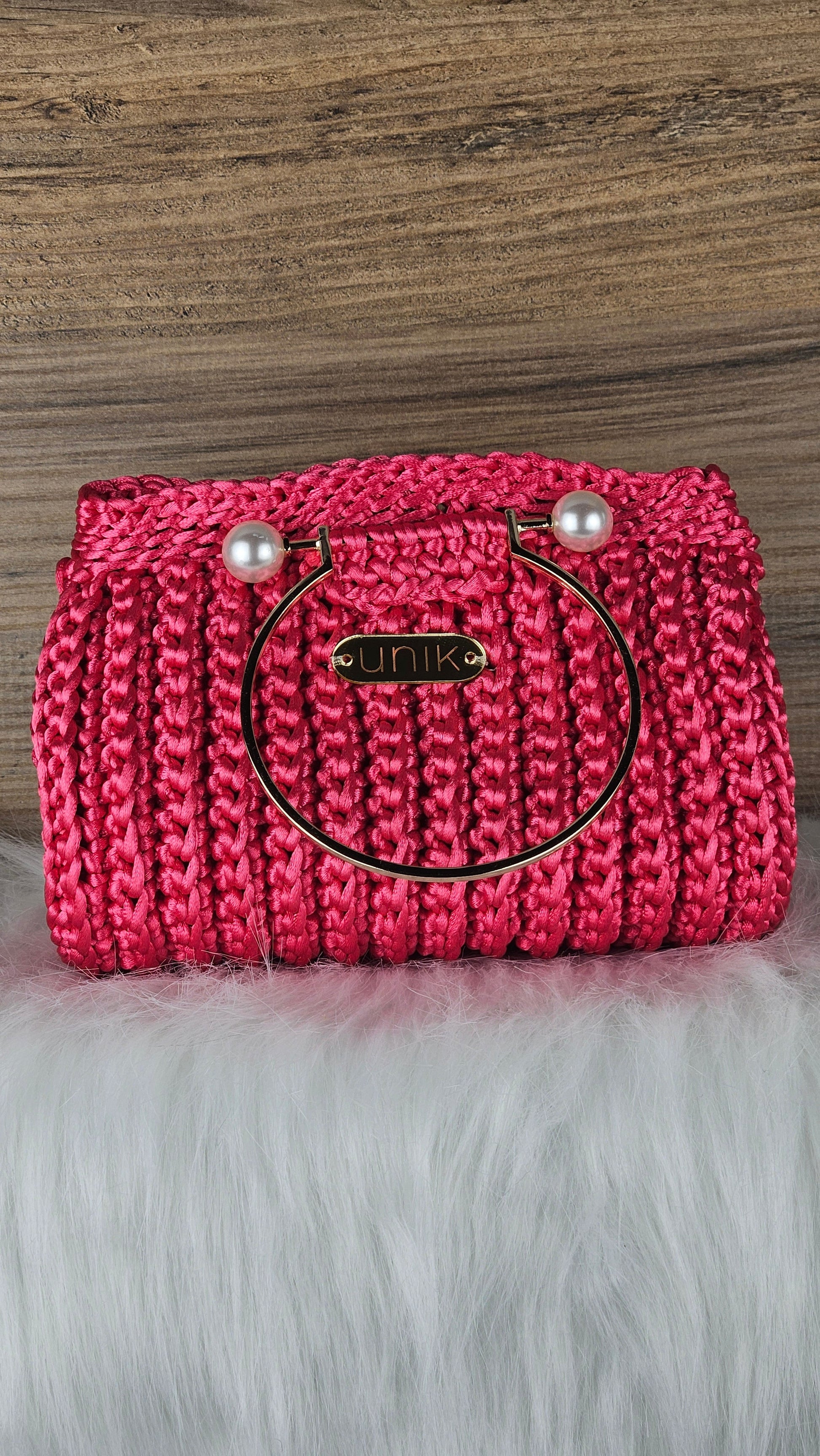 . Mides: 20 x 15 cm · Fil satinat · Folre interior satinat · Botó magnètic · 2 nanses metàl·liques daurades amb perles decoratives · Cadena metàl·lica daurada · Etiqueta Unik |