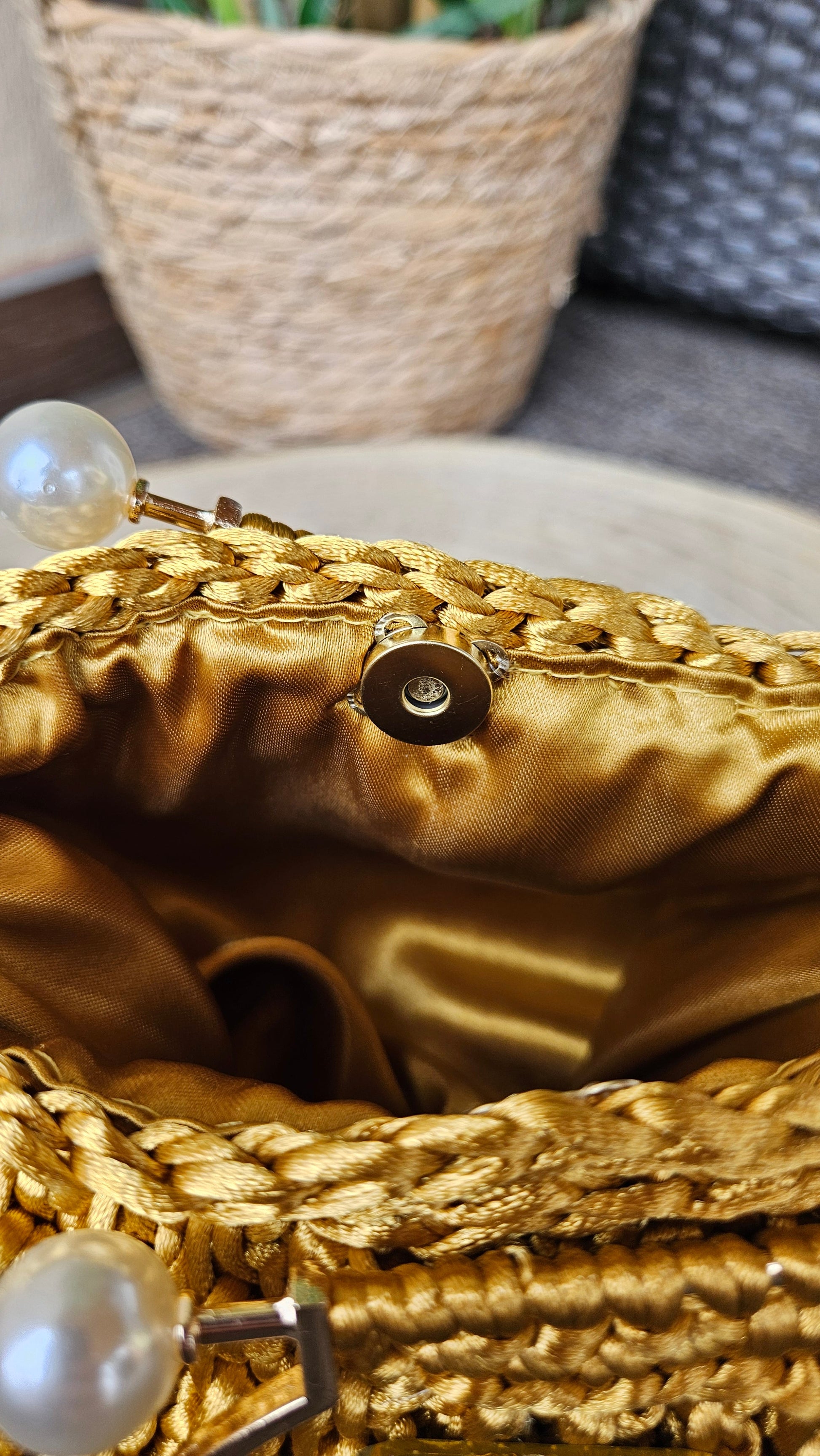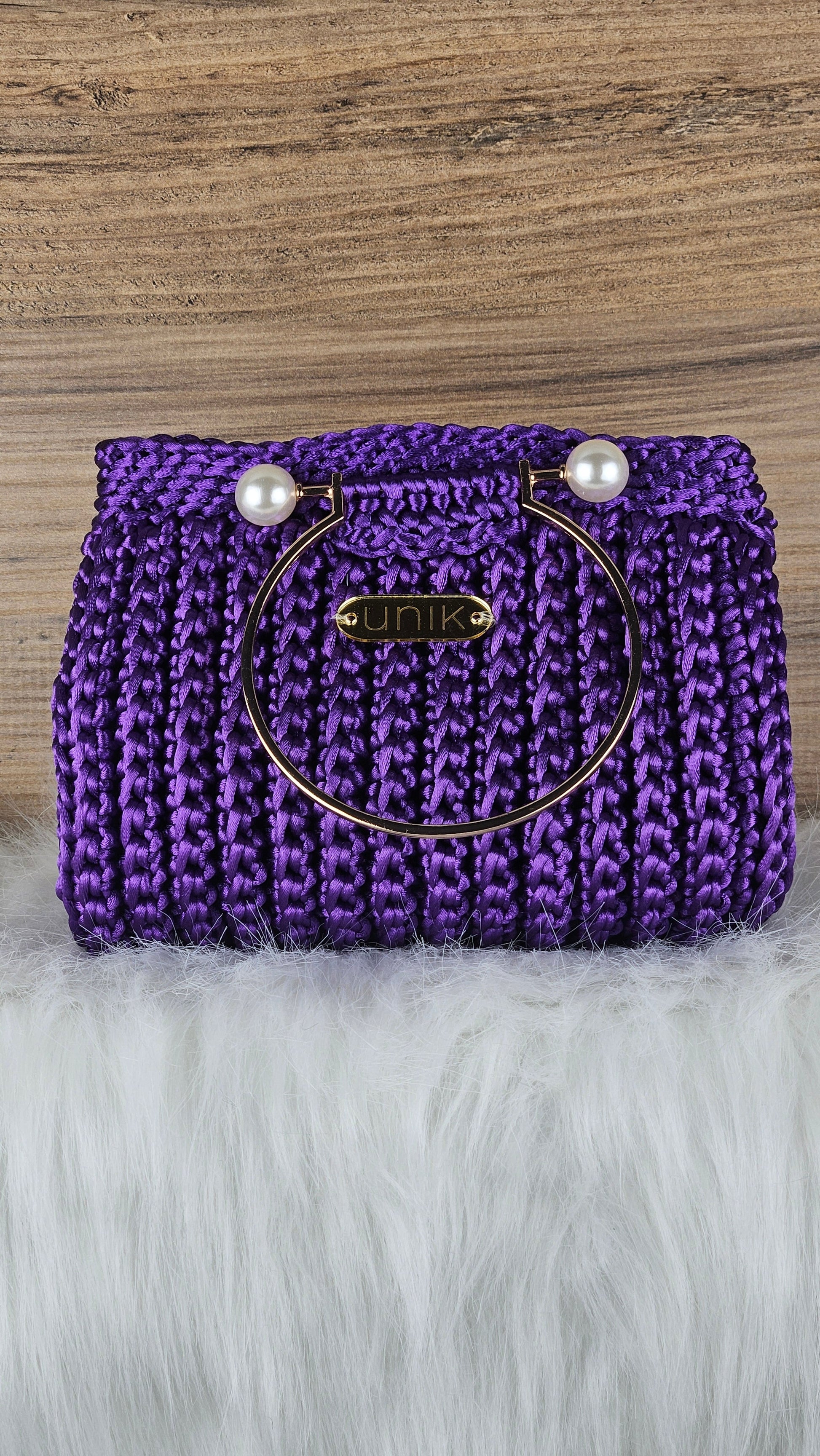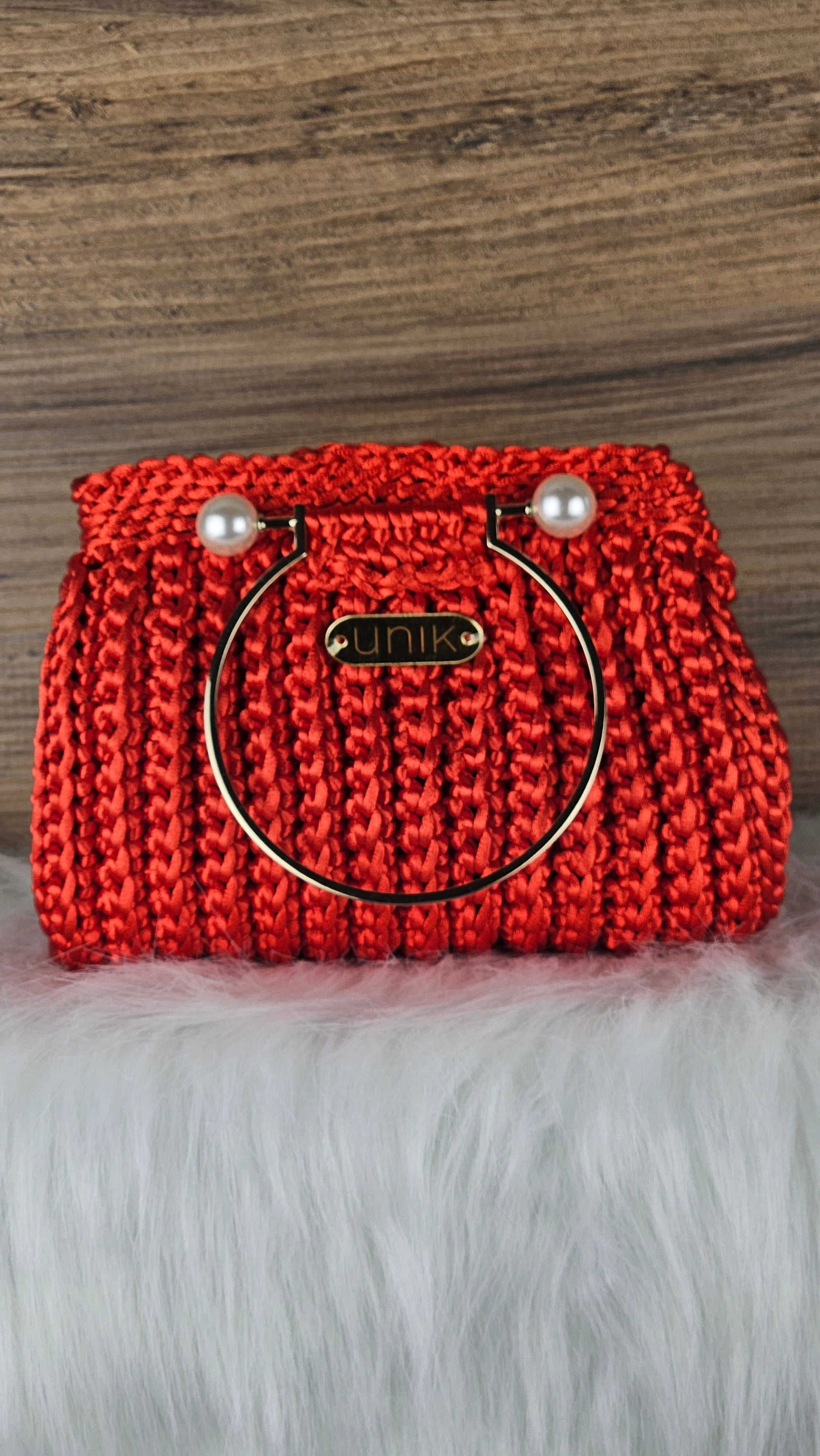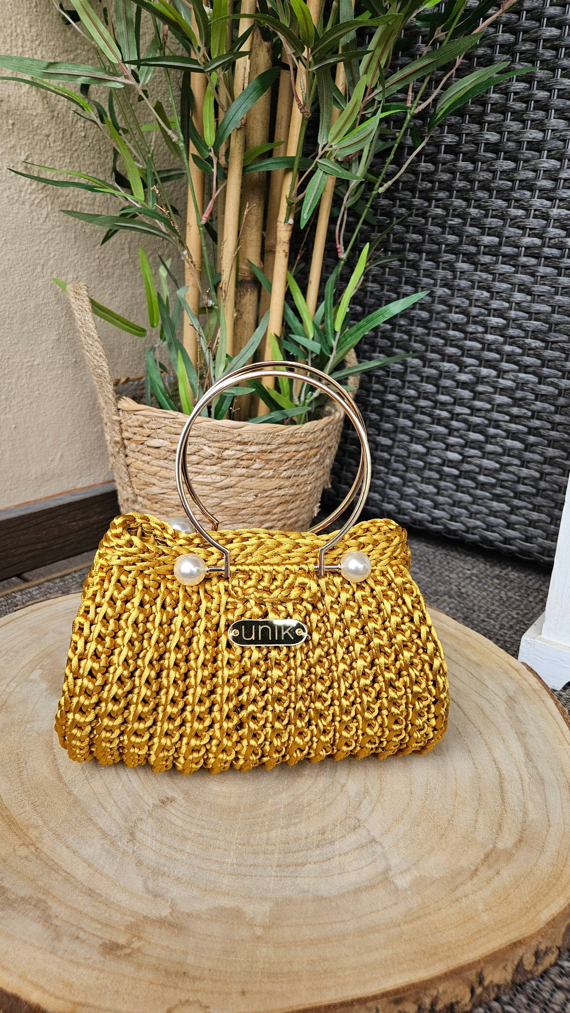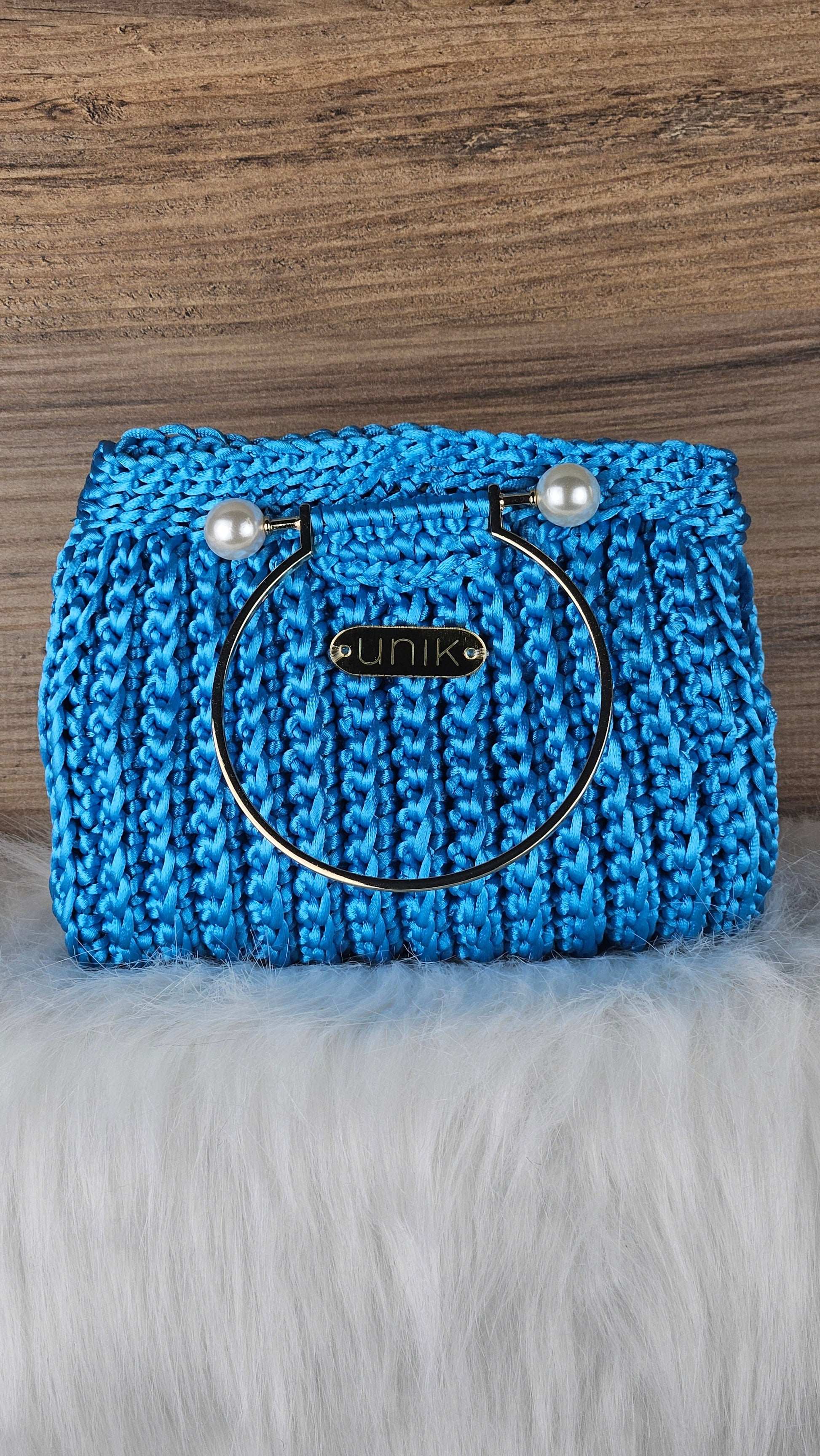 . Mides: 20 x 15 cm · Fil satinat · Folre interior satinat · Botó magnètic · 2 nanses metàl·liques daurades amb perles decoratives · Cadena metàl·lica daurada · Etiqueta Unik |