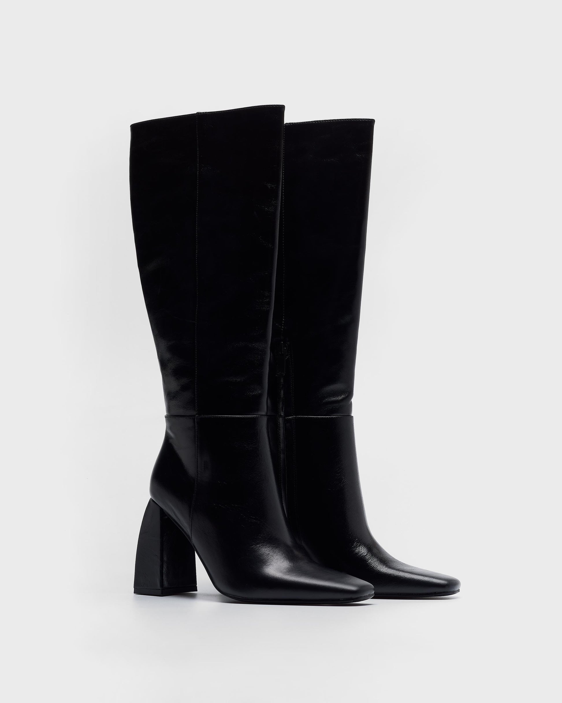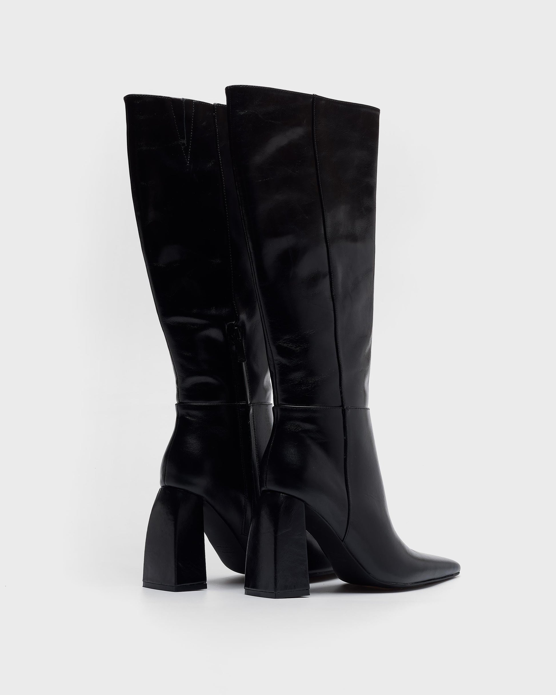 Bota de tacón en piel negra. En punta con tacon cuadrado. Caña alta con anchura media.