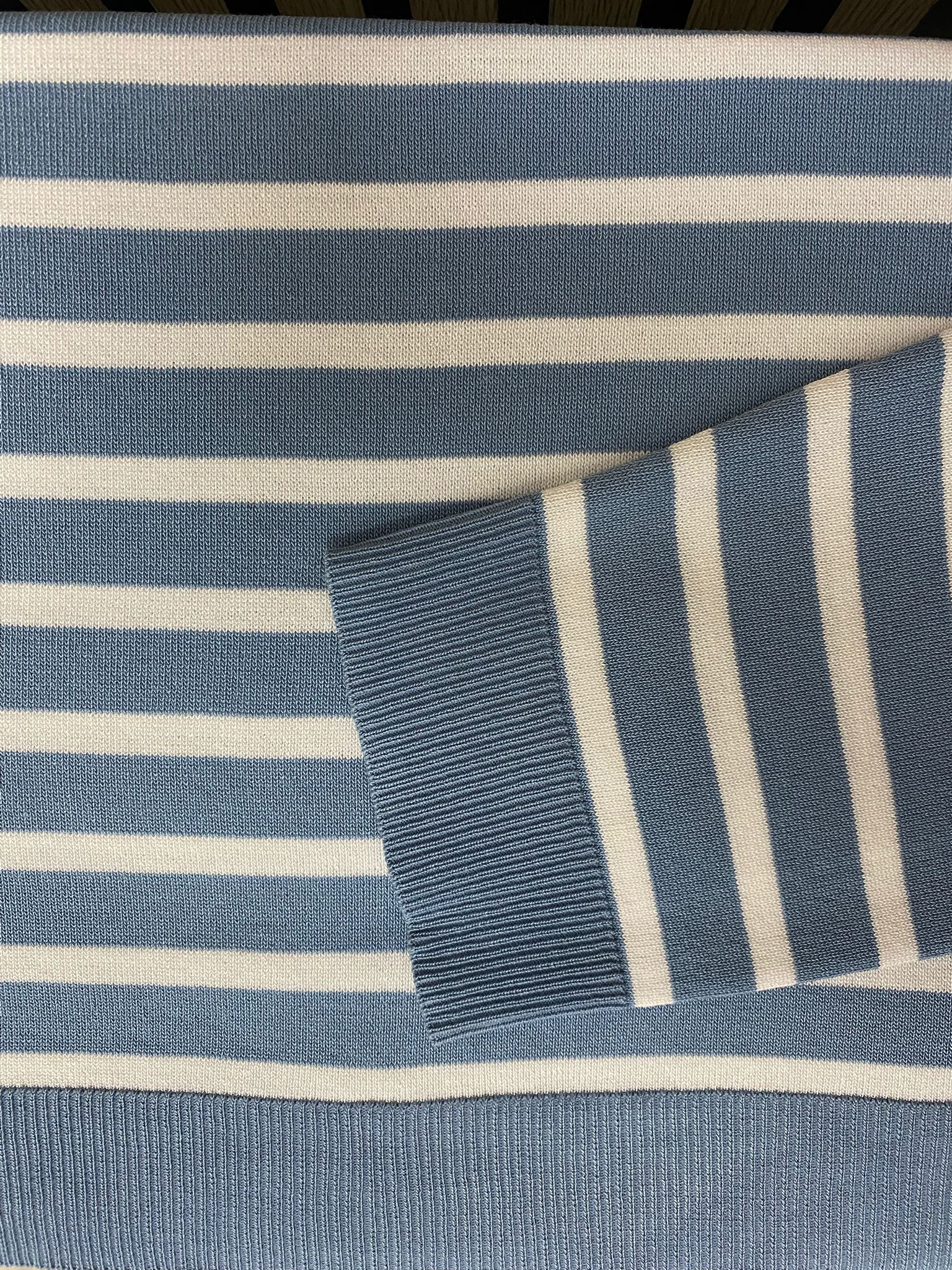 Confeccionado en punto fino, con rayas horizontales que le dan personalidad. Cuello tipo polo con escote en pico para un look moderno y versátil. Los puños y bajo terminados en rib garantizan un ajuste perfecto que se mantiene en su lugar.