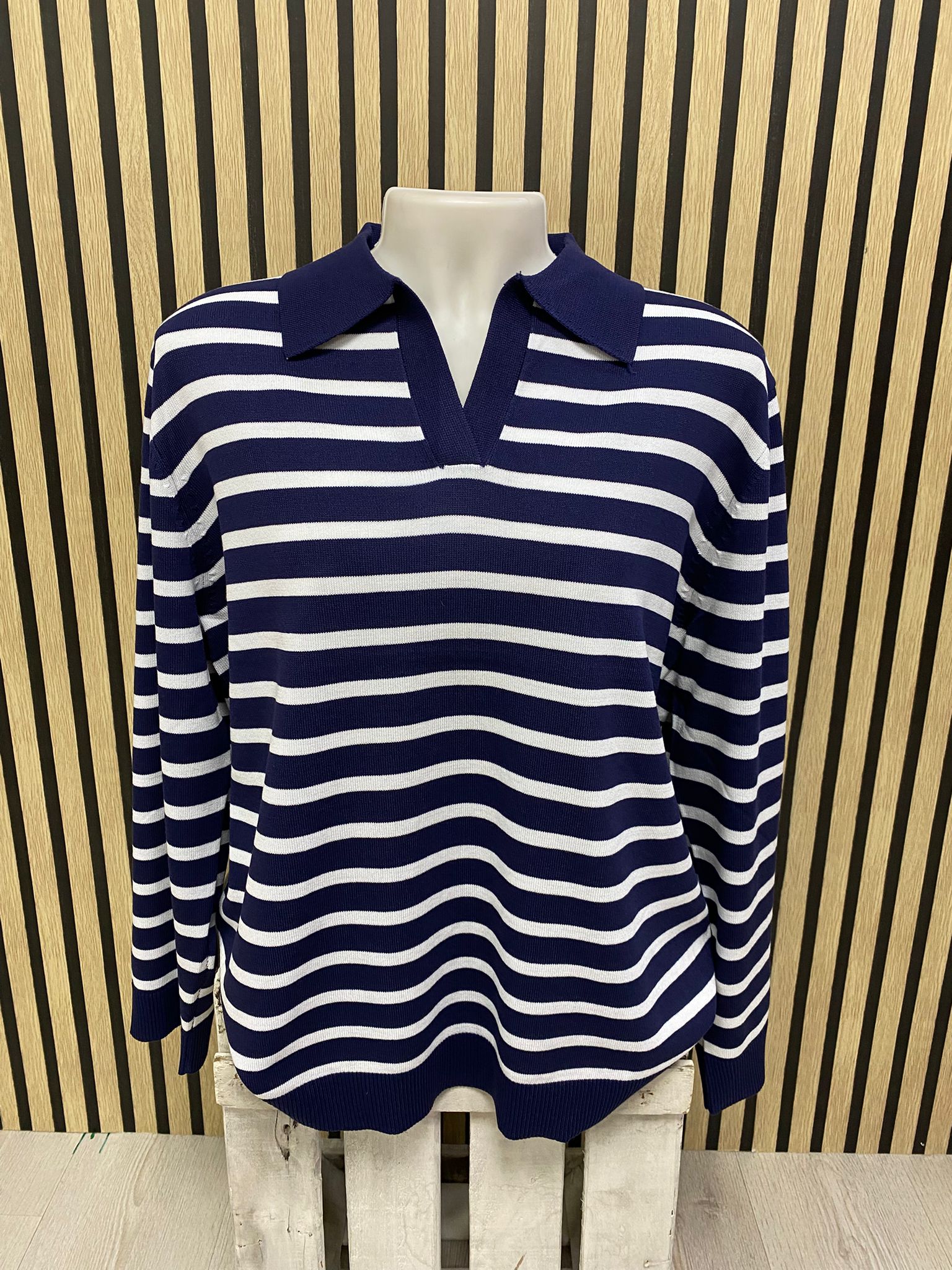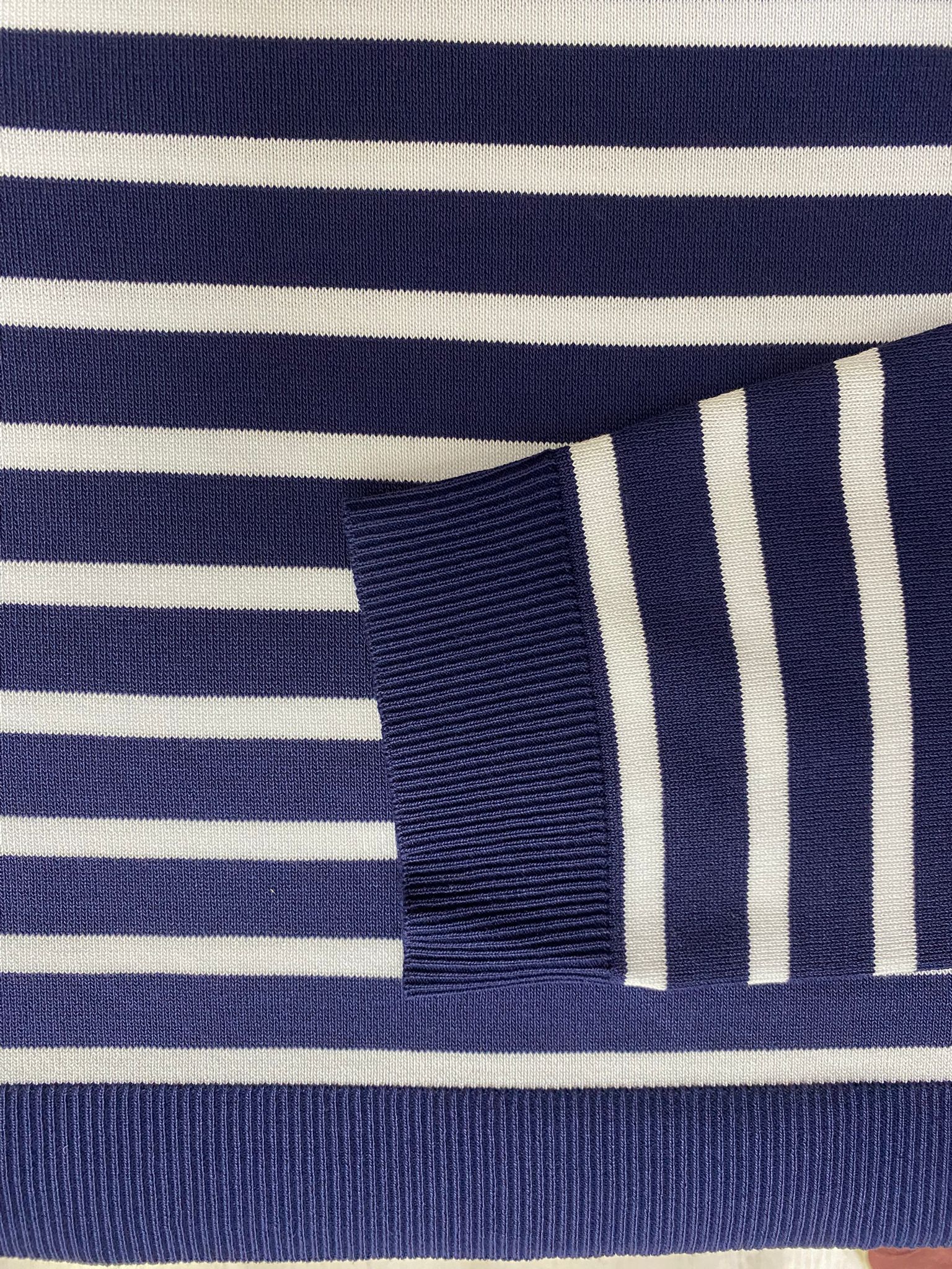Confeccionado en punto fino, con rayas horizontales que le dan personalidad. Cuello tipo polo con escote en pico para un look moderno y versátil. Los puños y bajo terminados en rib garantizan un ajuste perfecto que se mantiene en su lugar.