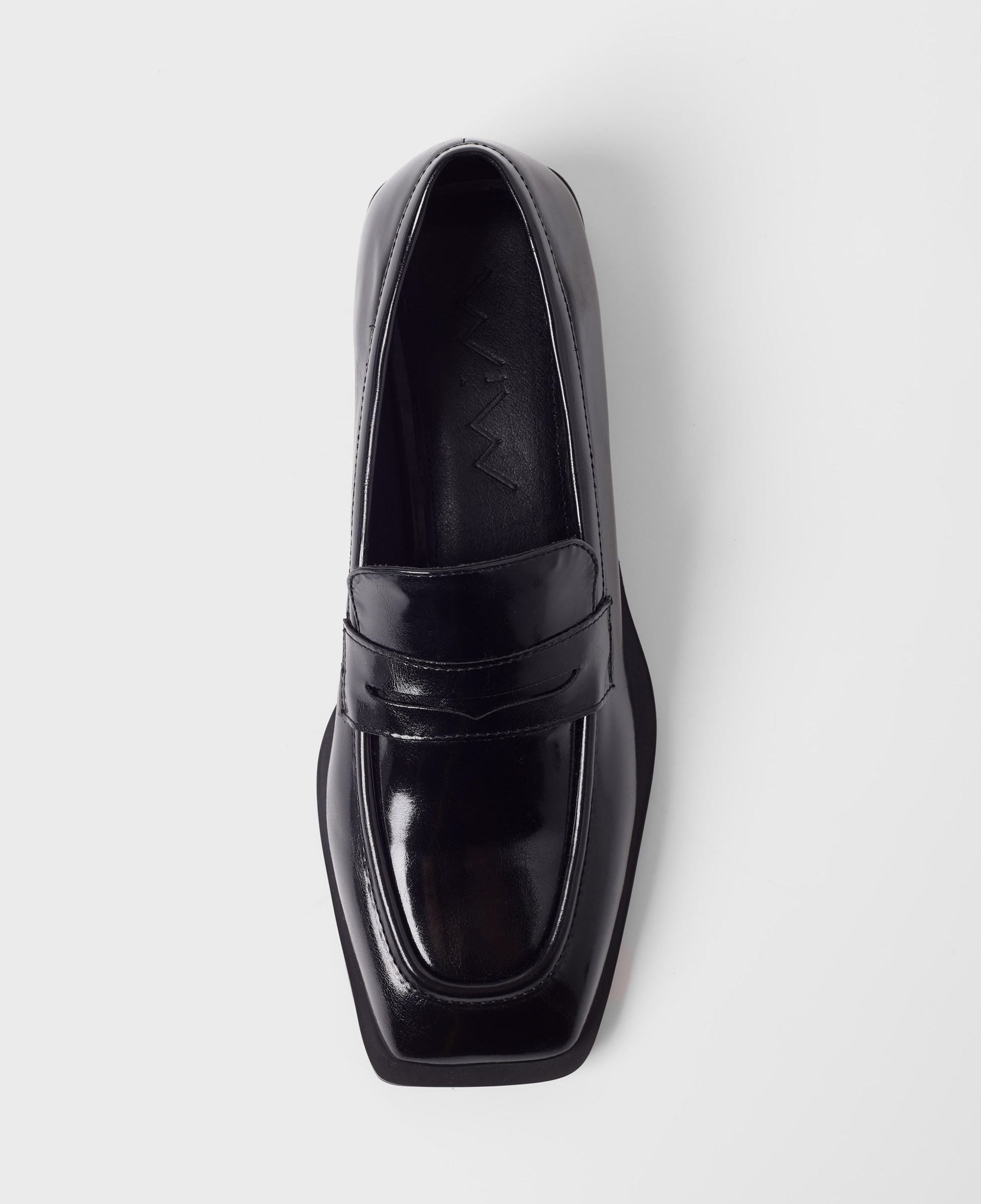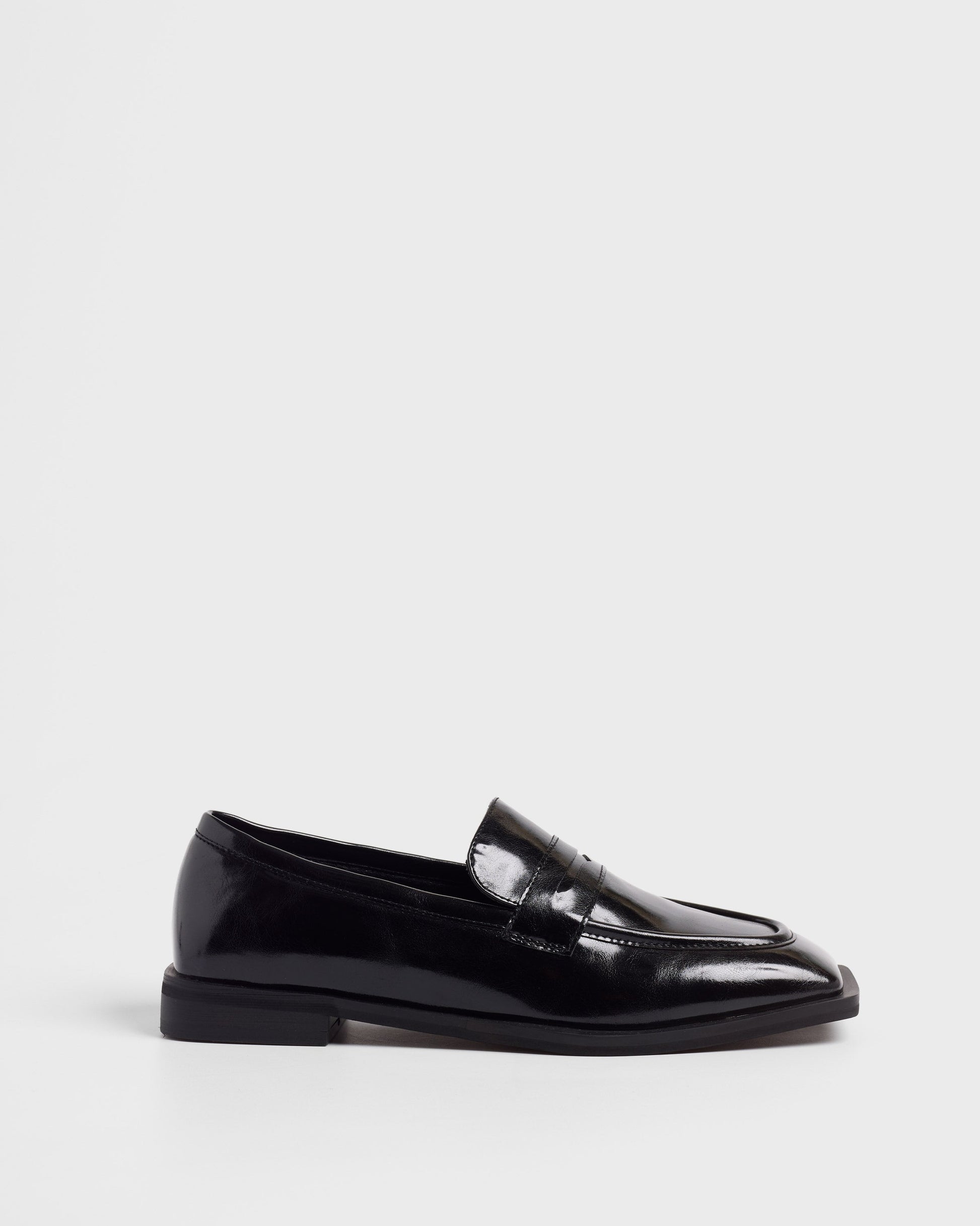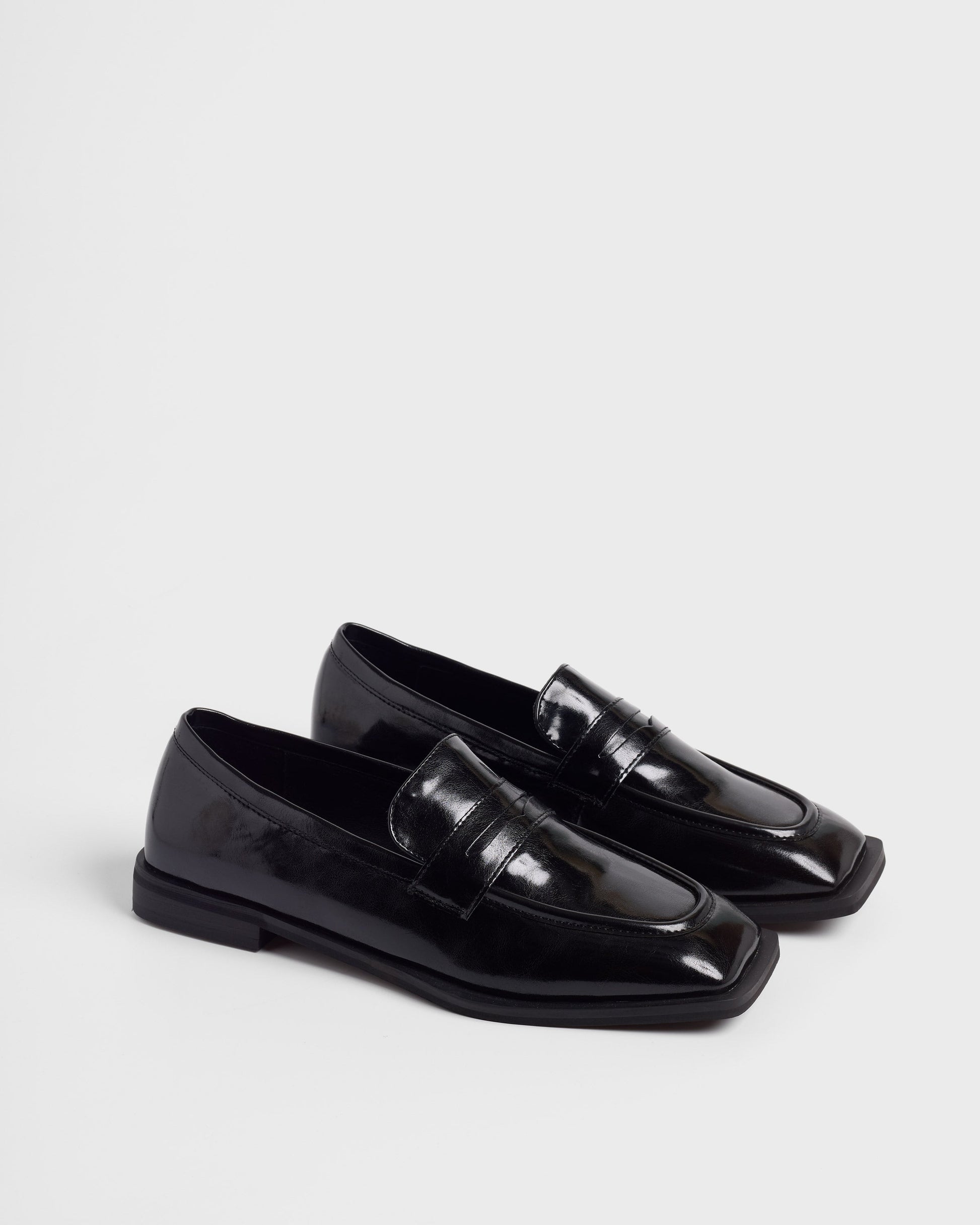 Zapato cerrado estilo mocasín efecto charol en color negro.