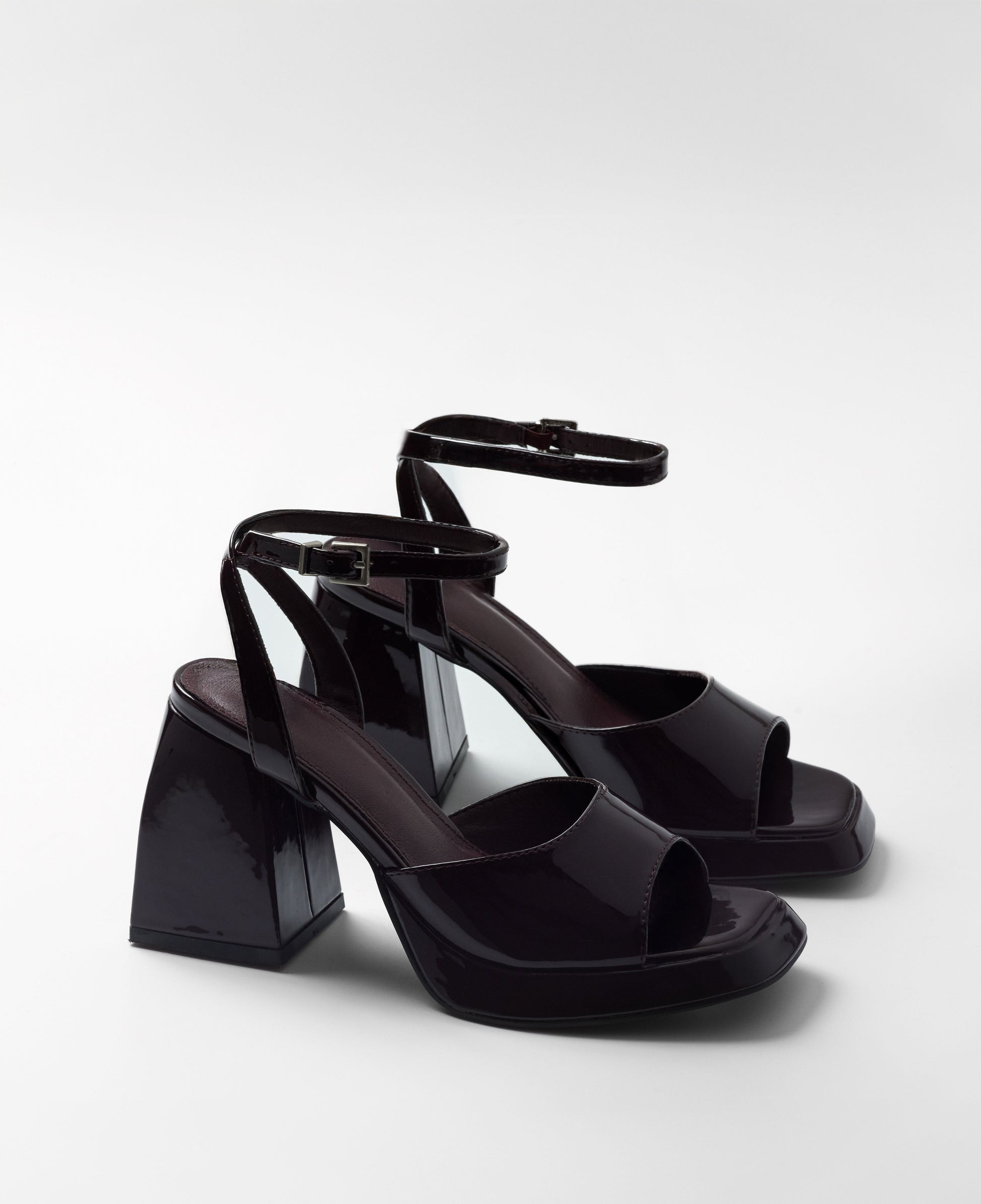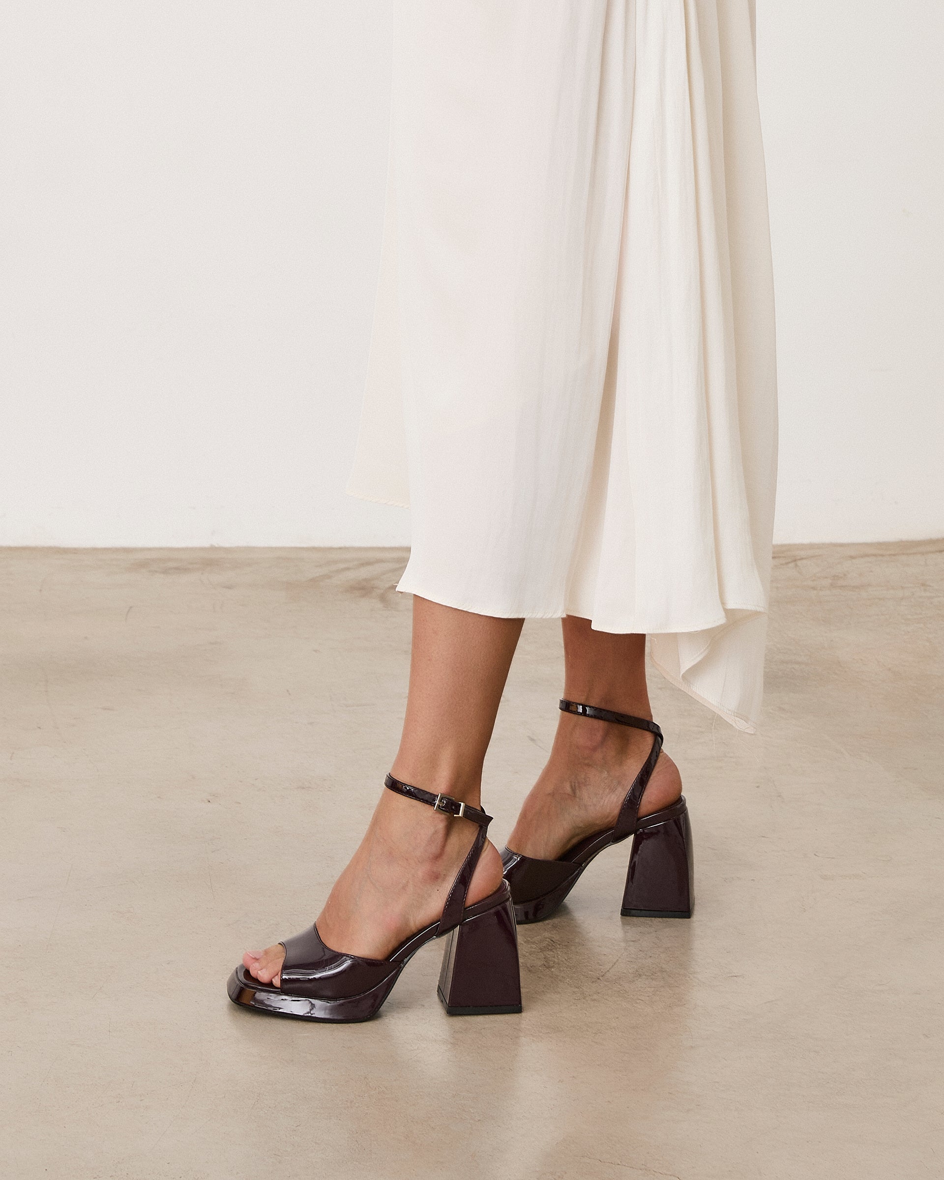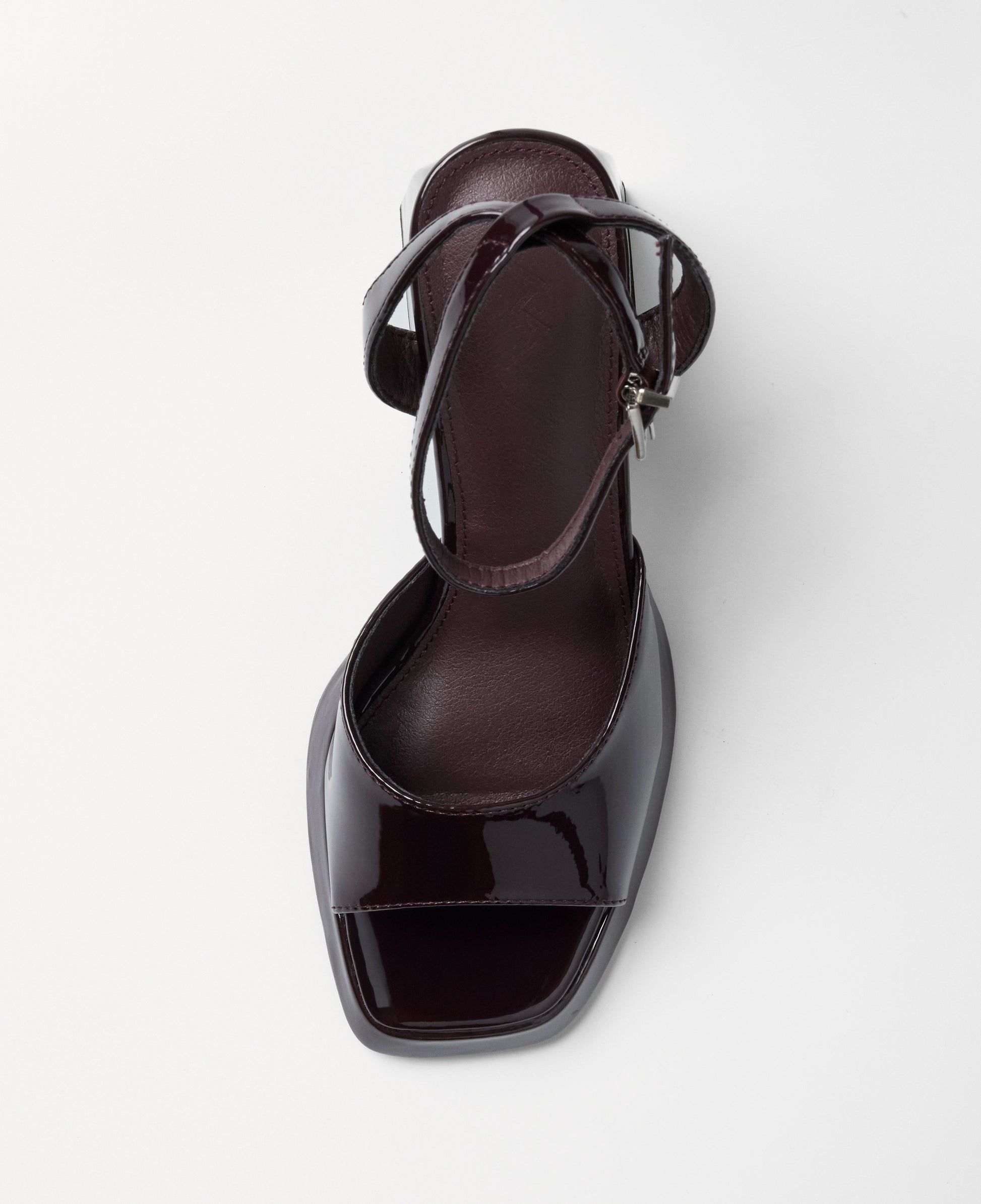 Sandalia de tacón con plataforma y punta cuadrada en color burdeos. Tira ancha en la parte delantera y pulsera para cierre al tobillo.