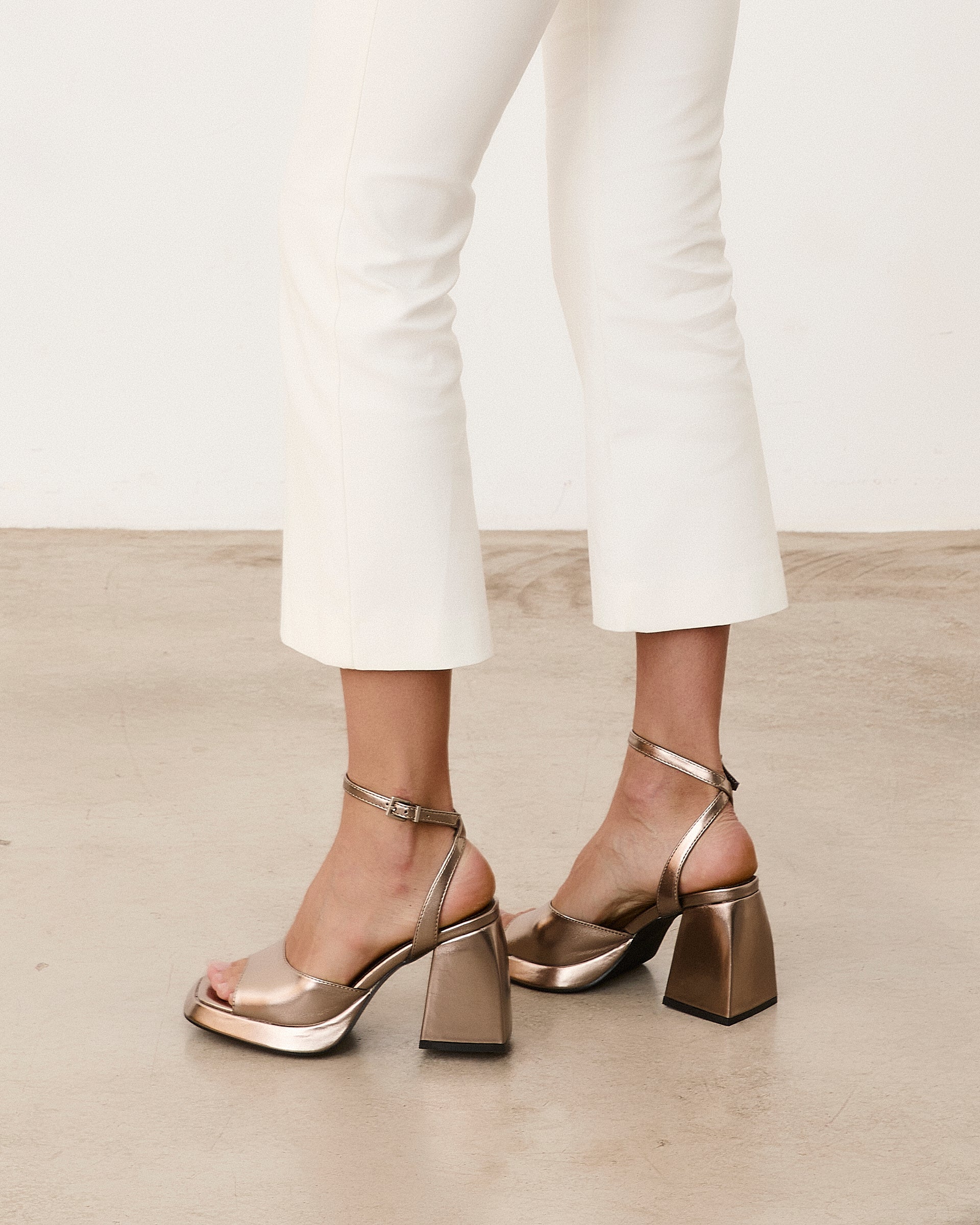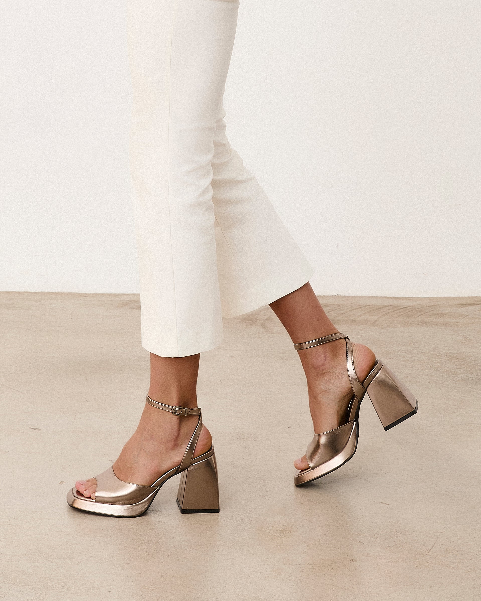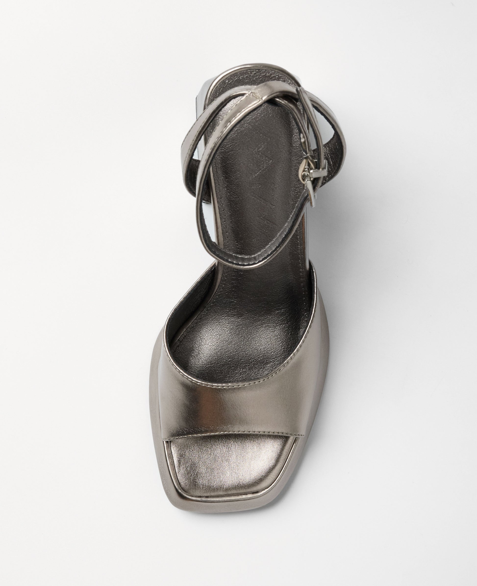 Sandalia de tacón con plataforma y punta cuadrada en color metalizado. Tira ancha en la parte delantera y pulsera para cierre al tobillo.