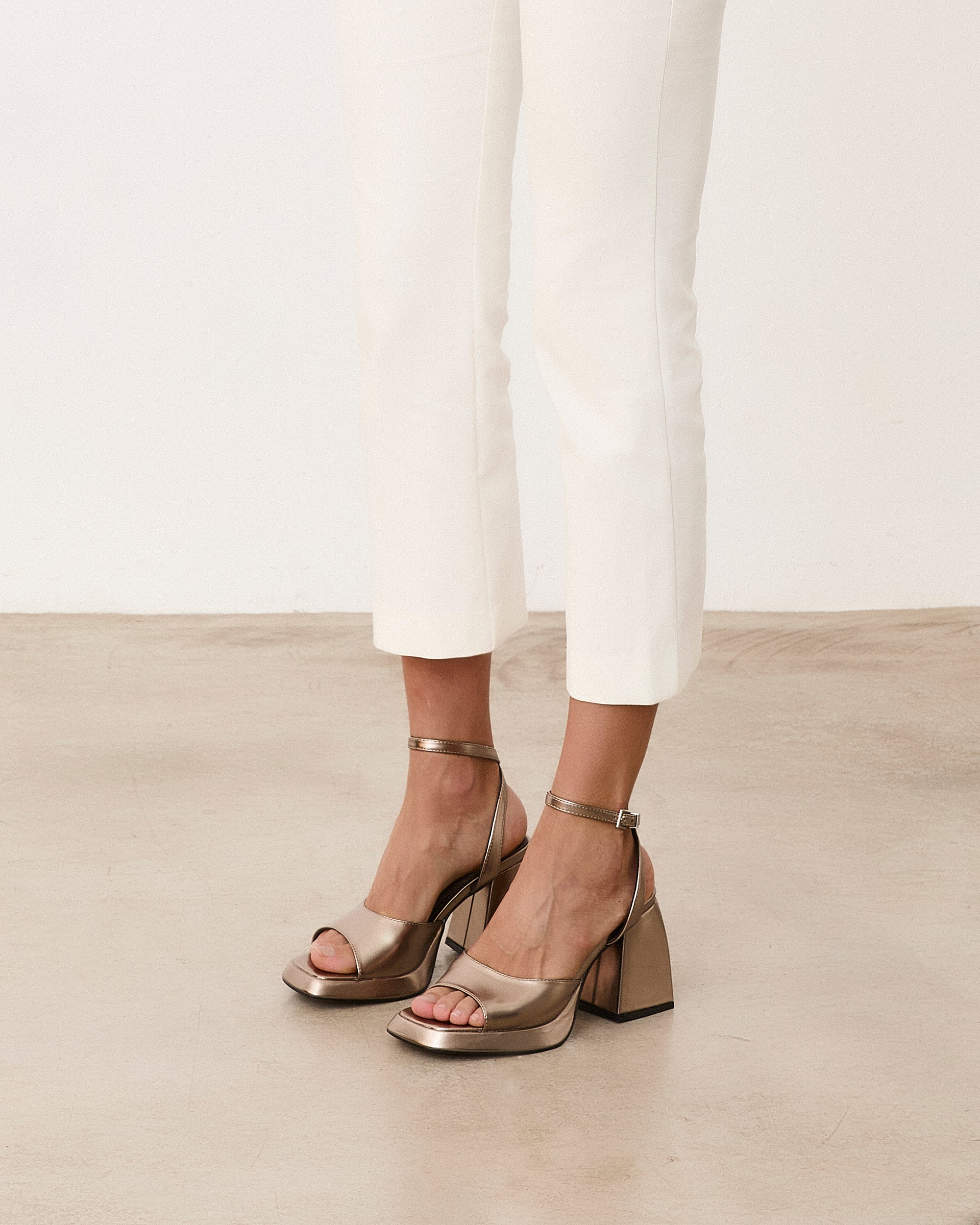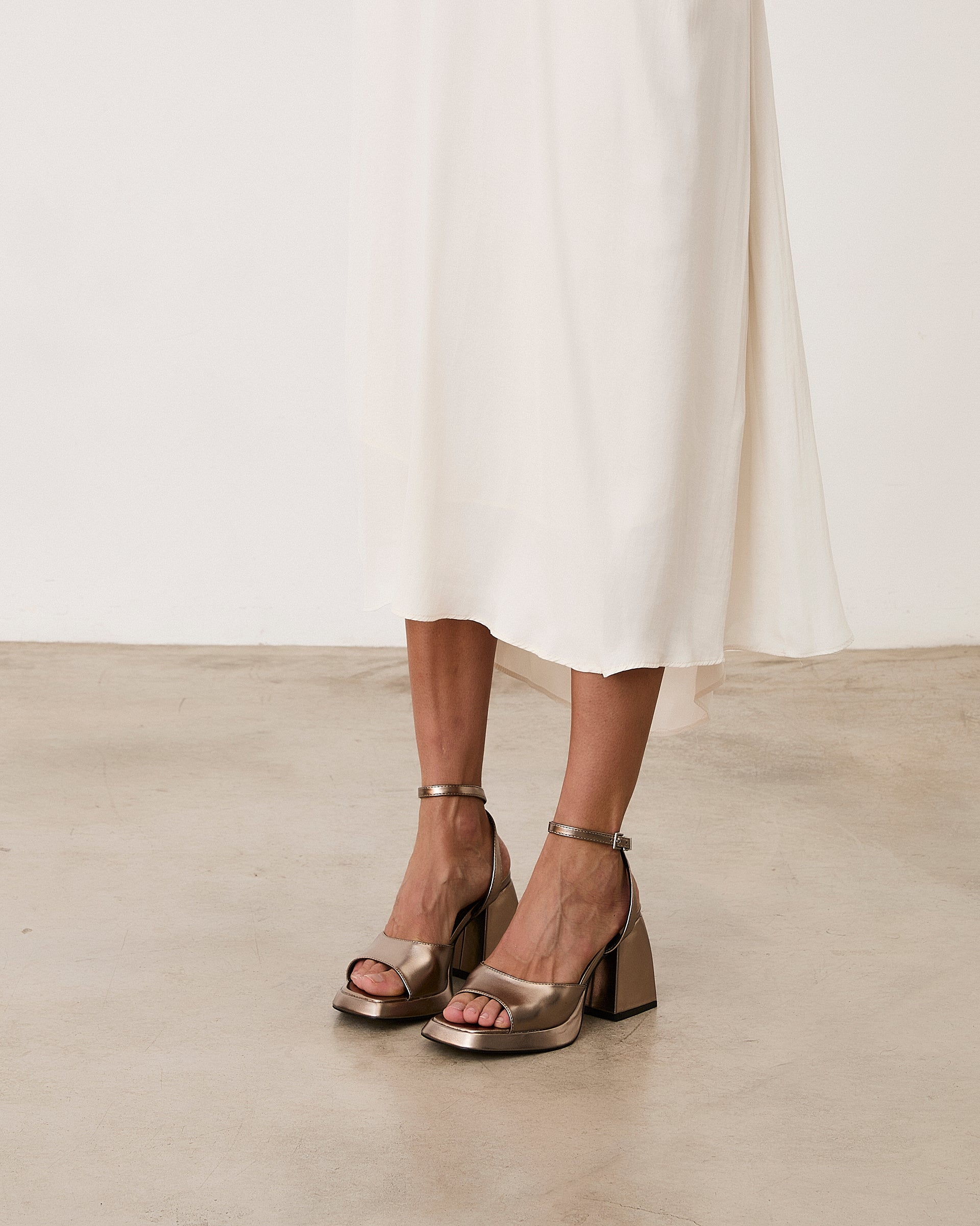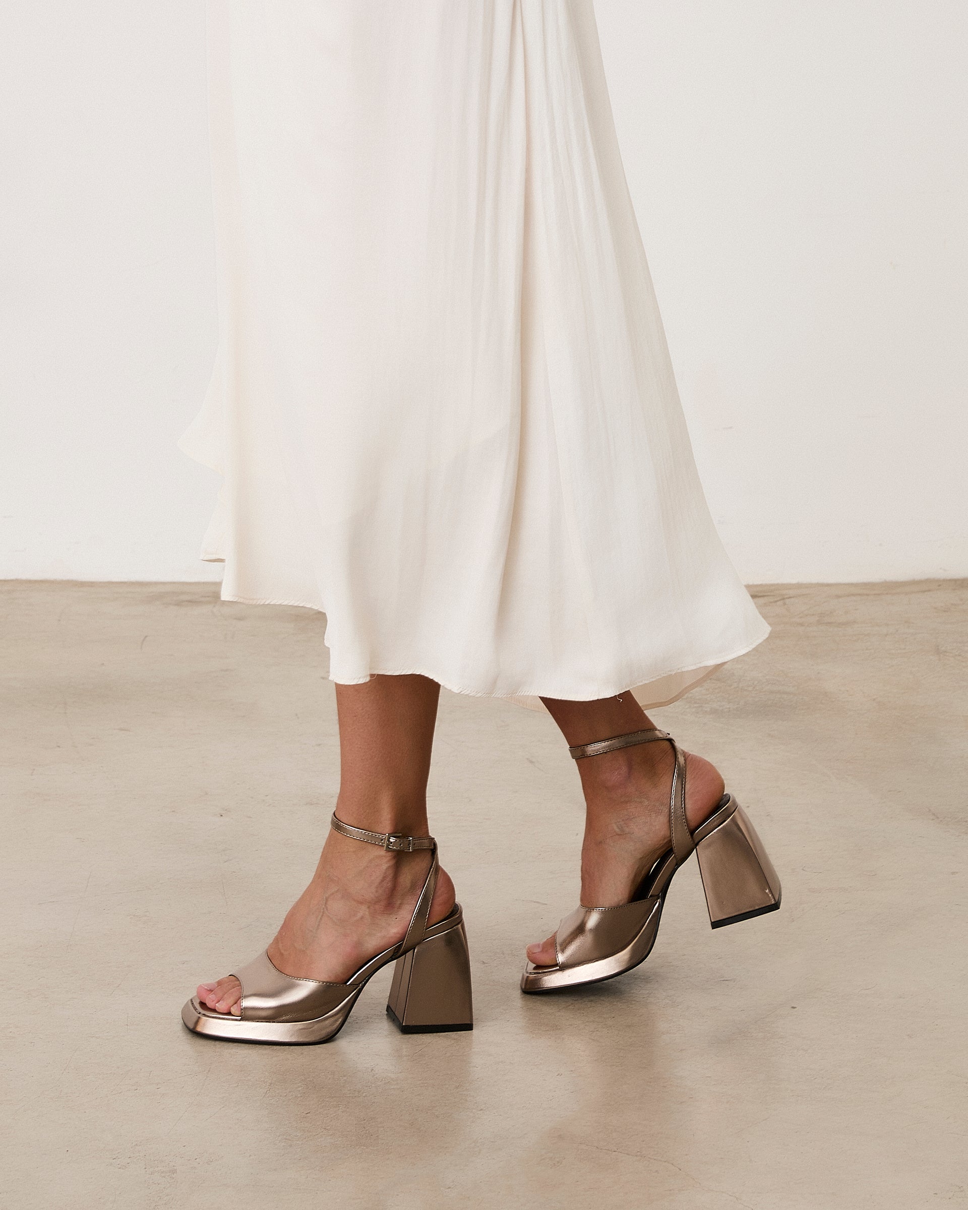 Sandalia de tacón con plataforma y punta cuadrada en color metalizado. Tira ancha en la parte delantera y pulsera para cierre al tobillo.