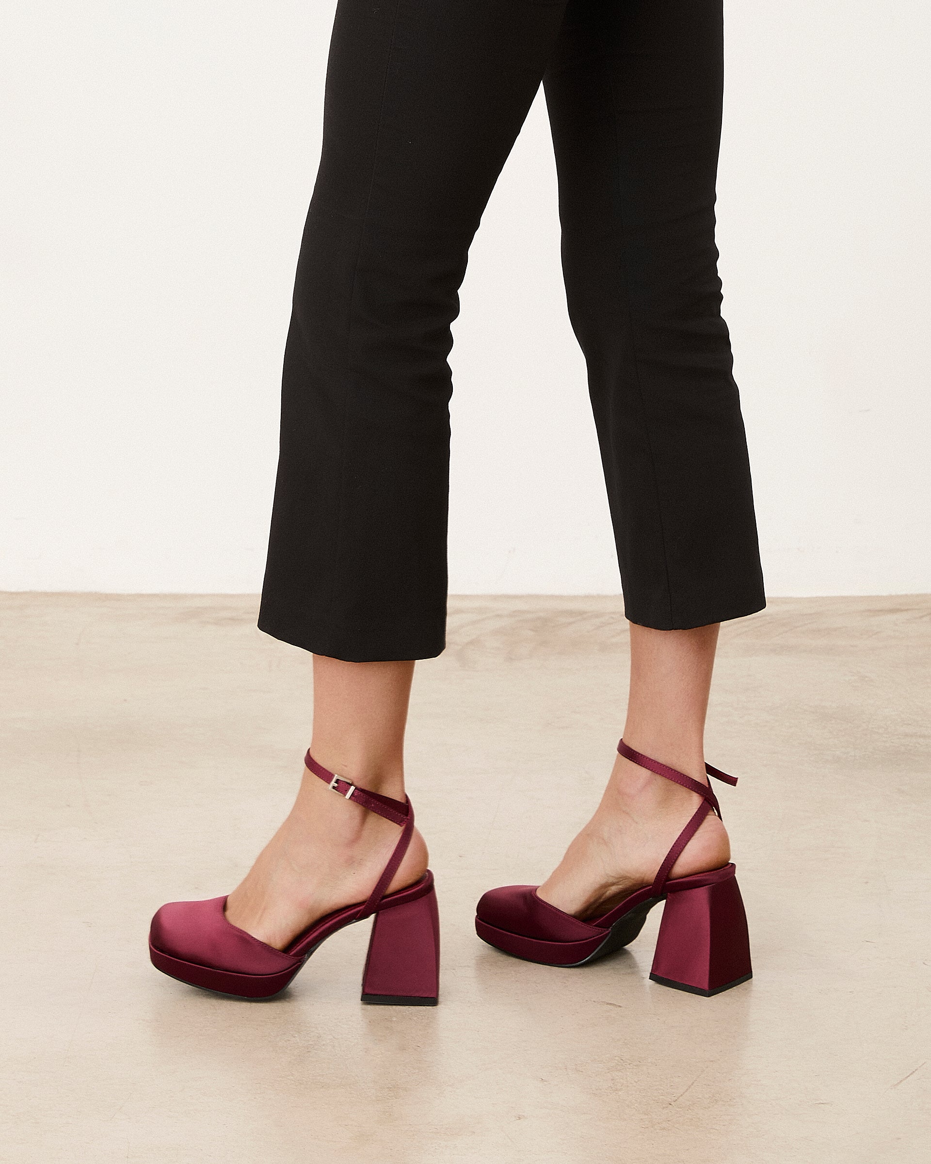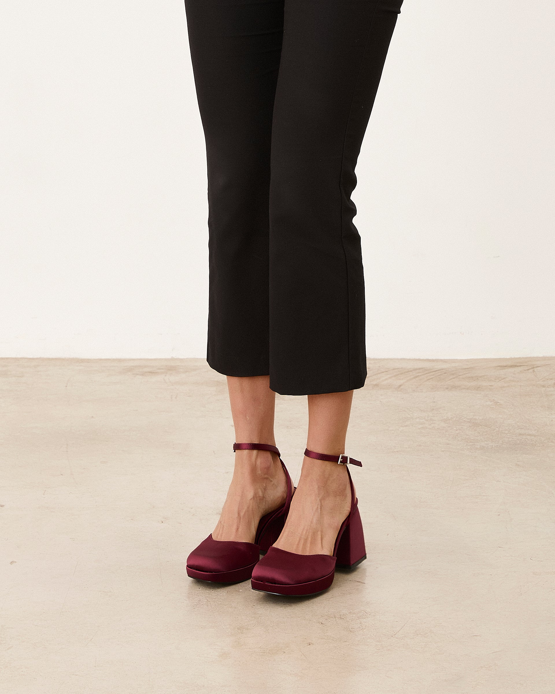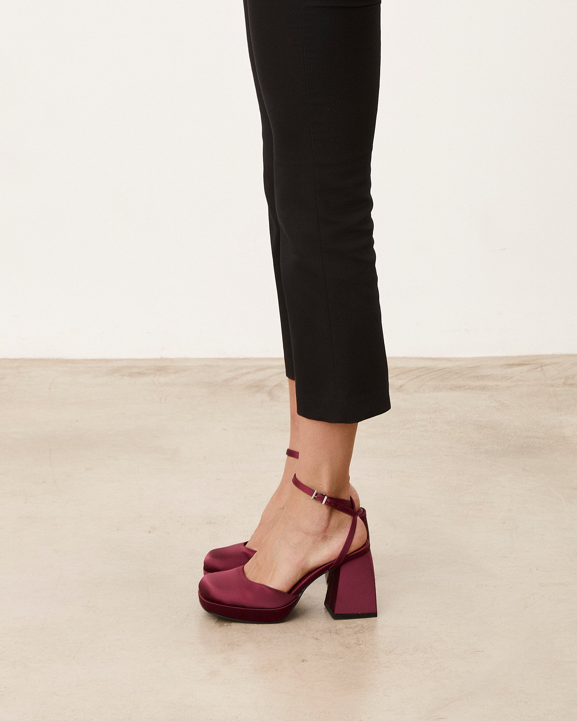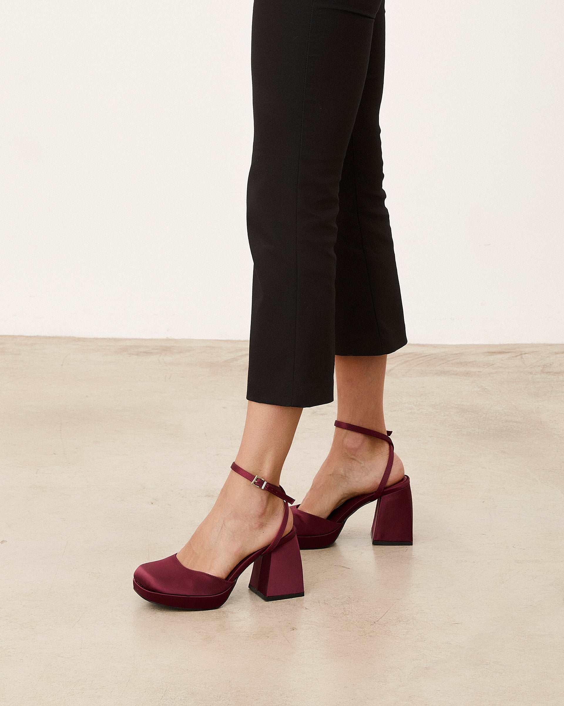Zapato de tacón cerrado en raso burdeos. Dos tiras para sujección en tobillo.