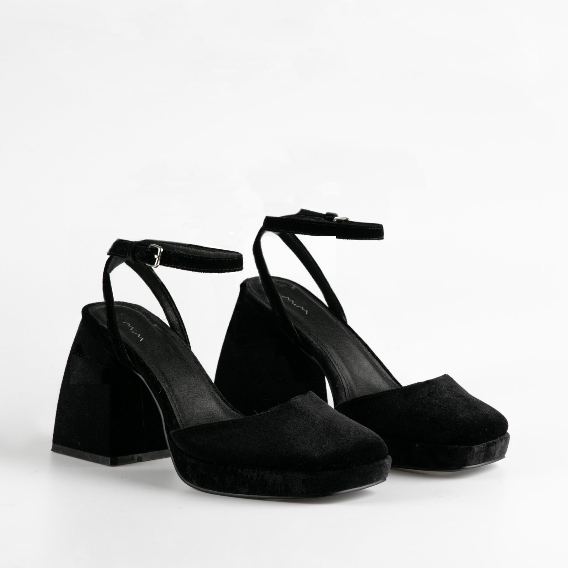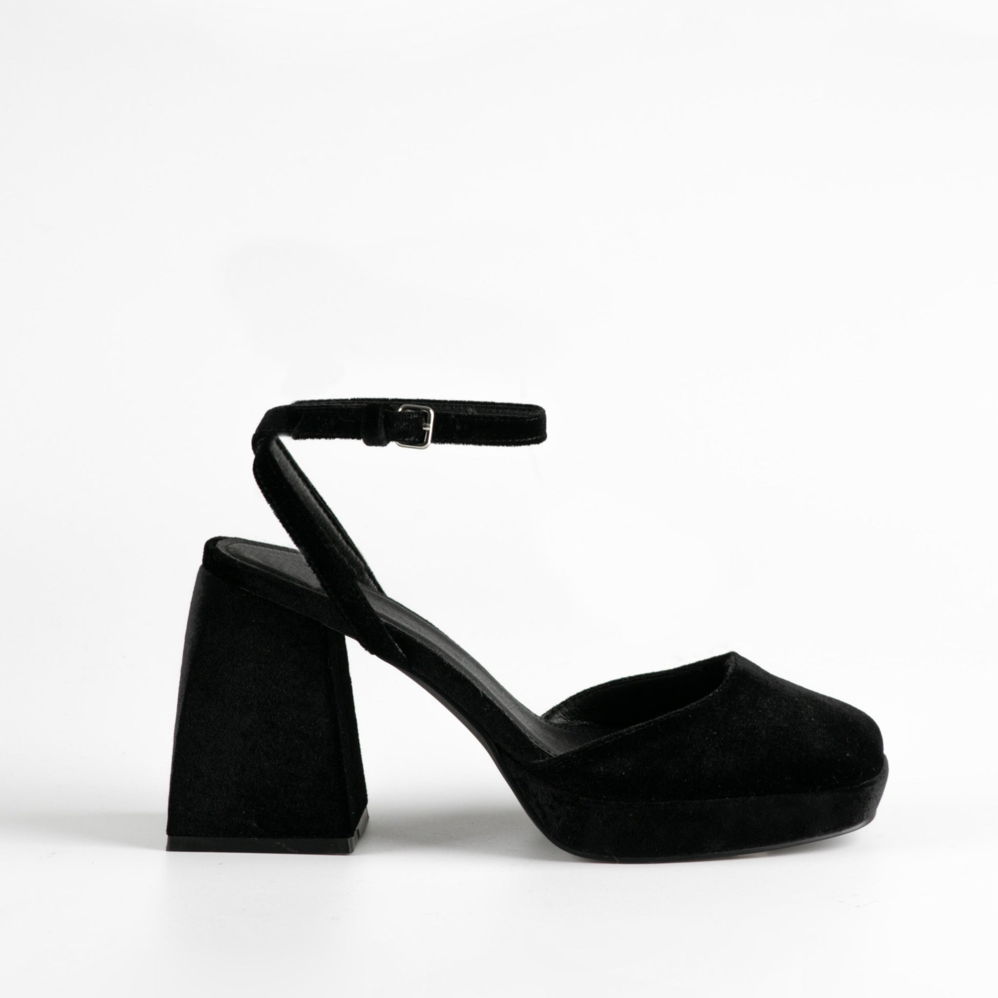 Zapato de tacón cerrado en terciopelo negro. Dos tiras para sujección en tobillo.