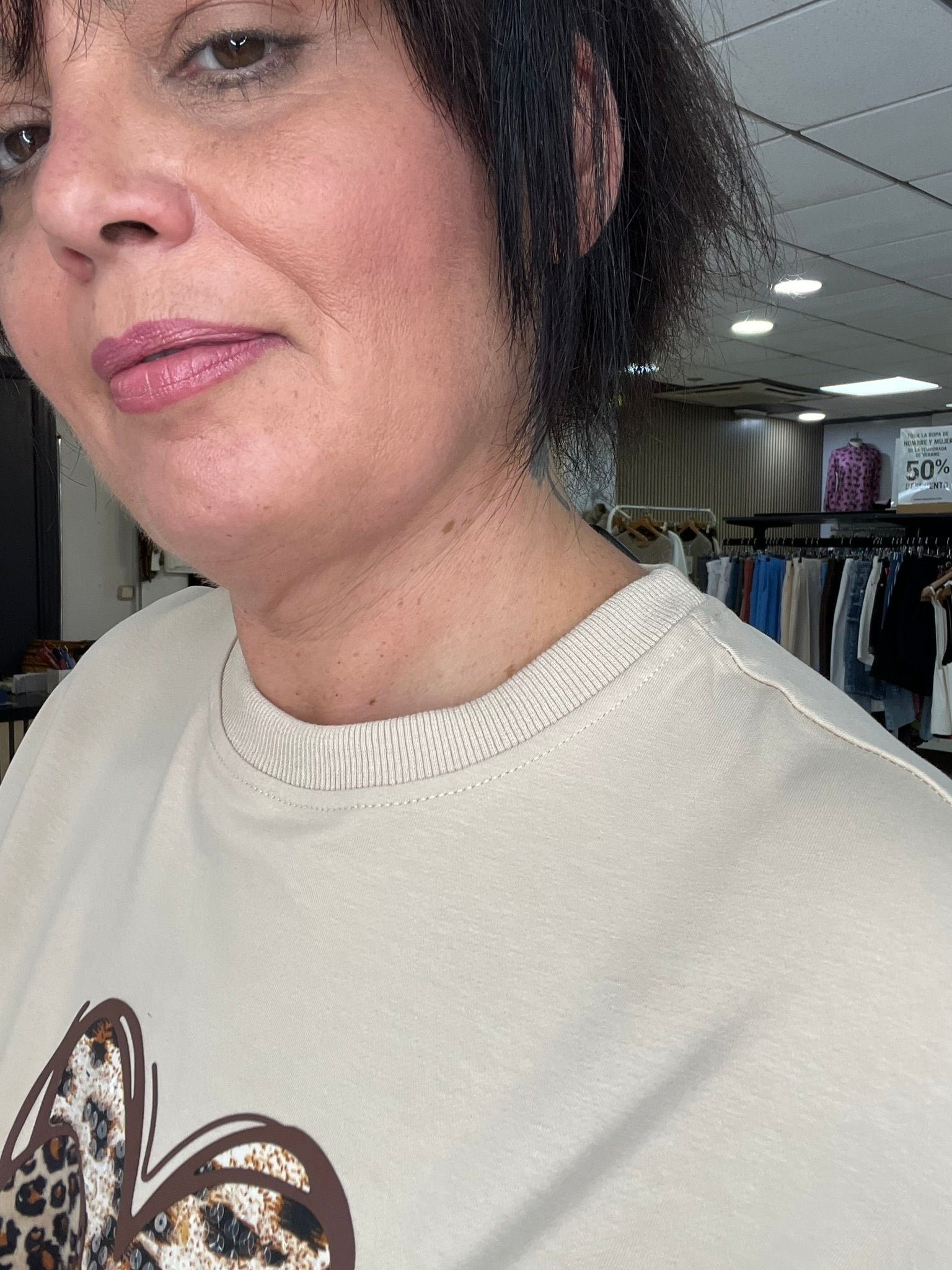 Apuesta por la mezcla perfecta de comodidad y tendencia con esta sudadera de mujer beige con print animal y detalle de corazones “Love”. Su diseño combina el toque moderno del estampado leopardo con un aire dulce y femenino, ideal para looks casuales del día a día.