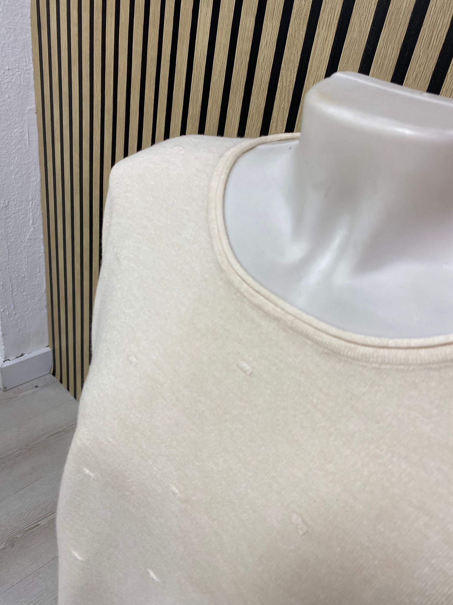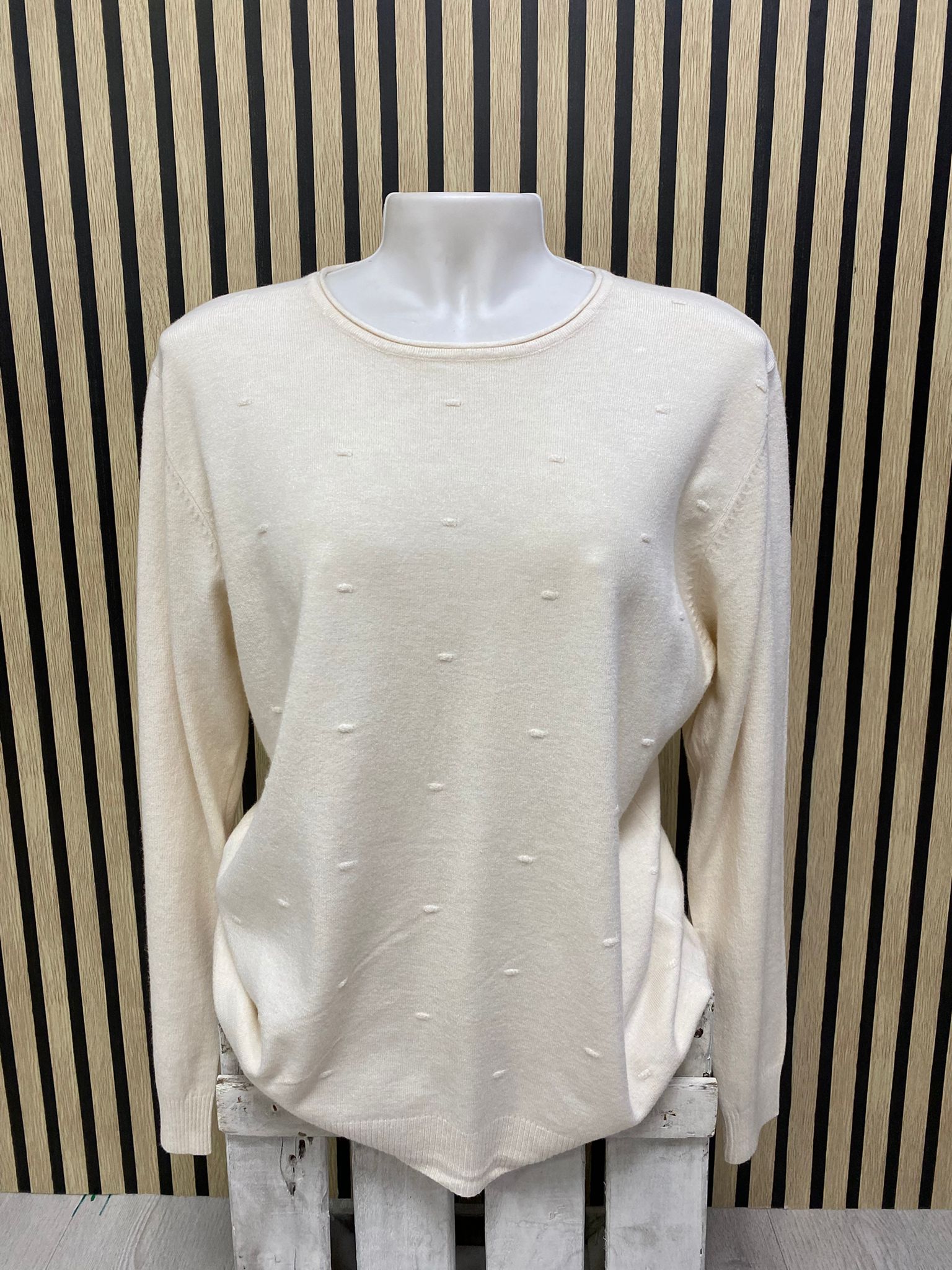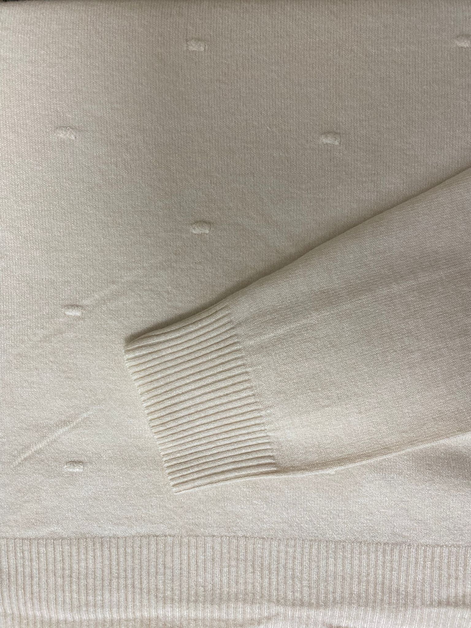 Este jersey de punto destaca por su cuello redondo y corte recto que favorece cualquier silueta. Las terminaciones en rib en mangas y en el bajo garantizan un ajuste perfecto y duradero, mientras que los detalles en relieve le dan ese toque especial que te hace diferente.