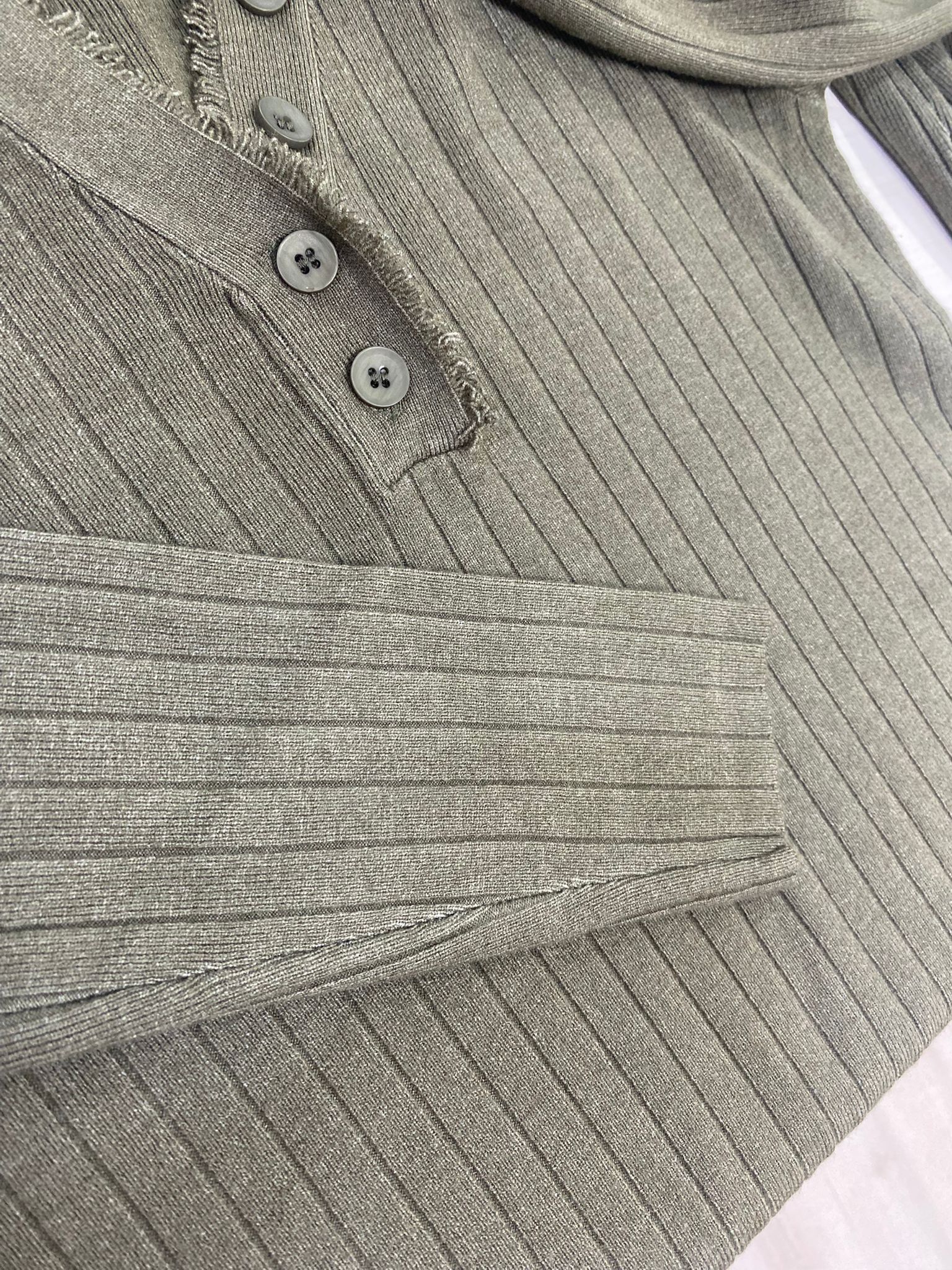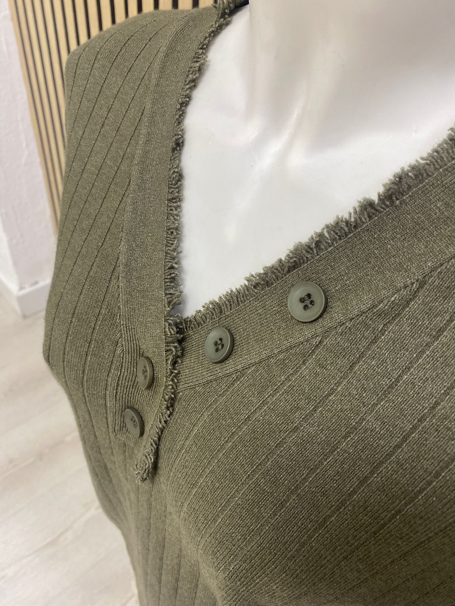 Suéter de punto de canalé que combina comodidad y estilo. Manga larga y cuello con escote en pico abotonado, adornado con un detalle desflecado que le da un toque desenfadado y moderno.