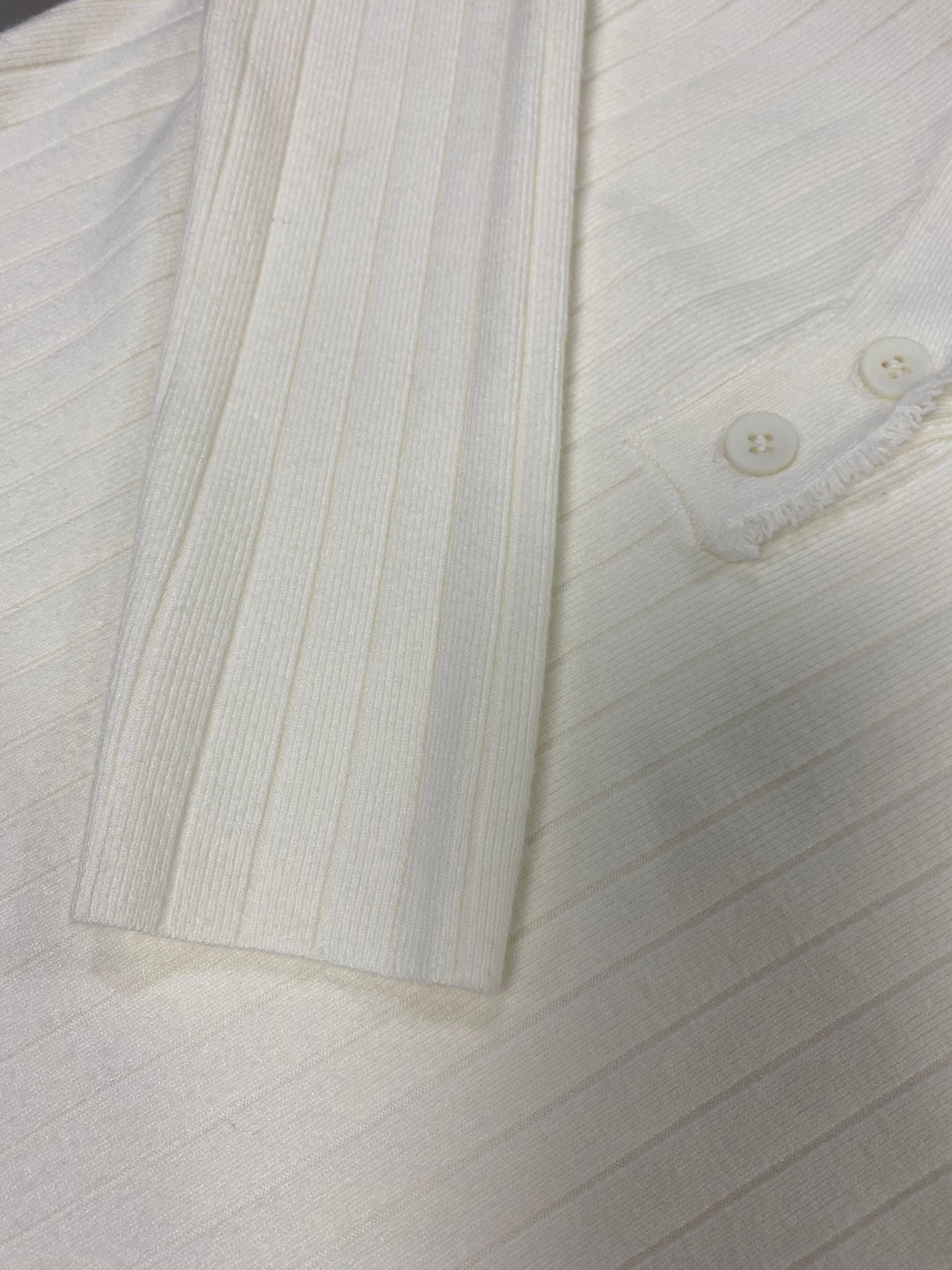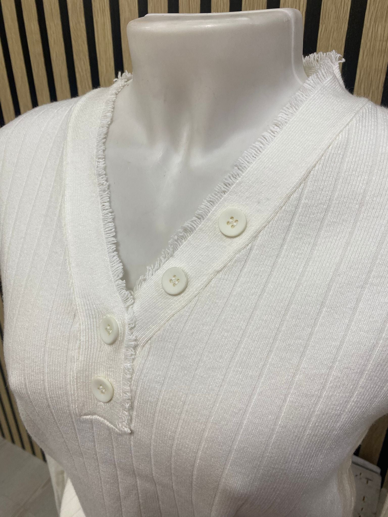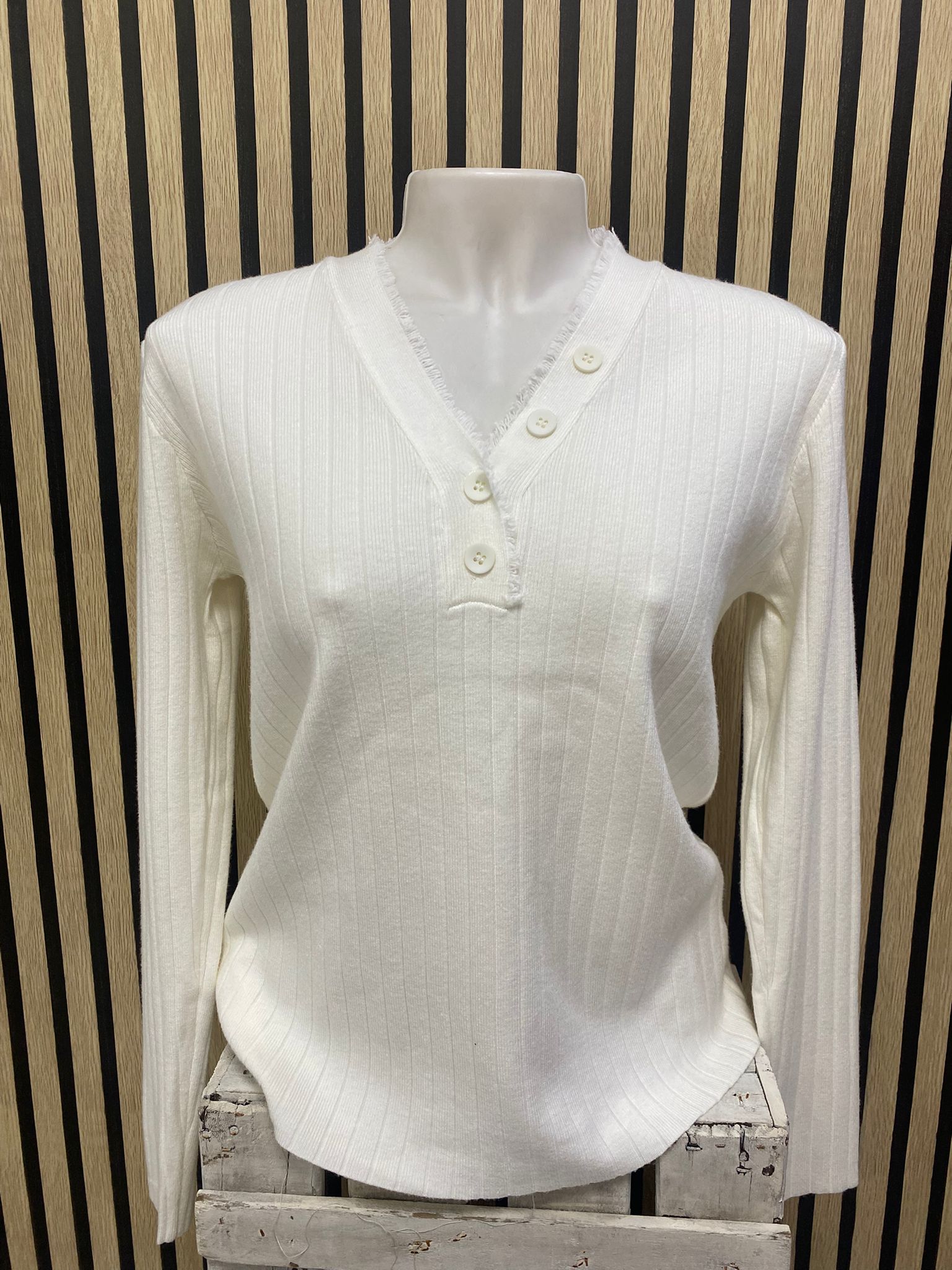 Suéter de punto de canalé que combina comodidad y estilo. Manga larga y cuello con escote en pico abotonado, adornado con un detalle desflecado que le da un toque desenfadado y moderno.