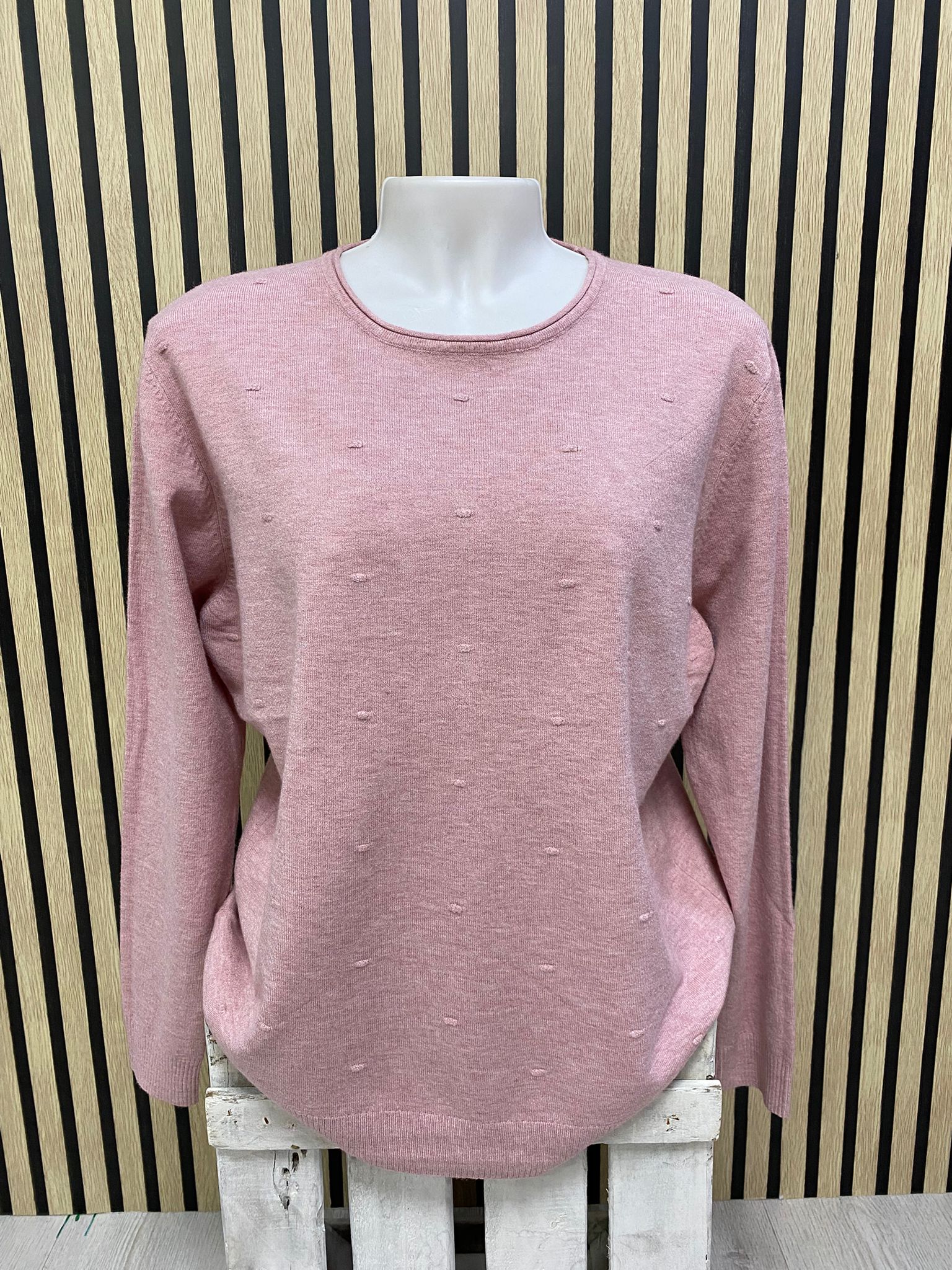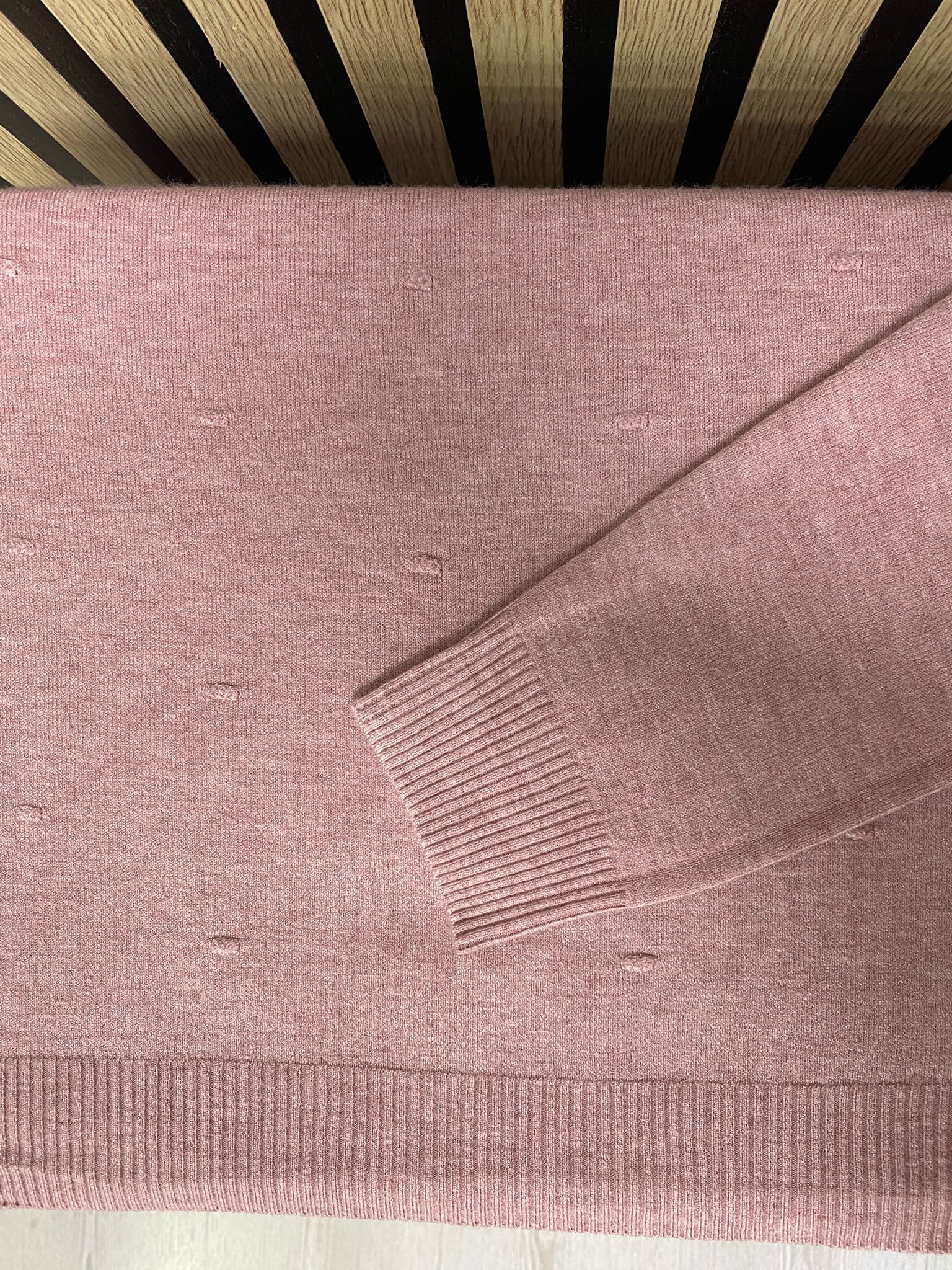 Este jersey de punto destaca por su cuello redondo y corte recto que favorece cualquier silueta. Las terminaciones en rib en mangas y en el bajo garantizan un ajuste perfecto y duradero, mientras que los detalles en relieve le dan ese toque especial que te hace diferente.