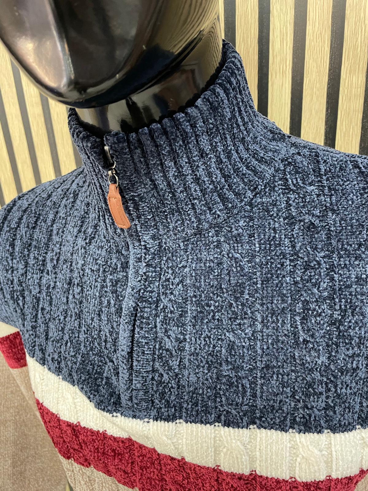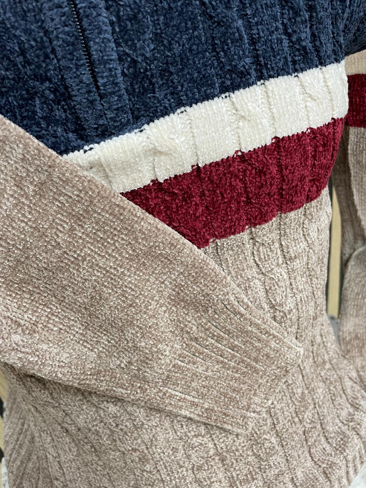 Este suéter de chenilla rompe con la monotonía del invierno mediante franjas horizontales en varios colores que comunican personalidad sin ser estridente. Con cuello alto con cremallera .