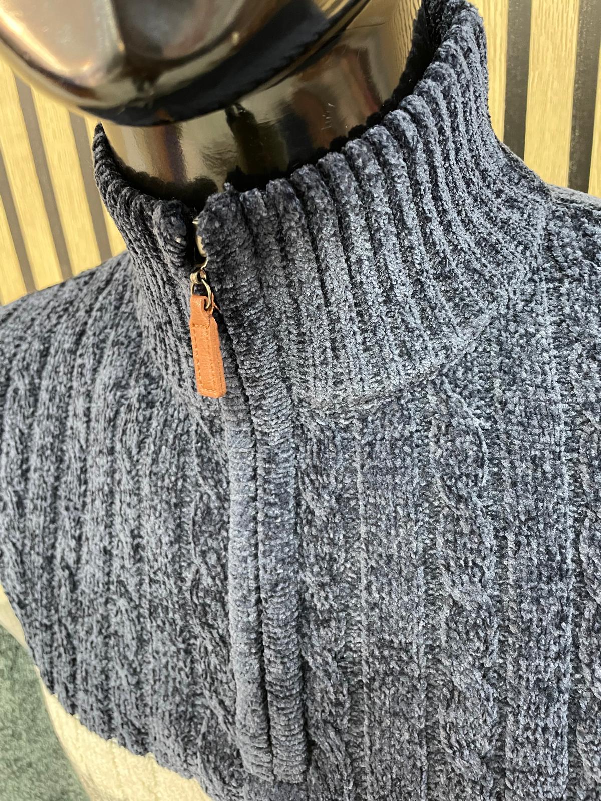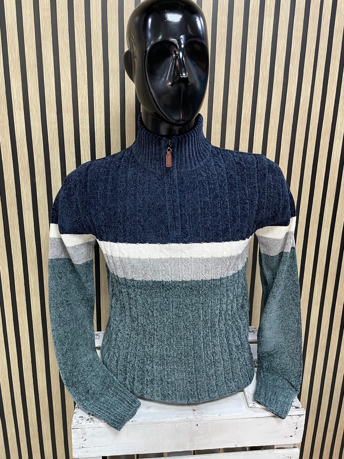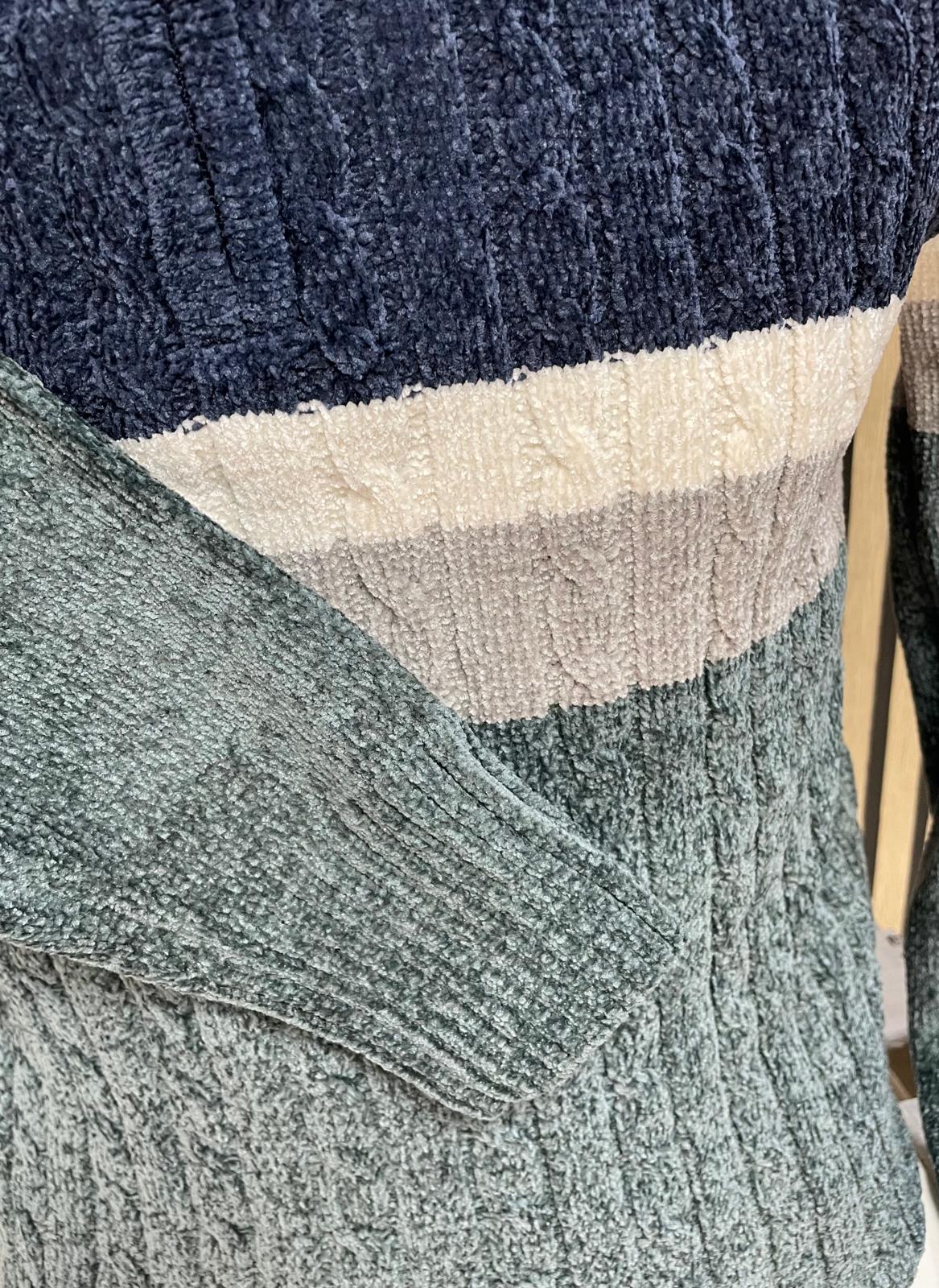 Este suéter de chenilla rompe con la monotonía del invierno mediante franjas horizontales en varios colores que comunican personalidad sin ser estridente. Con cuello alto con cremallera .