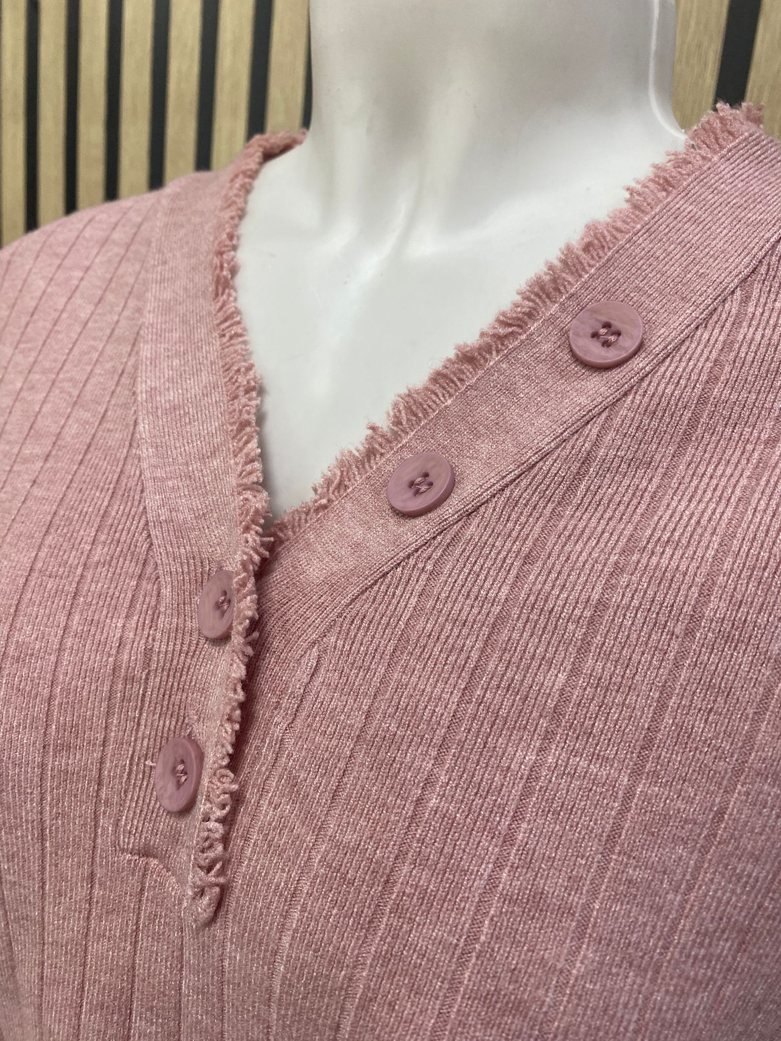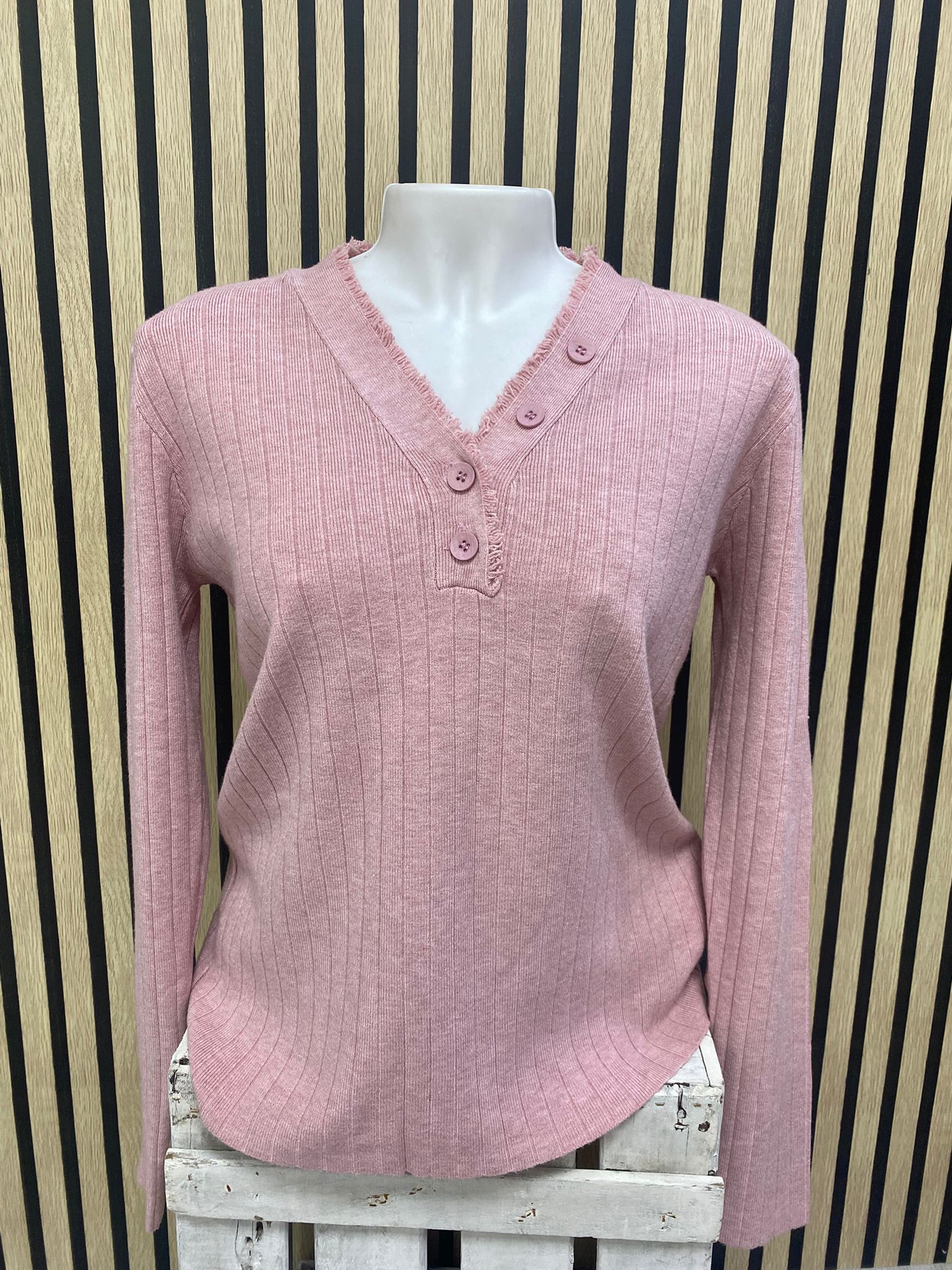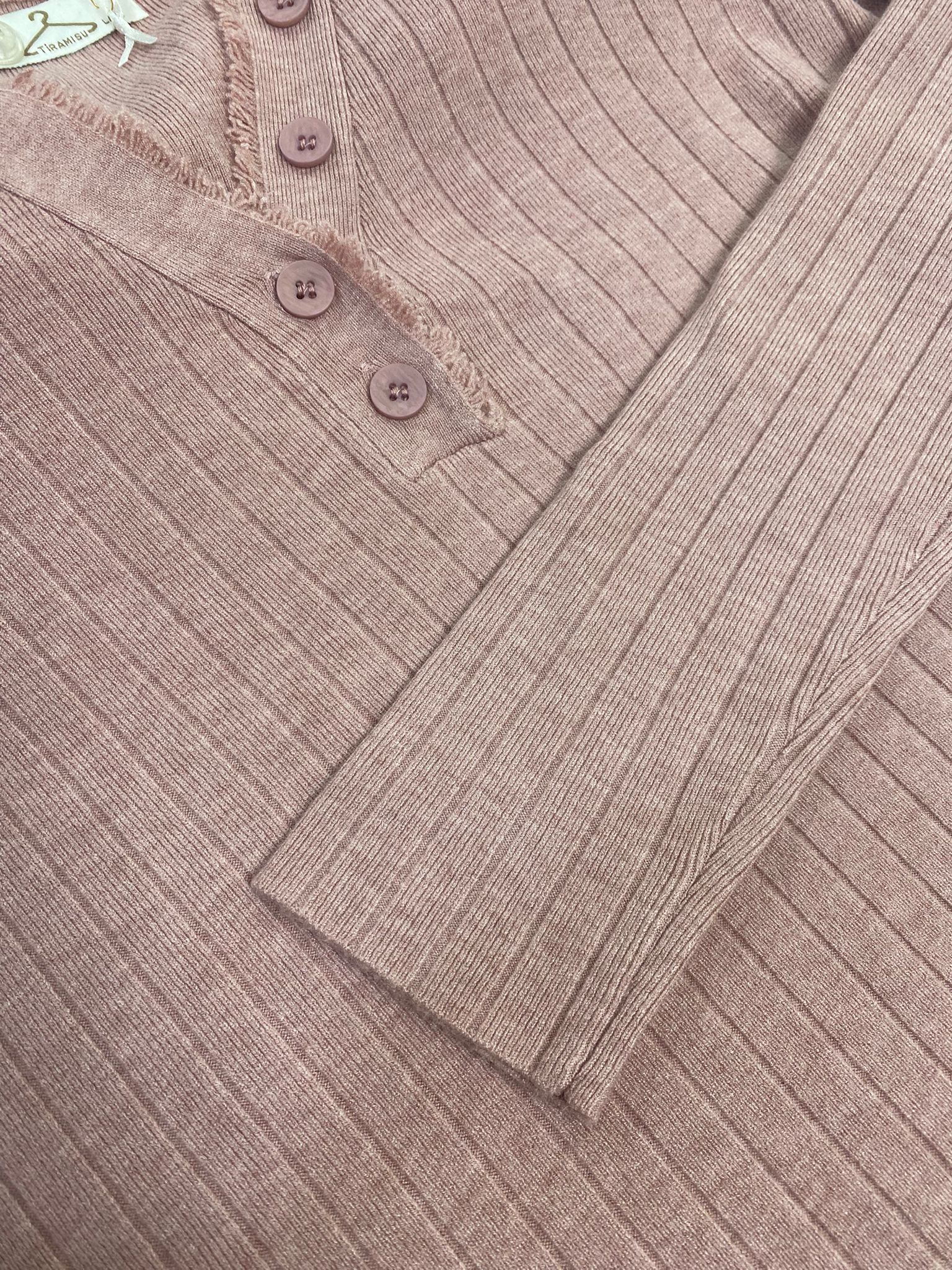 Suéter de punto de canalé que combina comodidad y estilo. Manga larga y cuello con escote en pico abotonado, adornado con un detalle desflecado que le da un toque desenfadado y moderno.