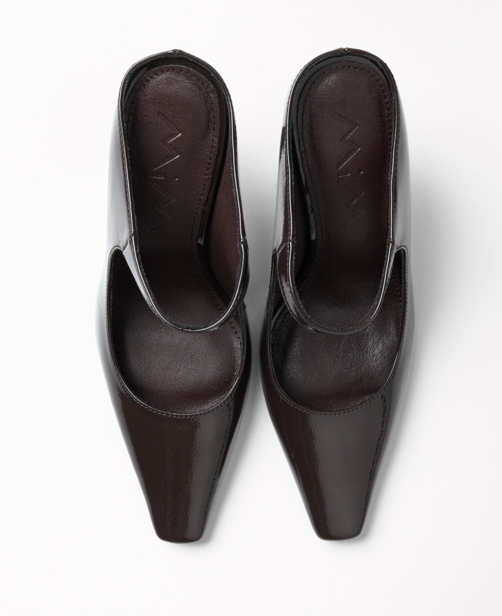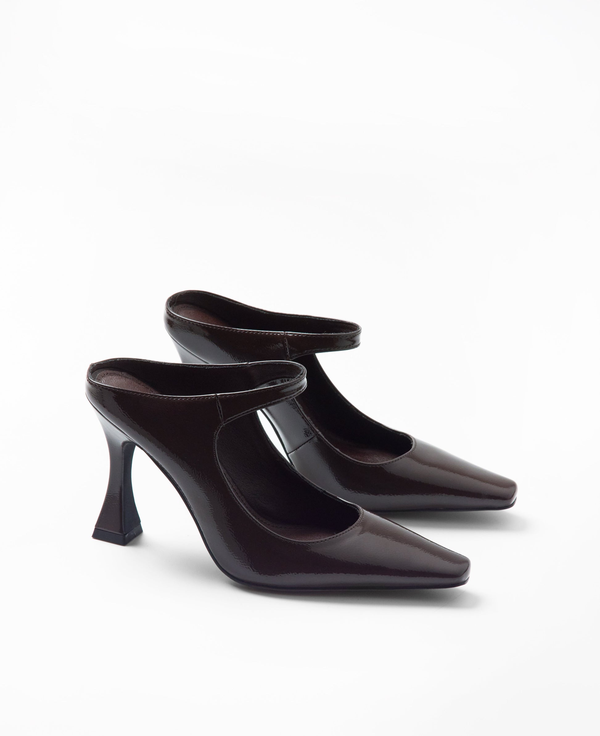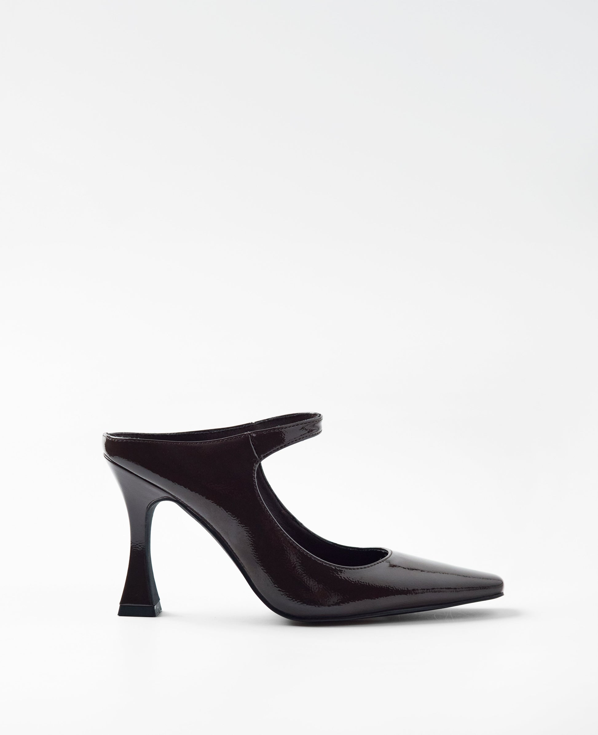 Zapato de tacón cerrado con parte delantera en punta color chocolate efecto charol. Parte trasera destalonada con tira en el empeine para la sujeción.