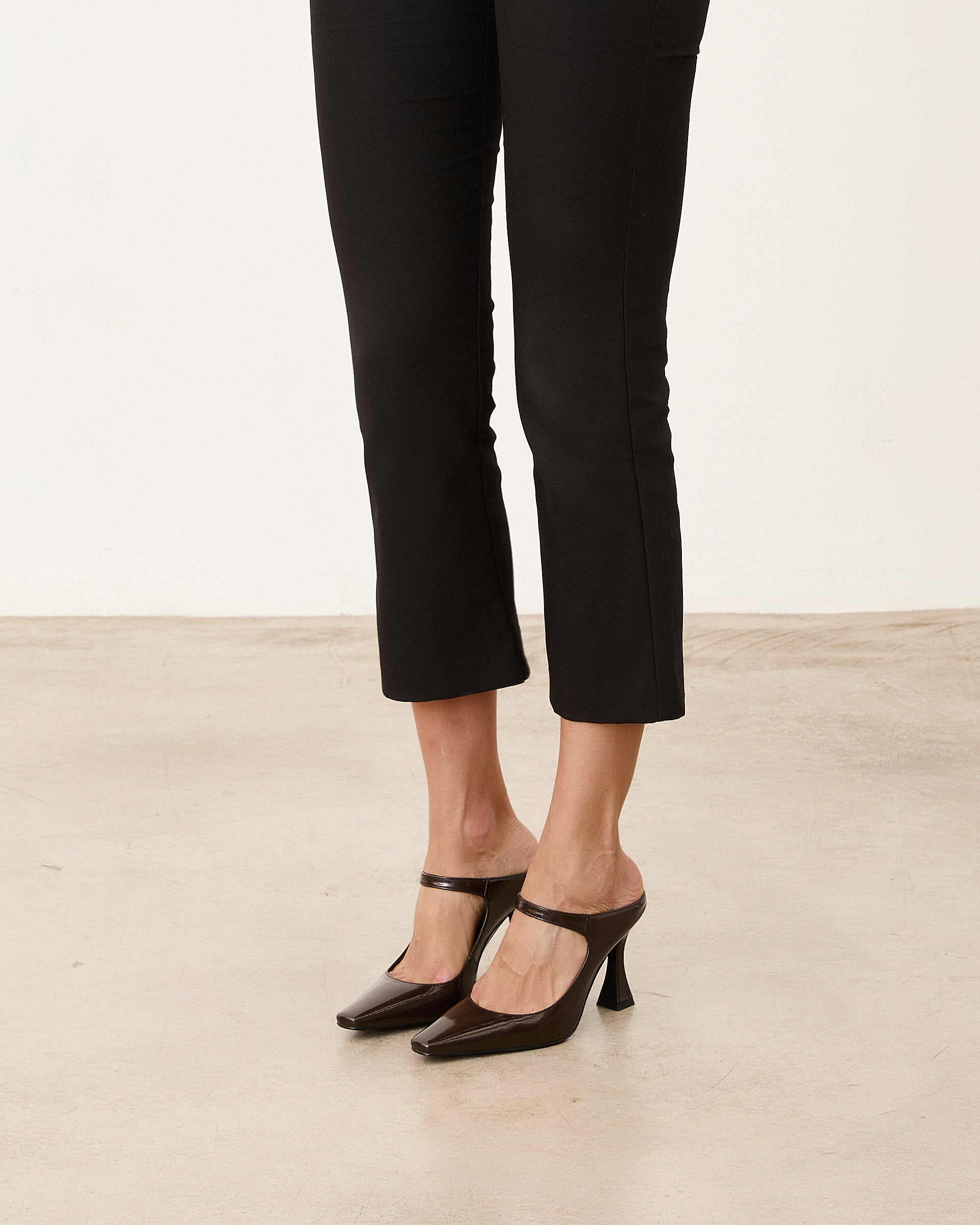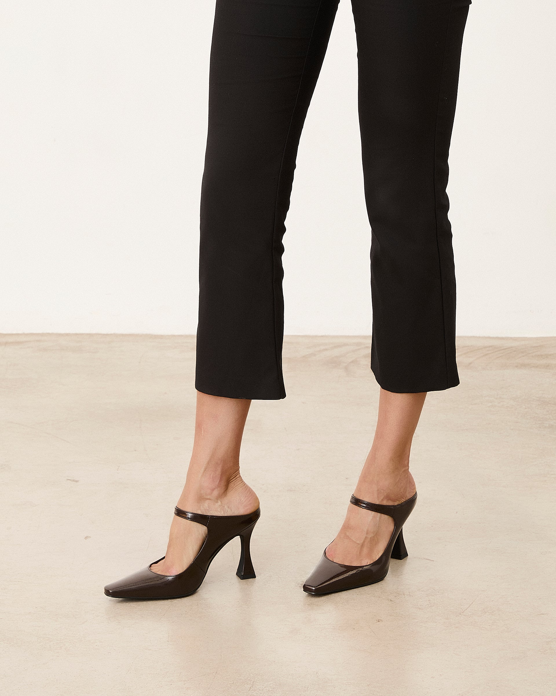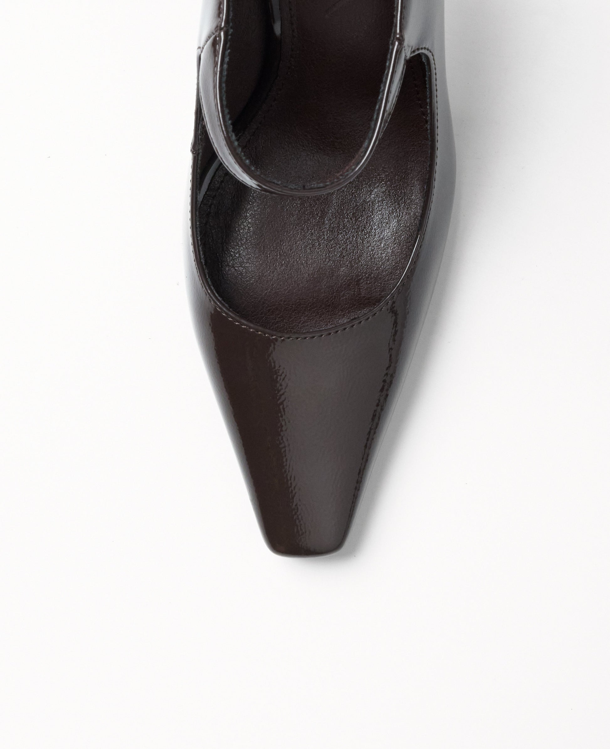 Zapato de tacón cerrado con parte delantera en punta color chocolate efecto charol. Parte trasera destalonada con tira en el empeine para la sujeción.